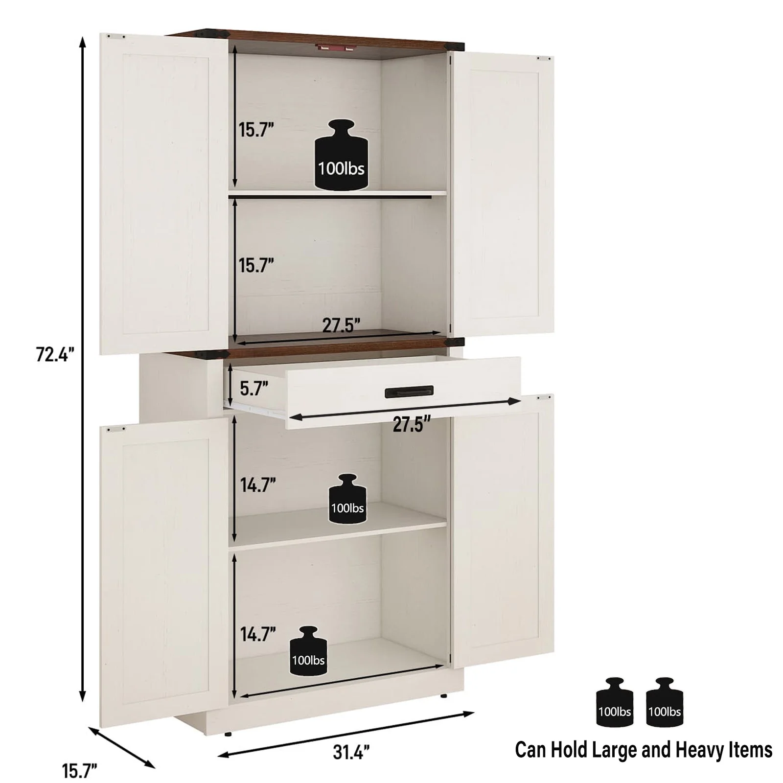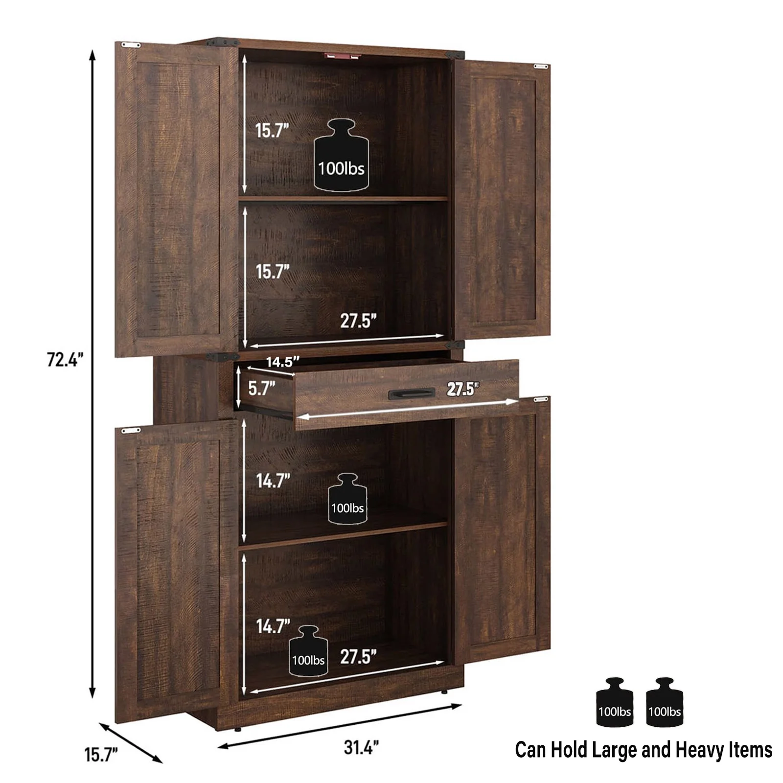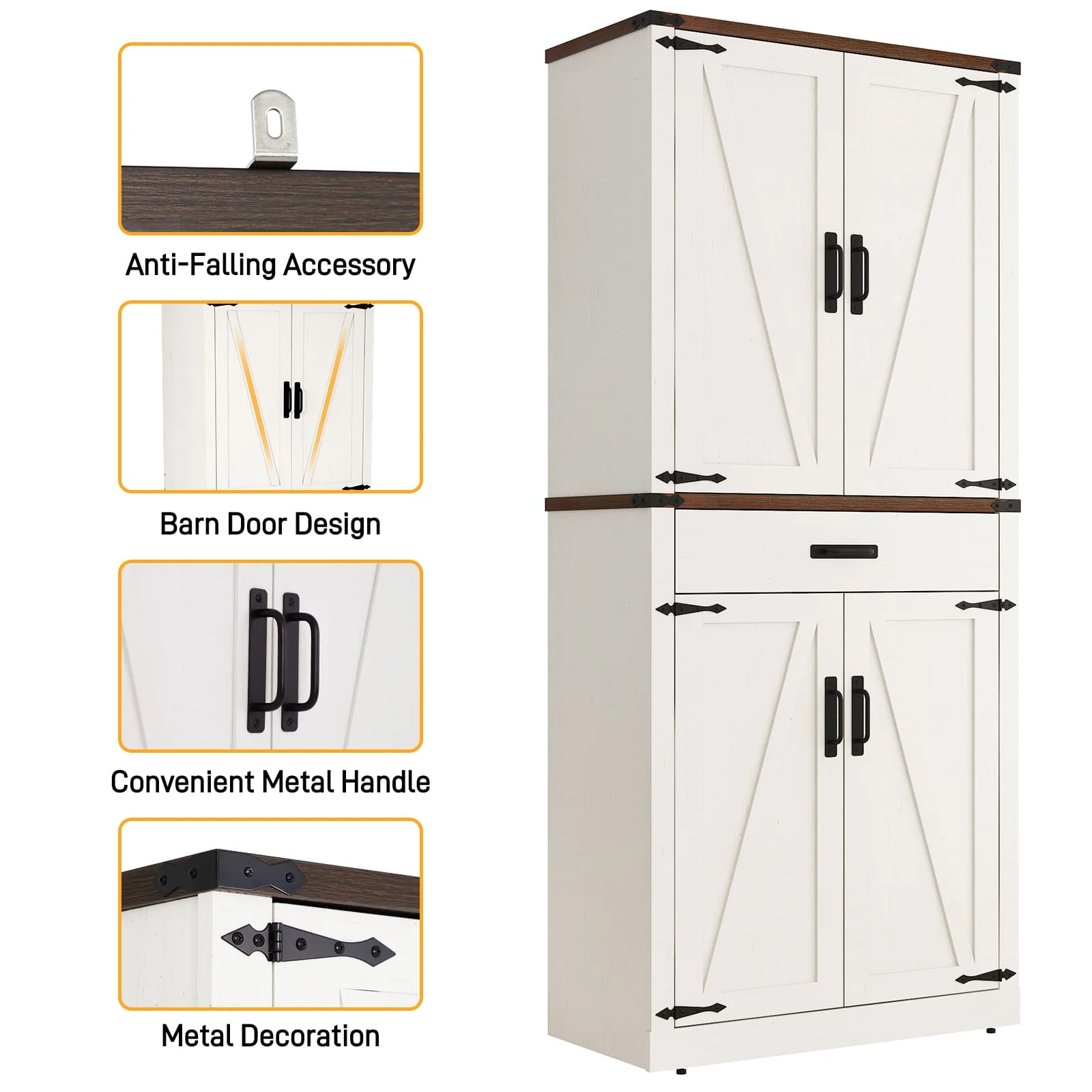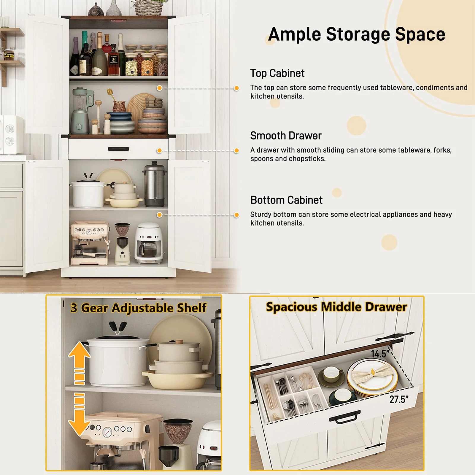 Roomy Storage Space: 72-inch tall pantry design with 4-level storage sapce and 1 drawer. Storage Shelves can 3 level height adjustable and great store diffenernt height of things like spice jars, snacks, drinks, food, plates, and various bottles and cans. Middle large storage drawer can store forks, utensils and dinnerware that is easy to take at hand. Sturdy bottom cabinet suit for store small appliances and some cookwares for a clean and tidy kitchen.