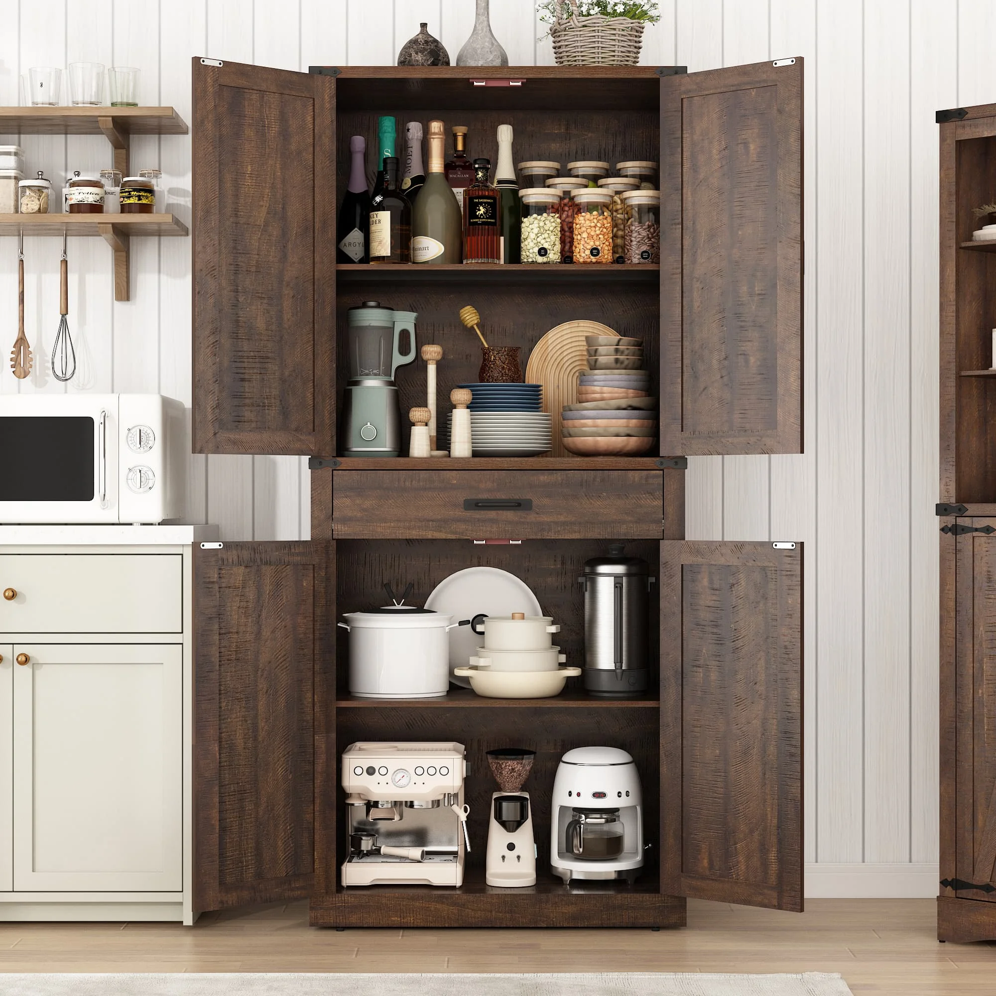 72" Tall Farmhouse Pantry Cabinet - Versatile Storage Cabinet with Adjustable Shelves & Drawer for Dining Room, Bathroom, Utility Room