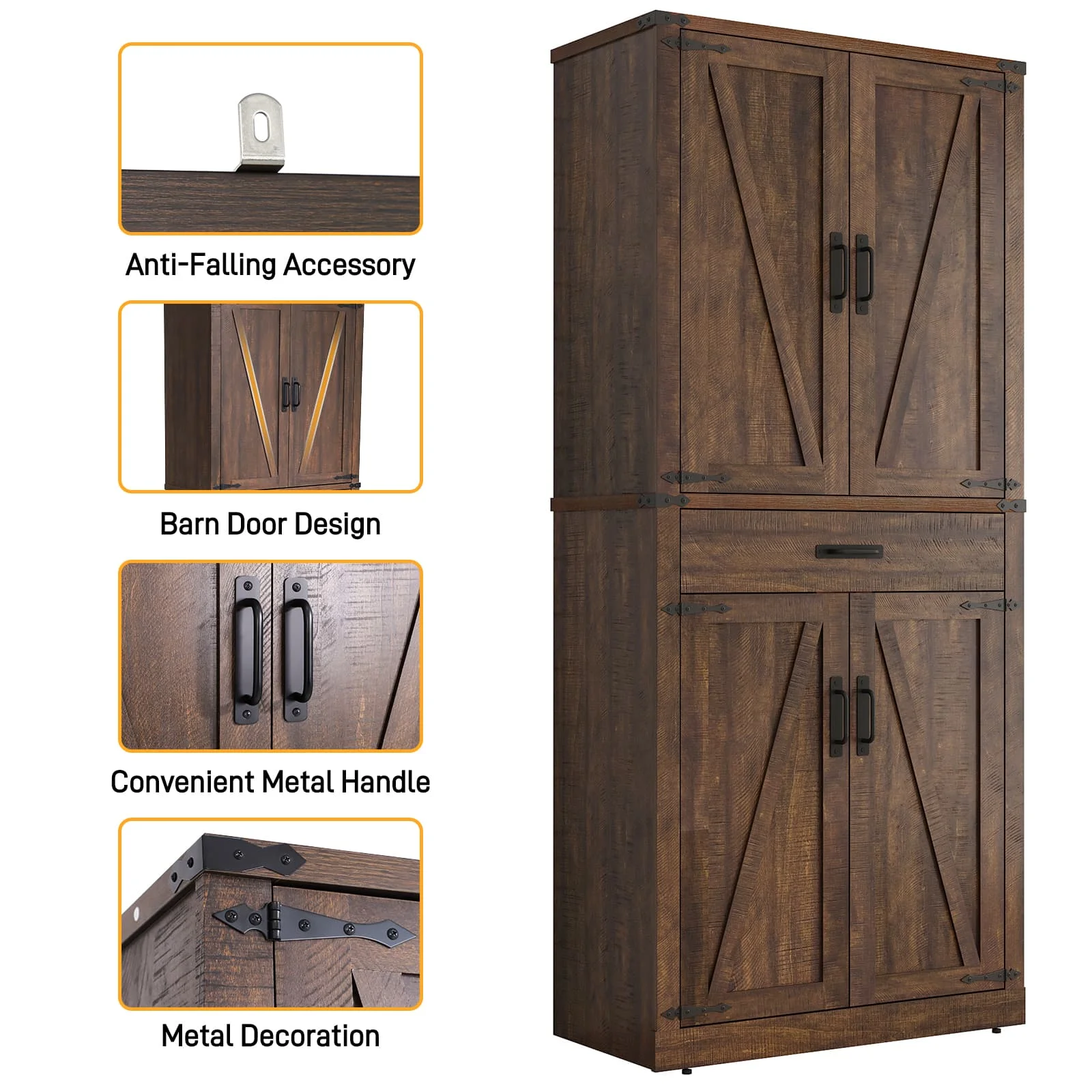Farmhouse Kitchen Pantry: Our farmhouse style kitchen pantry cabinet features a unique rustic wood grain finish with metal trim and handles. A great blend of farmhouse style and modernity, adding a beautiful, elegant touch to your home. 72 inch tall farmhouse storage cabinet can fit well in any space in your home and match with different styles of furniture.