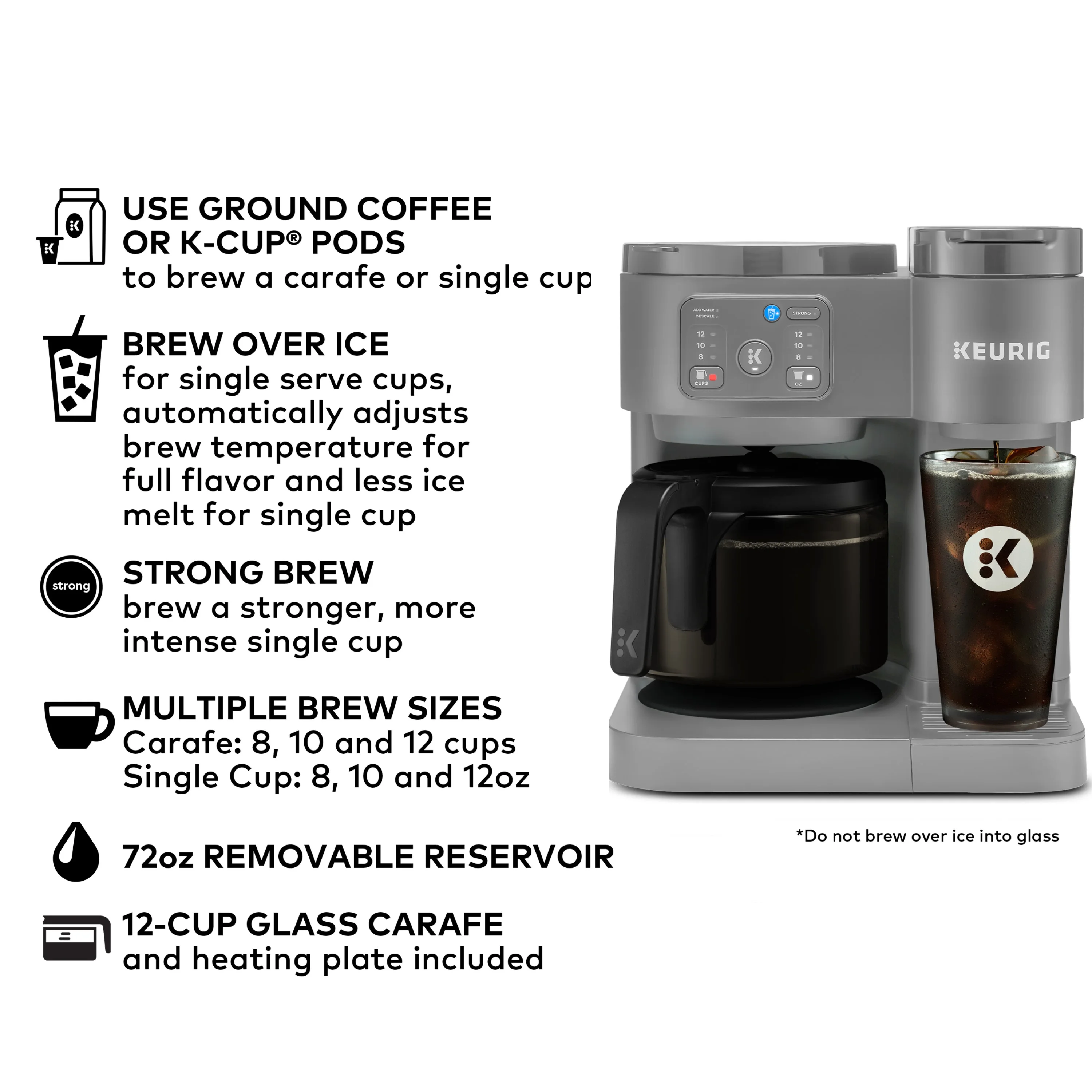 - BREW OVER ICE: Adjusts temperature for maximum flavor and less ice melt for iced coffees and teas.