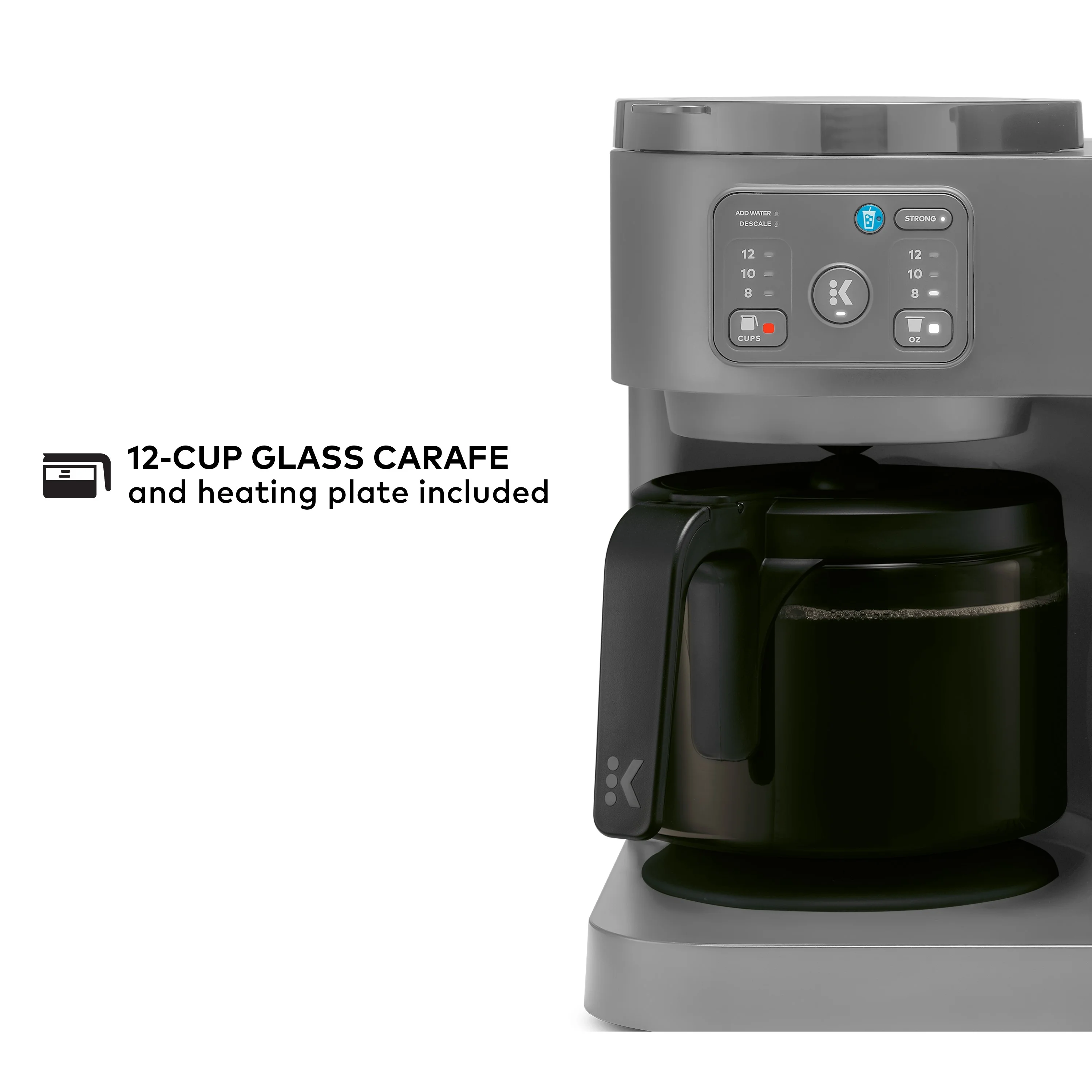 - 12-CUP GLASS CARAFE: Included with brewer, along with heating plate to keep fresh coffee hot.