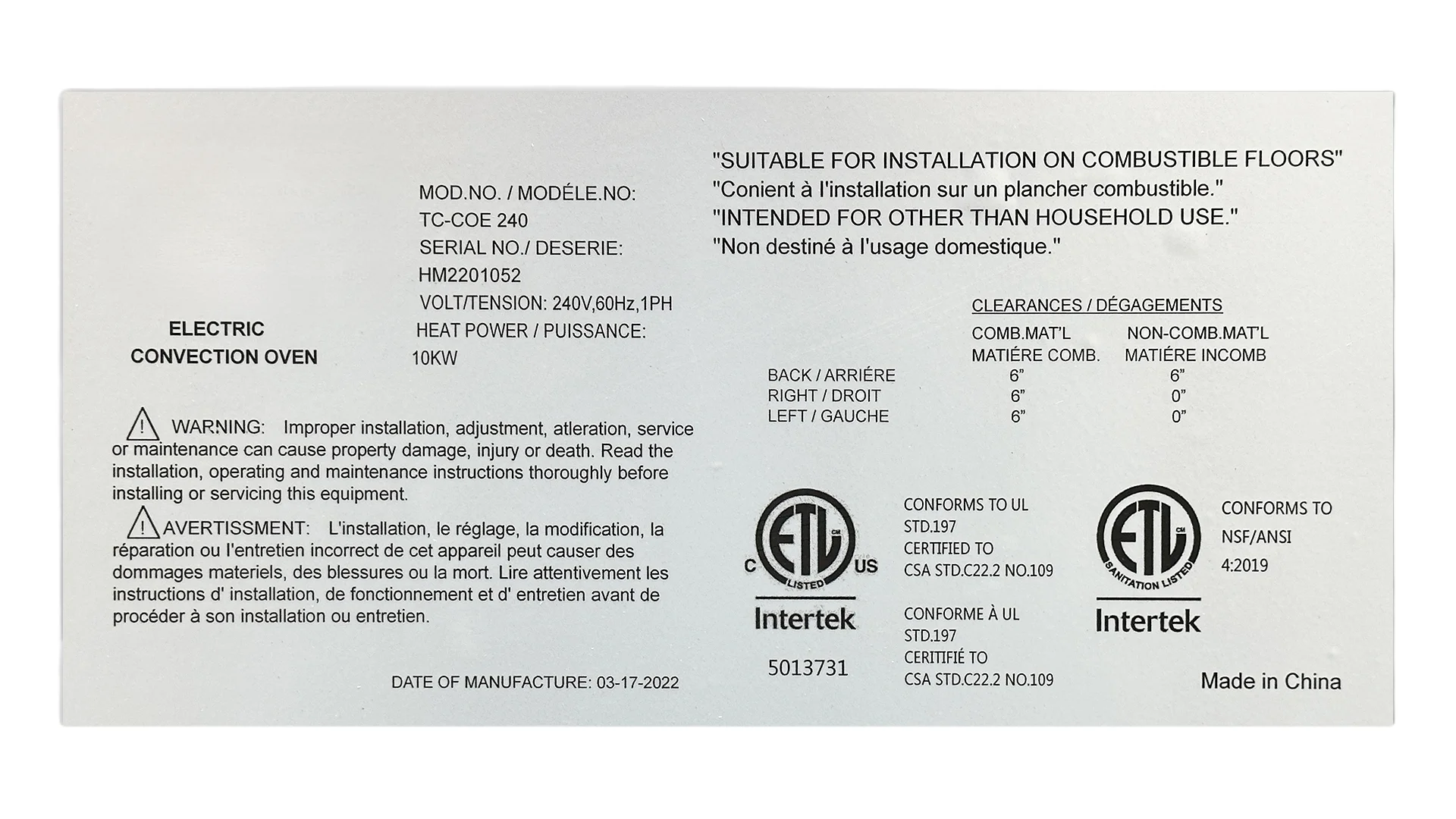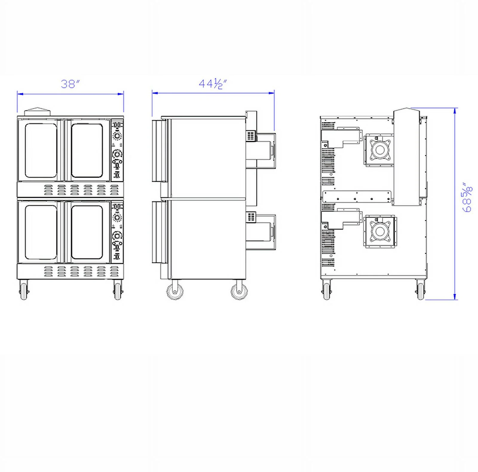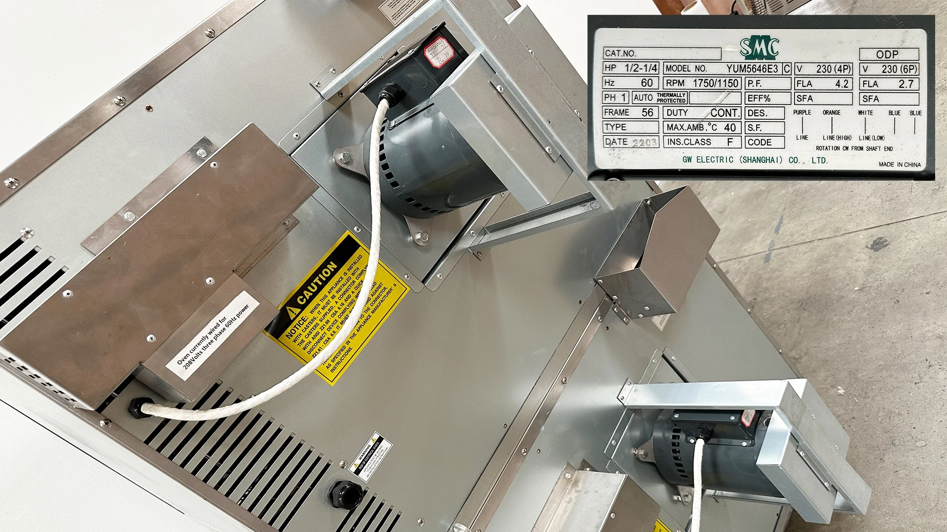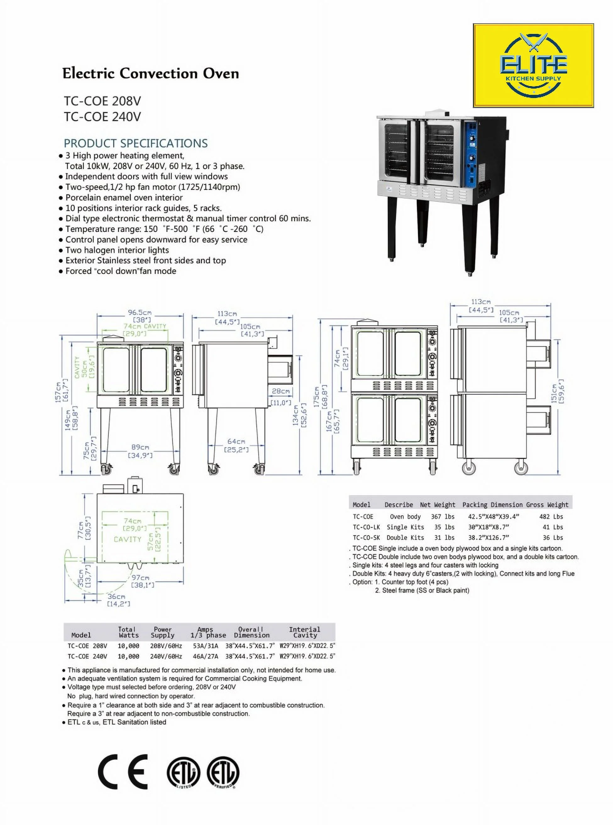 - 3 High-power heating element Total 10kW,208V or 240V, 60Hz,1 or 3 phaseIndependent doors with full-view windowsTwo speed,1/2 hp fan motor(1725/1140rpm)Temperature range: 150°F-500°F(66°C-260°C)Forced "cool down" fan mode