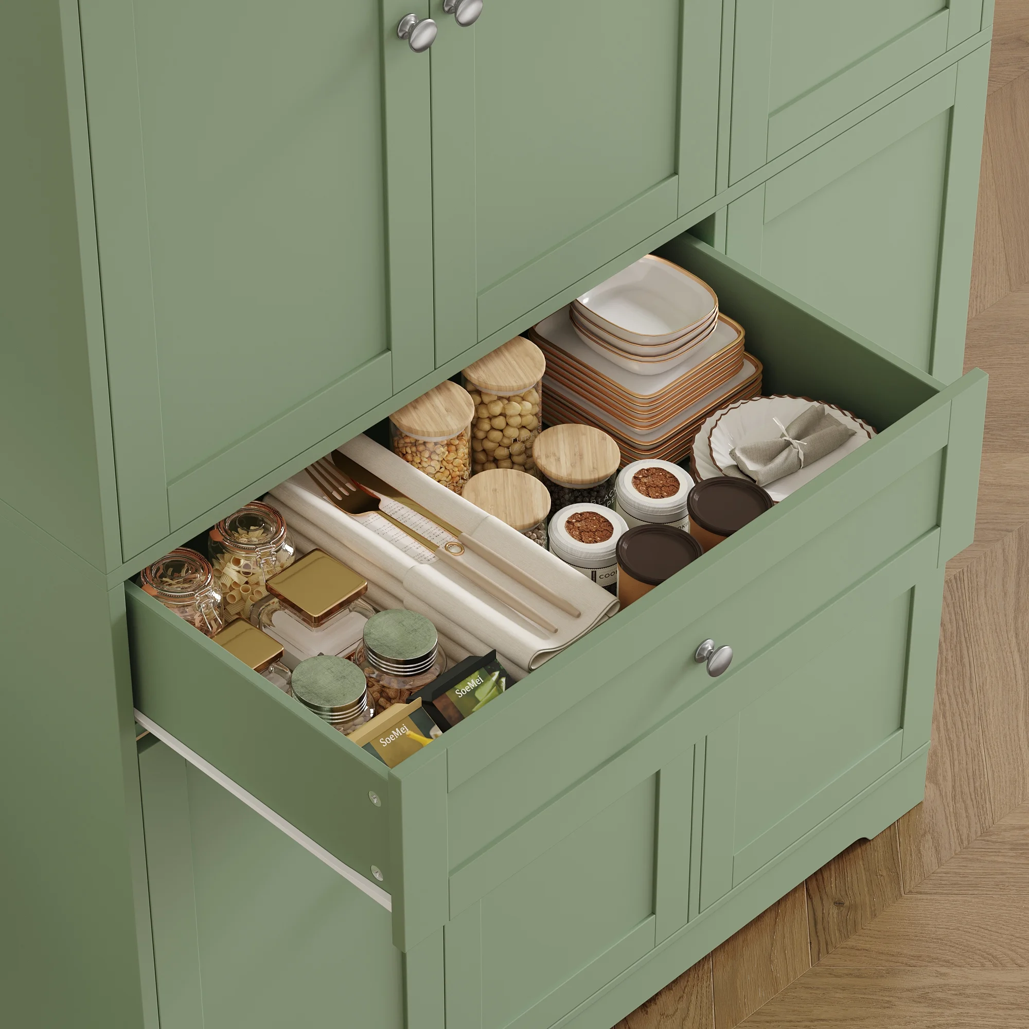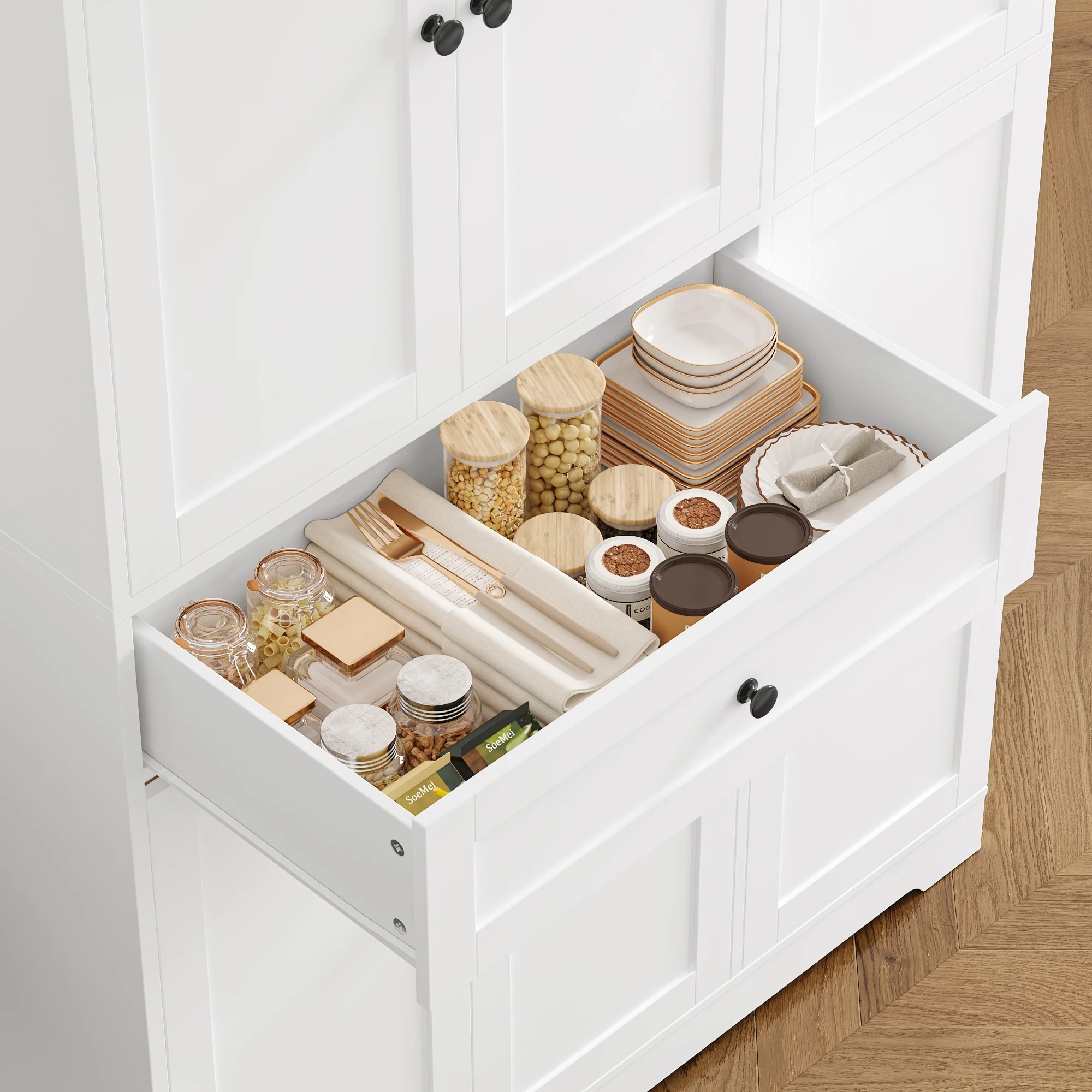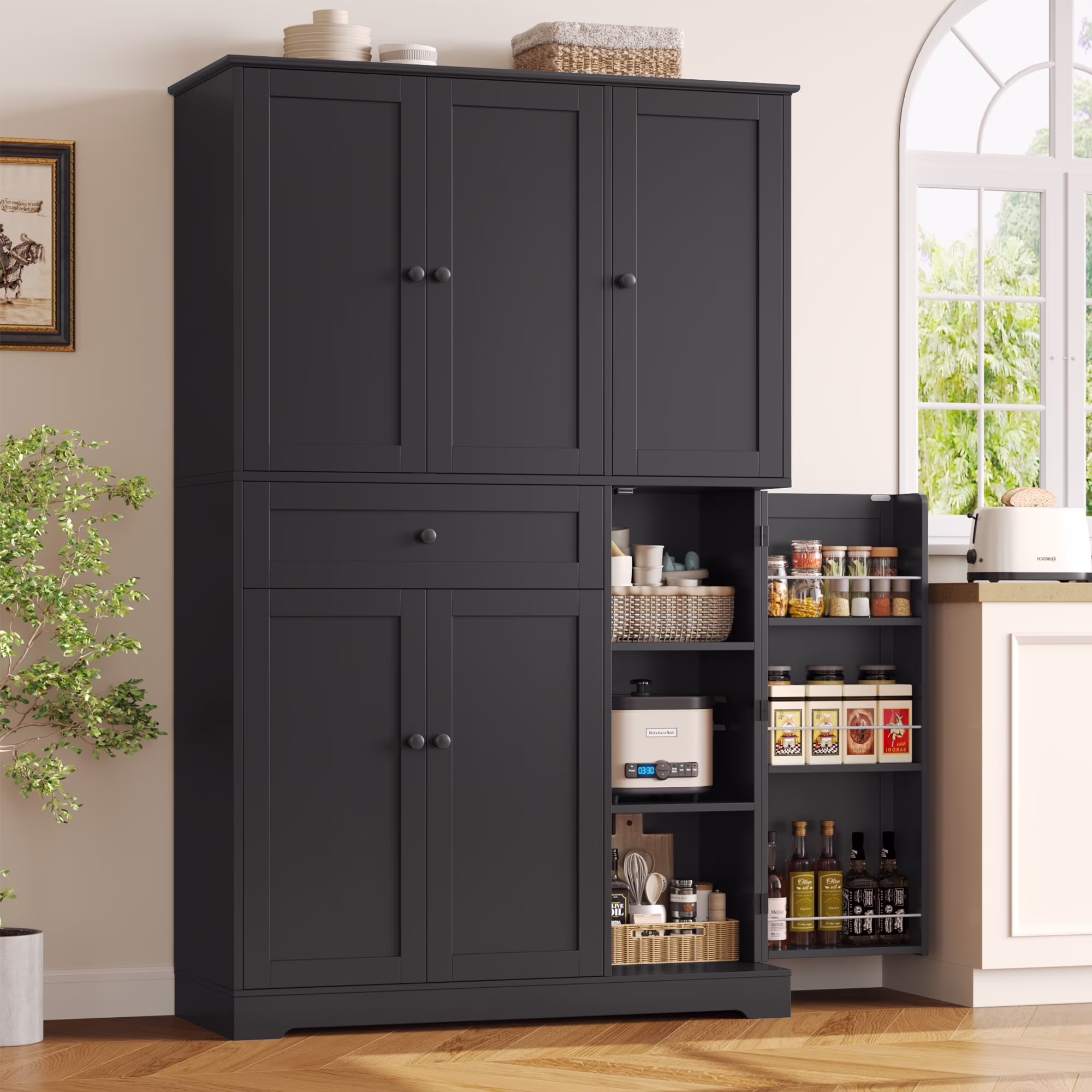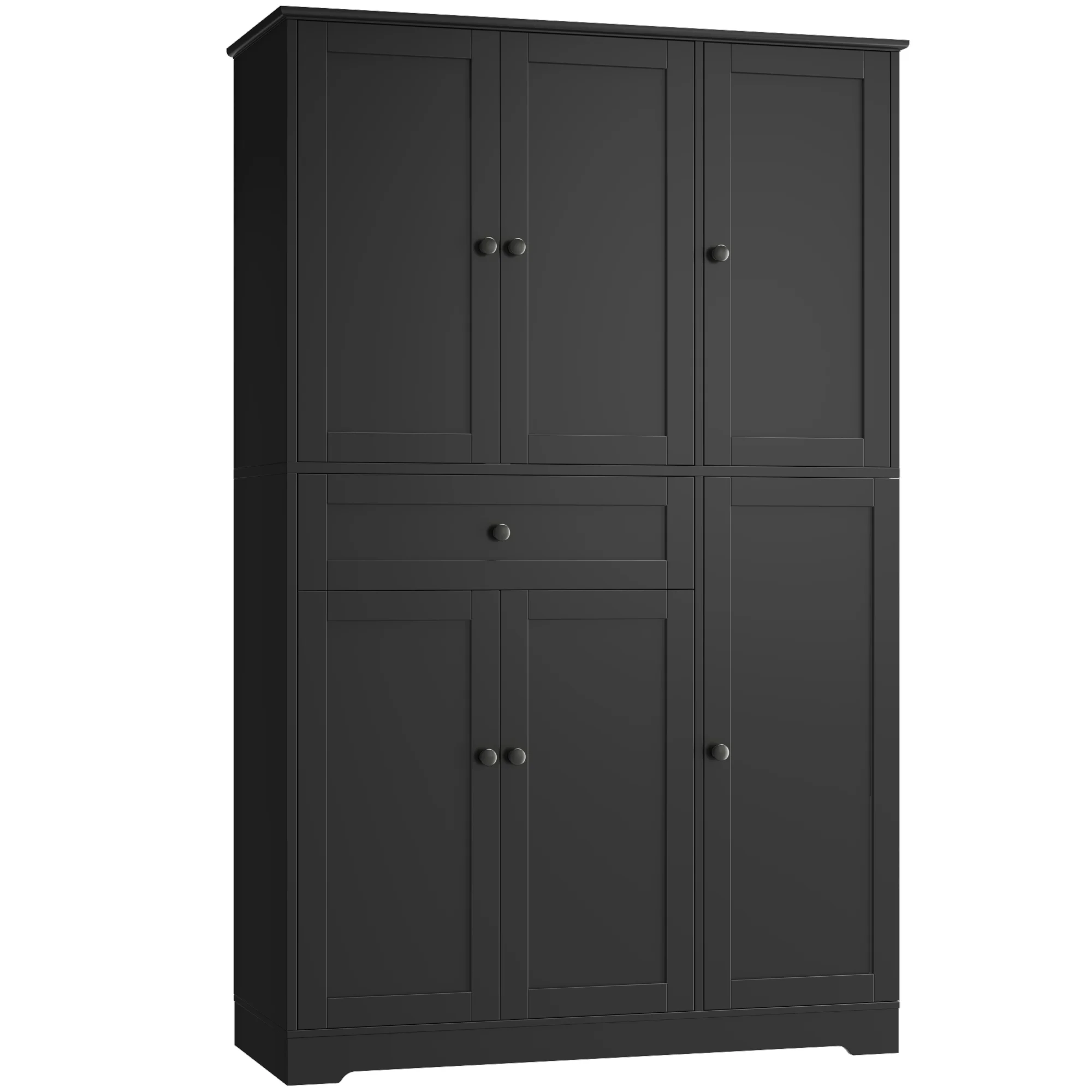 Made of high-quality MDF, the kitchen pantry storage cabinet with drawer is easy to clean, scratch-resistant, durable, and comes with black knobs for a classic look. This freestanding pantry cabinet has 12 storage racks and 1 drawer, 3 of which are mounted on the door. From large cookware and fine tableware to spice bottles and kitchen odds and ends, you will have everything you need to keep your kitchen tidy. In addition to this, the sturdy structure combined with anti-tip accessories ensures that the tall 6-door cupboard is safe and stable.