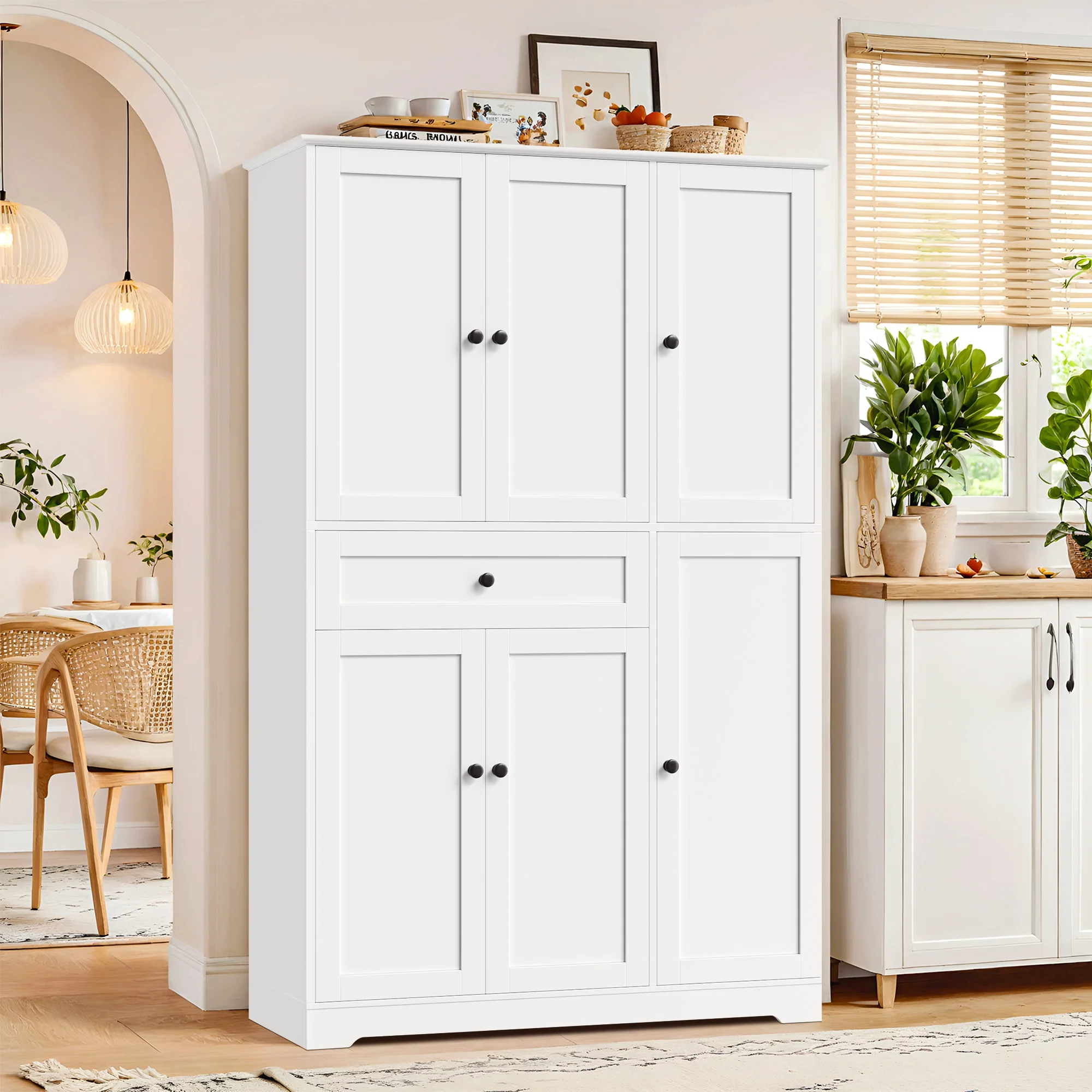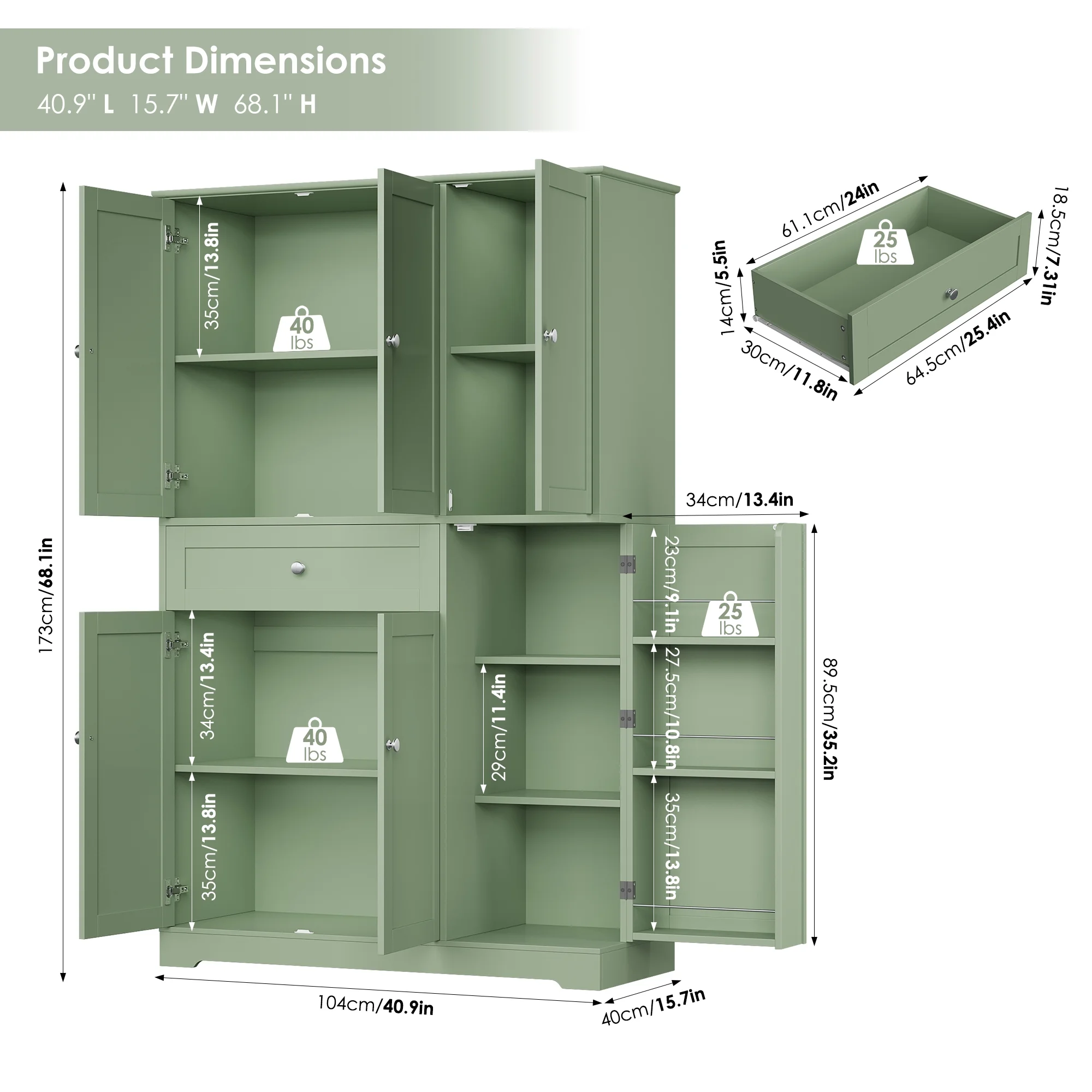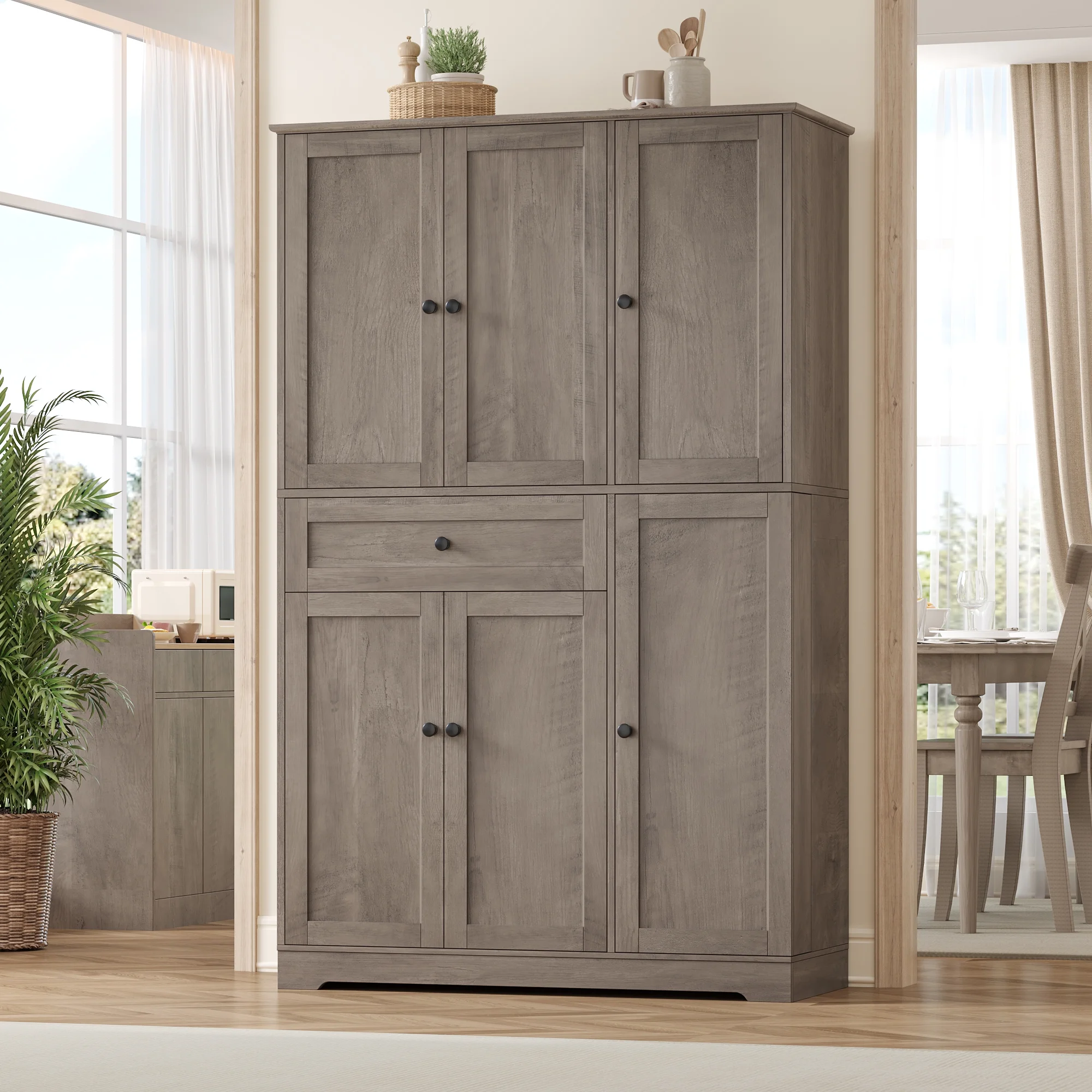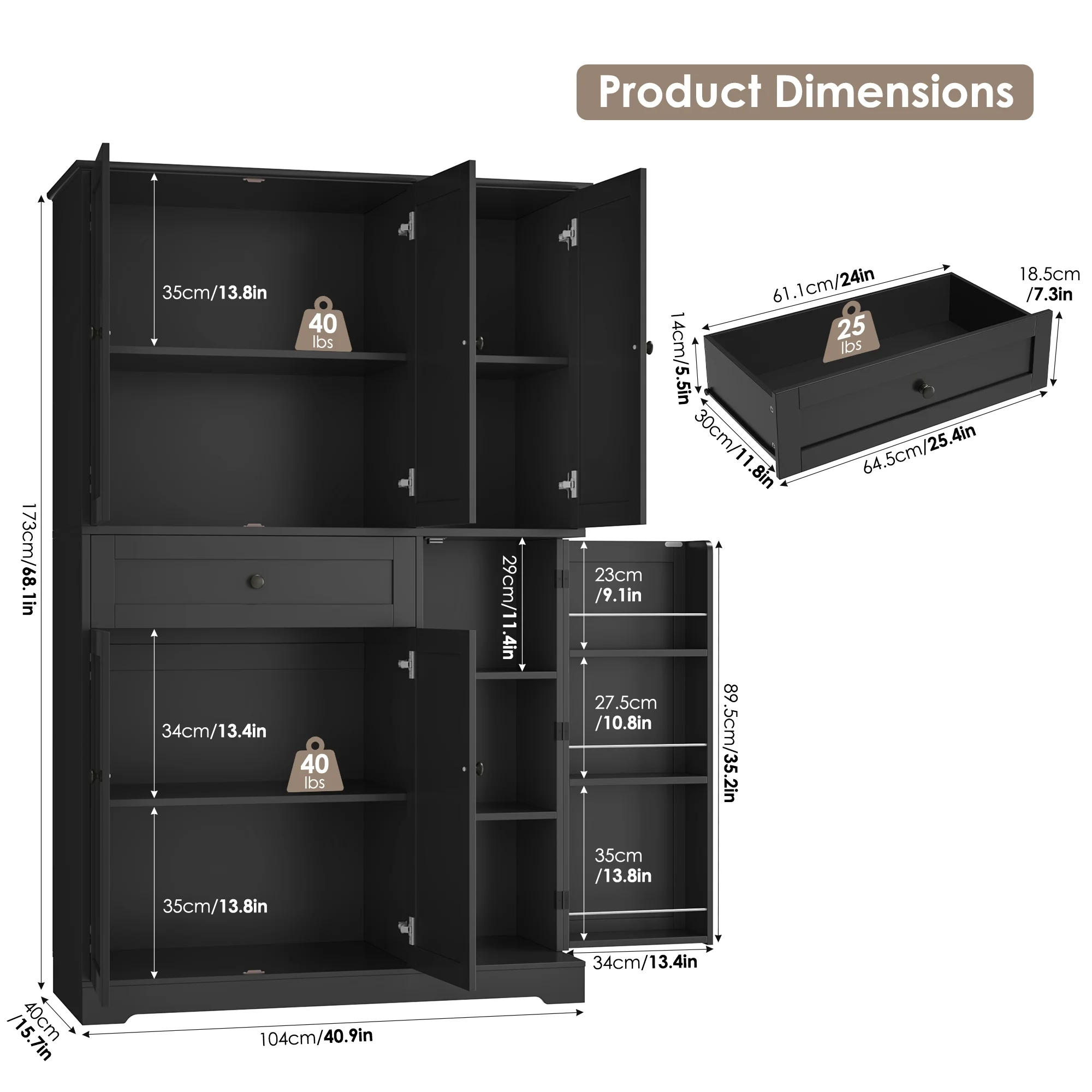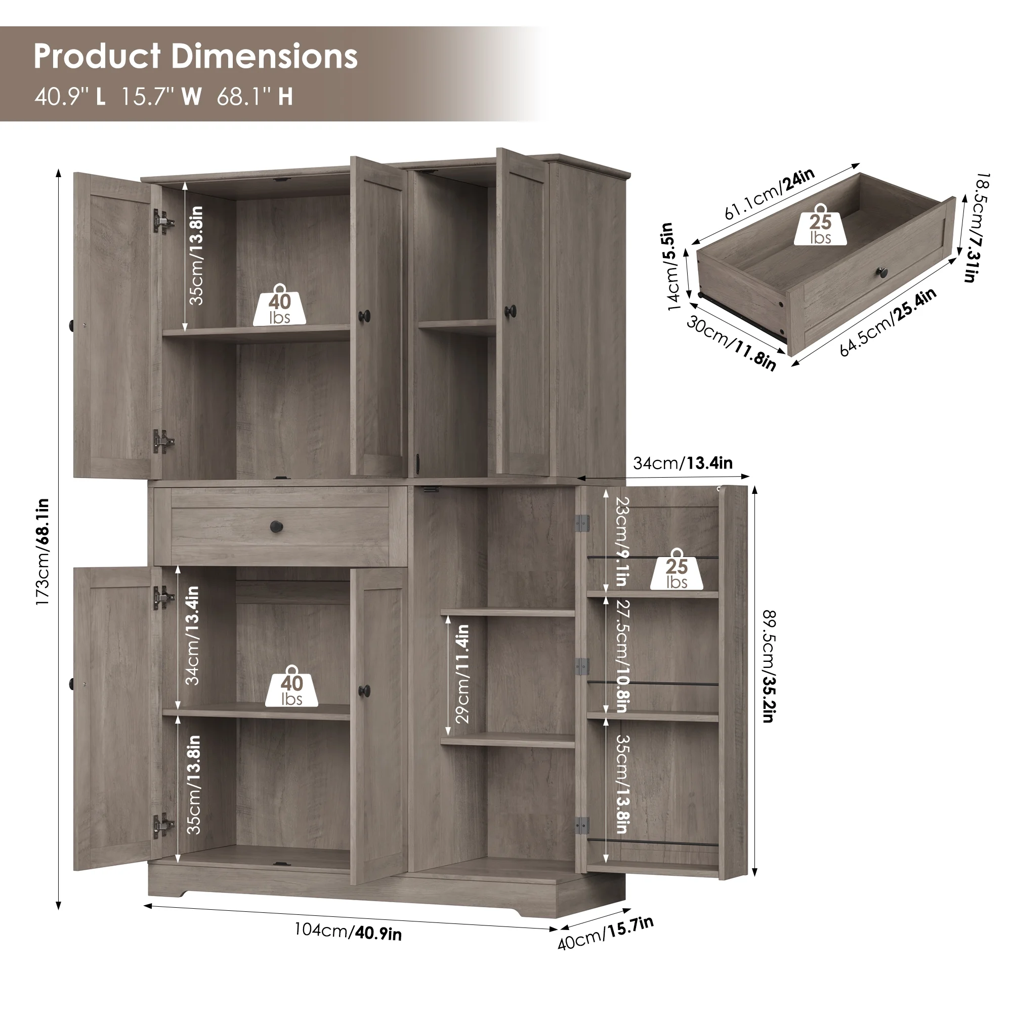The Kitchen Pantry Cabinet has 6 tightly closing doors and 1 drawer to keep your food and snacks away from moisture and safe for consumption while providing a versatile storage solution for your kitchen and dining room.Whether it's a family gathering, a buffet, or daily dining, this tall food pantry cabinet is an ideal choice to enhance the quality of life. Dimensions: 68.1''H x 40.9''W x 15.7''D.