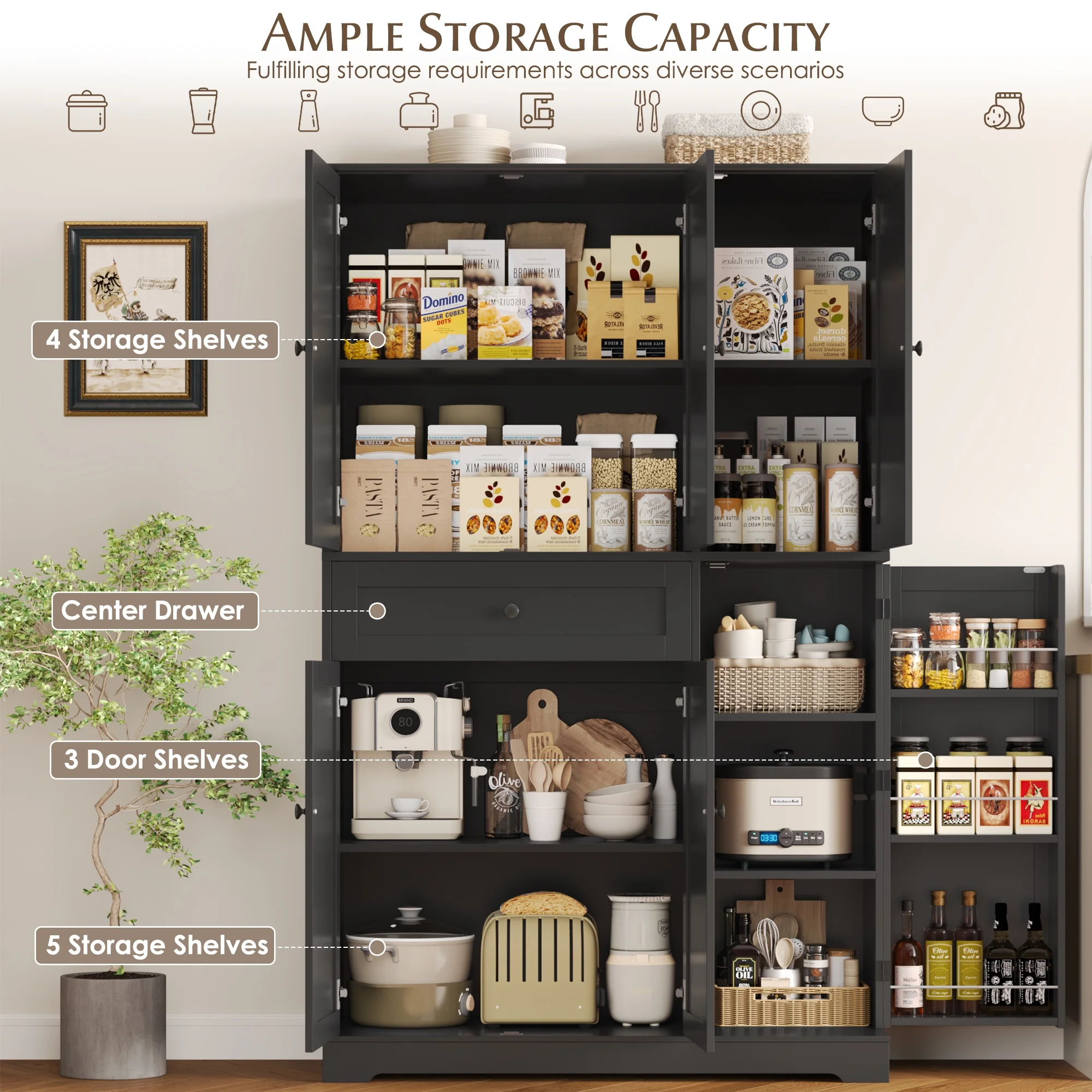 - ��Ample Storage Capacity��The kitchen pantry storage cabinet has 1 large center drawer and 12 shelves, perfect for storing food, small appliances, and kitchen supplies. The large center drawer in the middle can hold your favorite cutlery.