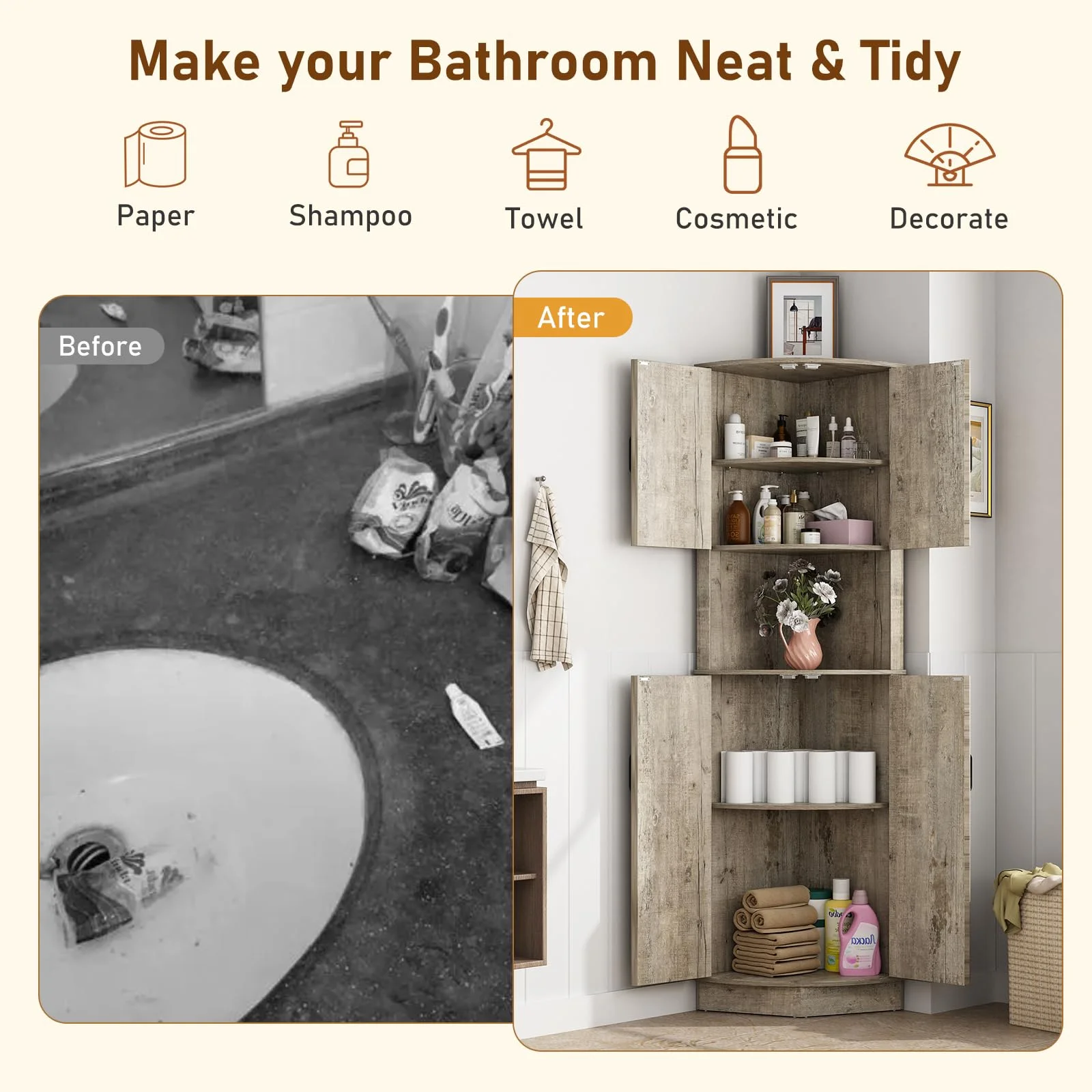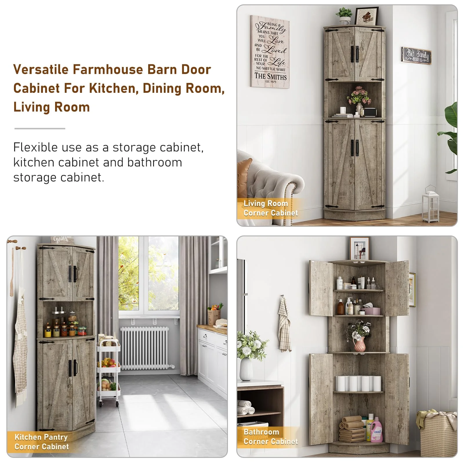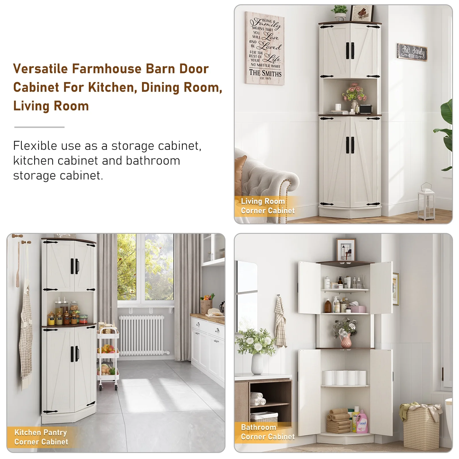Easy to Assemble: The tall storage cabinet with doors package includes step-by-step instructions and all the hardware, and all parts and accessories are labeled. With an easy-to-follow instructions manual and only taking 30 minutes to assemble you can get a beautiful farmhouse bathroom corner storage cabinet/kitchen cabinet/living room tall corner cabinet!