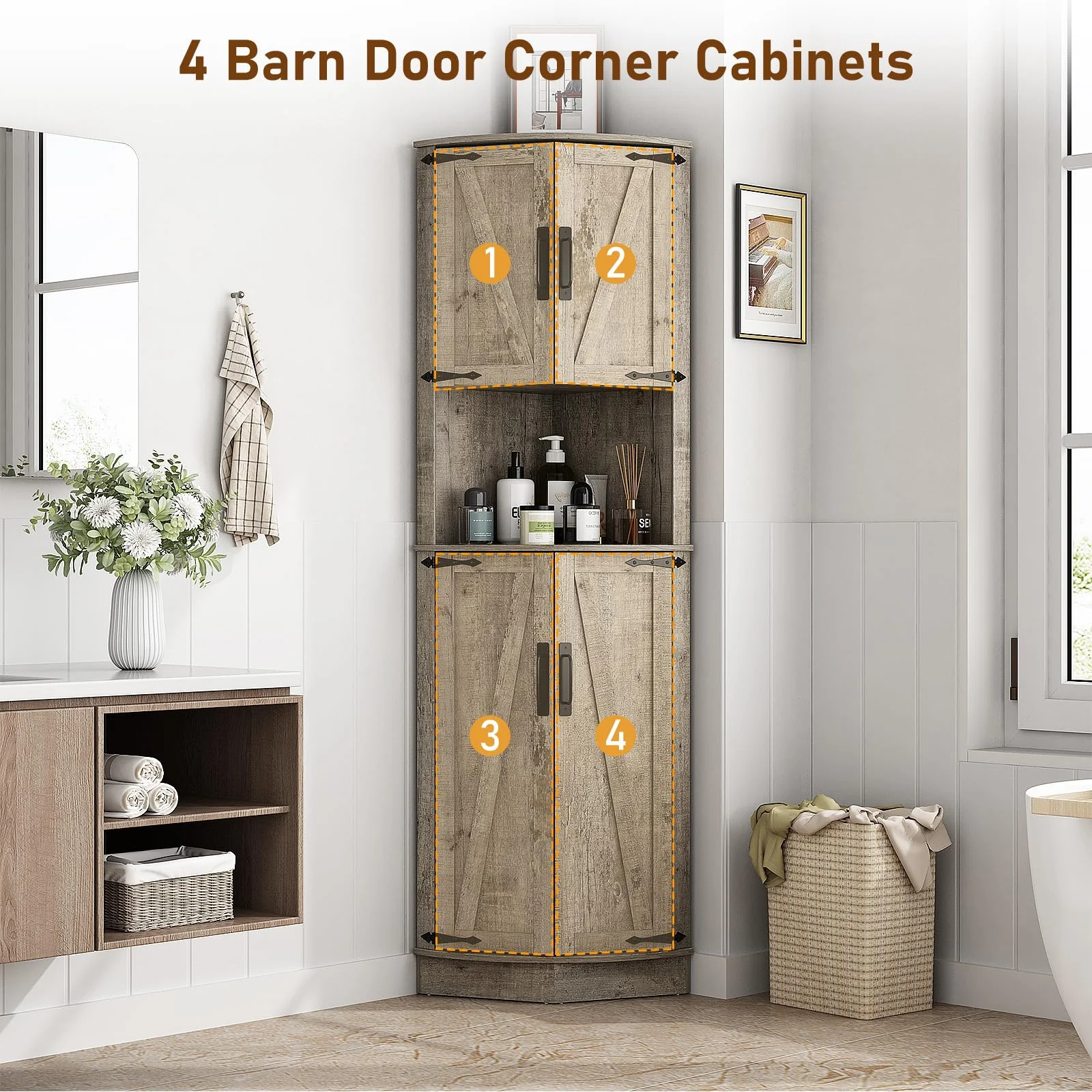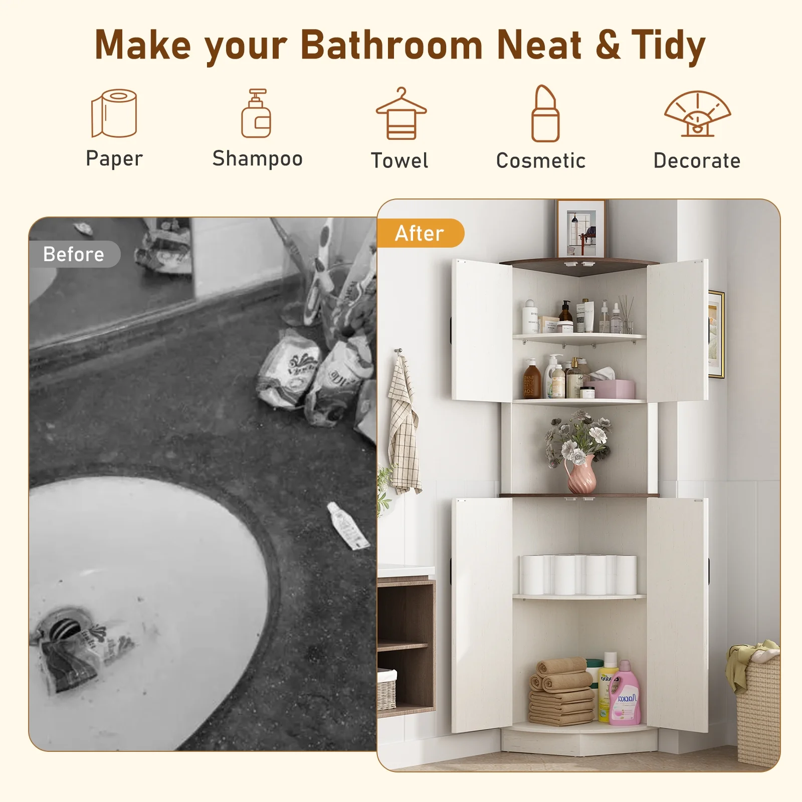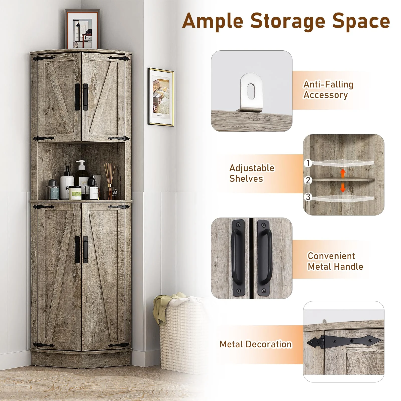 Easy to Assemble: The tall storage cabinet with doors package includes step-by-step instructions and all the hardware, and all parts and accessories are labeled. With an easy-to-follow instructions manual and only taking 30 minutes to assemble you can get a beautiful farmhouse bathroom corner storage cabinet/kitchen cabinet/living room tall corner cabinet!