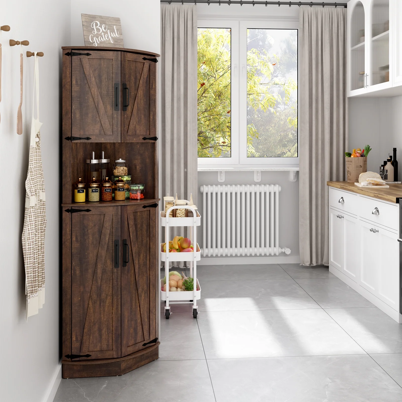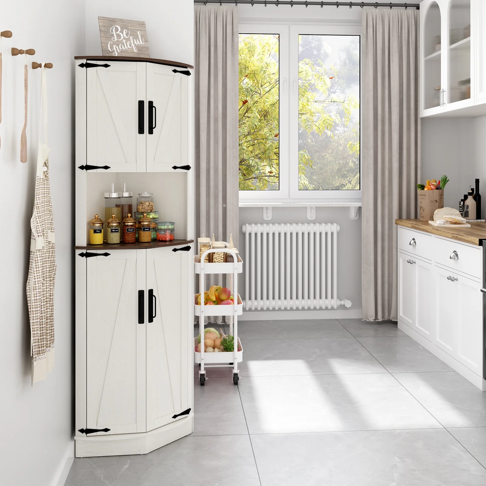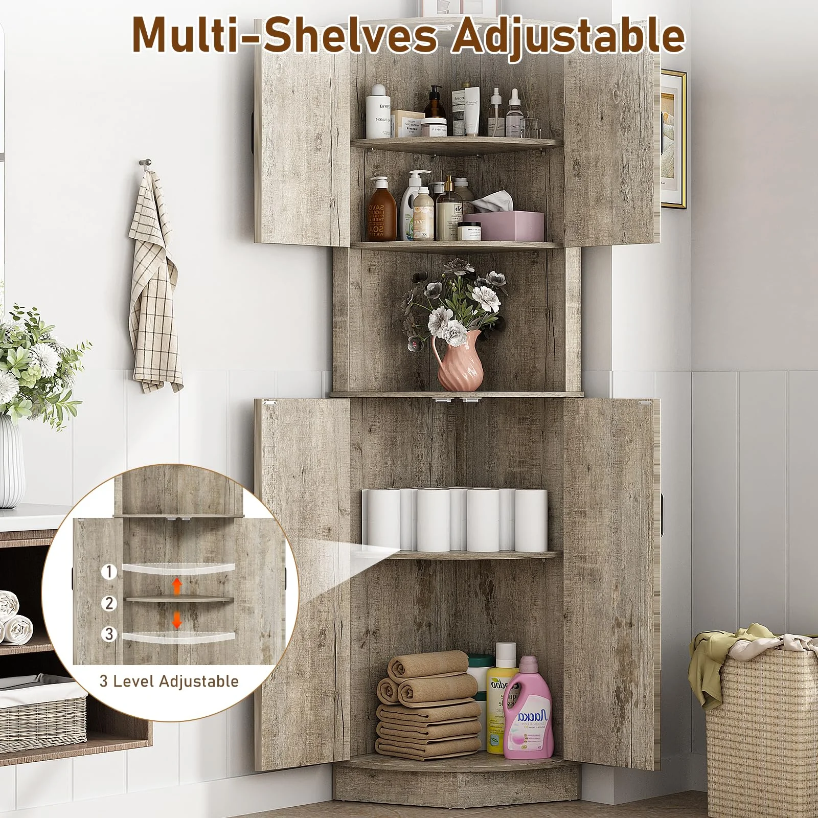 More Storage Space: This corner pantry cabinet adopts an upgraded fan-shaped design, increasing more storage space to meet your more storage needs. And is very suited for small corner spaces and could make the most of those underutilized. It includes 1 open display storage space and 2 closed storage spaces. 4 of the spaces have adjustable and detachable shelves that can adjust height according to different storage needs for more hidden storage space.
