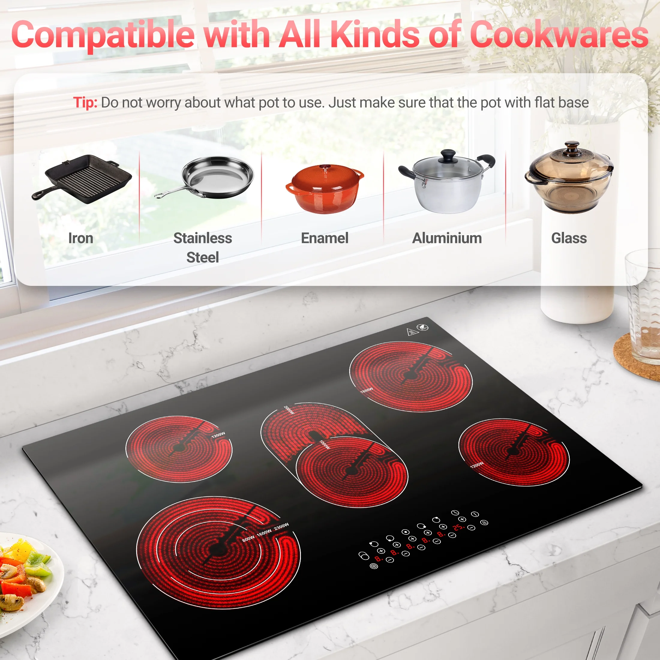 - 🍳【COMPATIBLE WITH ANY COOKWARE�?/b> The 30 inch cooktop is a electric ceramic cooktop, which is very convenient that compatible with any cookware. All cookware with a flat bottom, such as iron, aluminum, stainless steel, and glass cookware are suitable for use. 8400W High power cooktop heat up more quickly. 5 burners can be used at the same time, saving a lot of time, making it easy to handle multi-person parties.