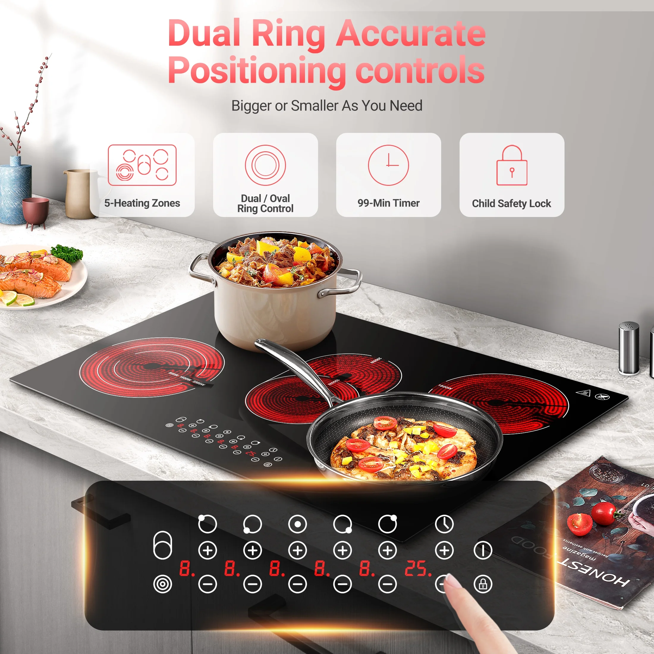 - 🍳�?9 MINUTES TIMER, AUTOMATIC SHUTDOWN�?/b>The 5 burner cooktop has a timer function which range is 1-99 minutes. If you suddenly have something urgent to do while cooking, you can set the timer automatically shut down the cooktop stove electric when the countdown is reached. This 30 in electric cooktop also has a pause function, if you suddenly want to go to the toilet or listen to a call, you can use this pause function. The electric cooktop also features some merits such as a safety lock, high temperature indicator and an Auto Safety Switch Off.