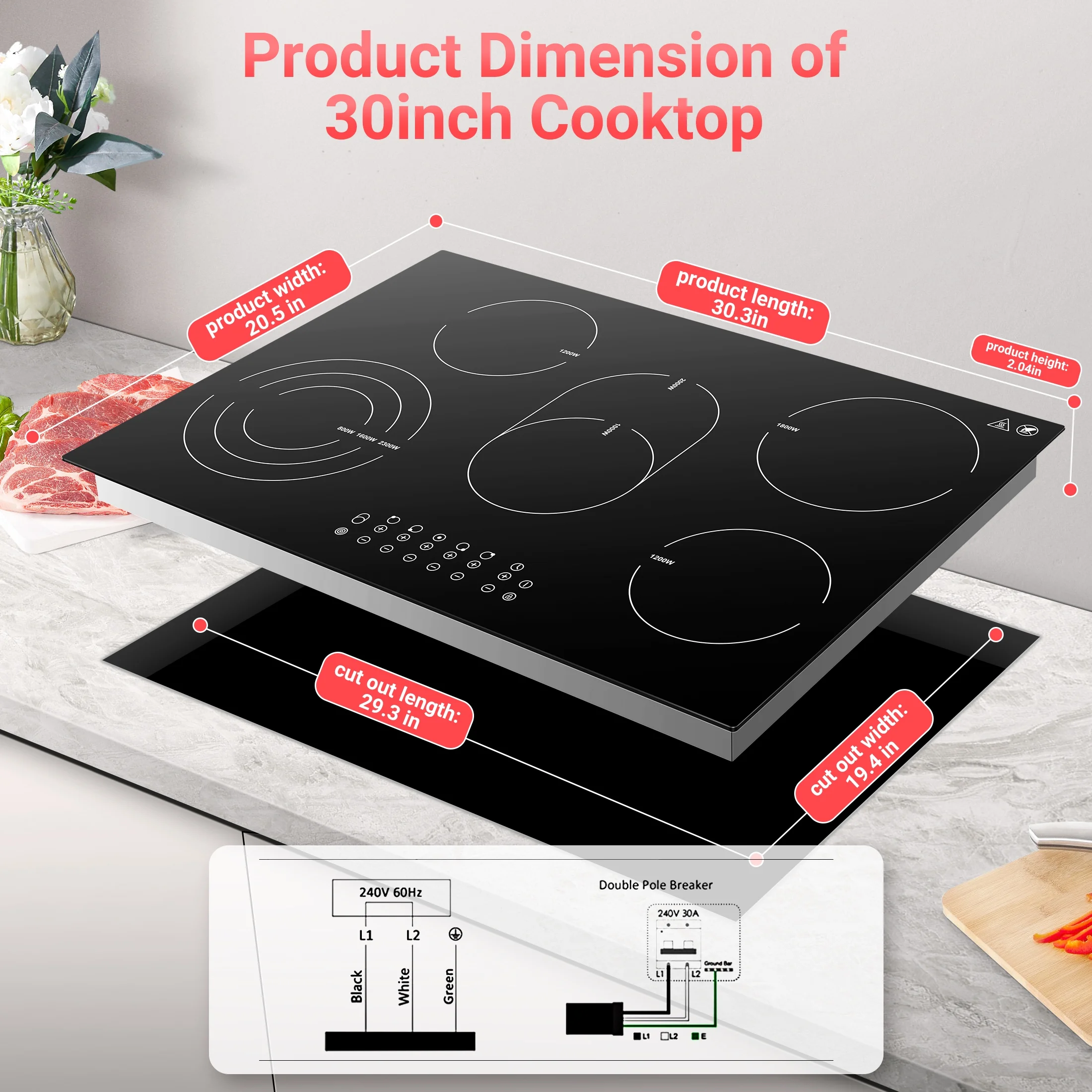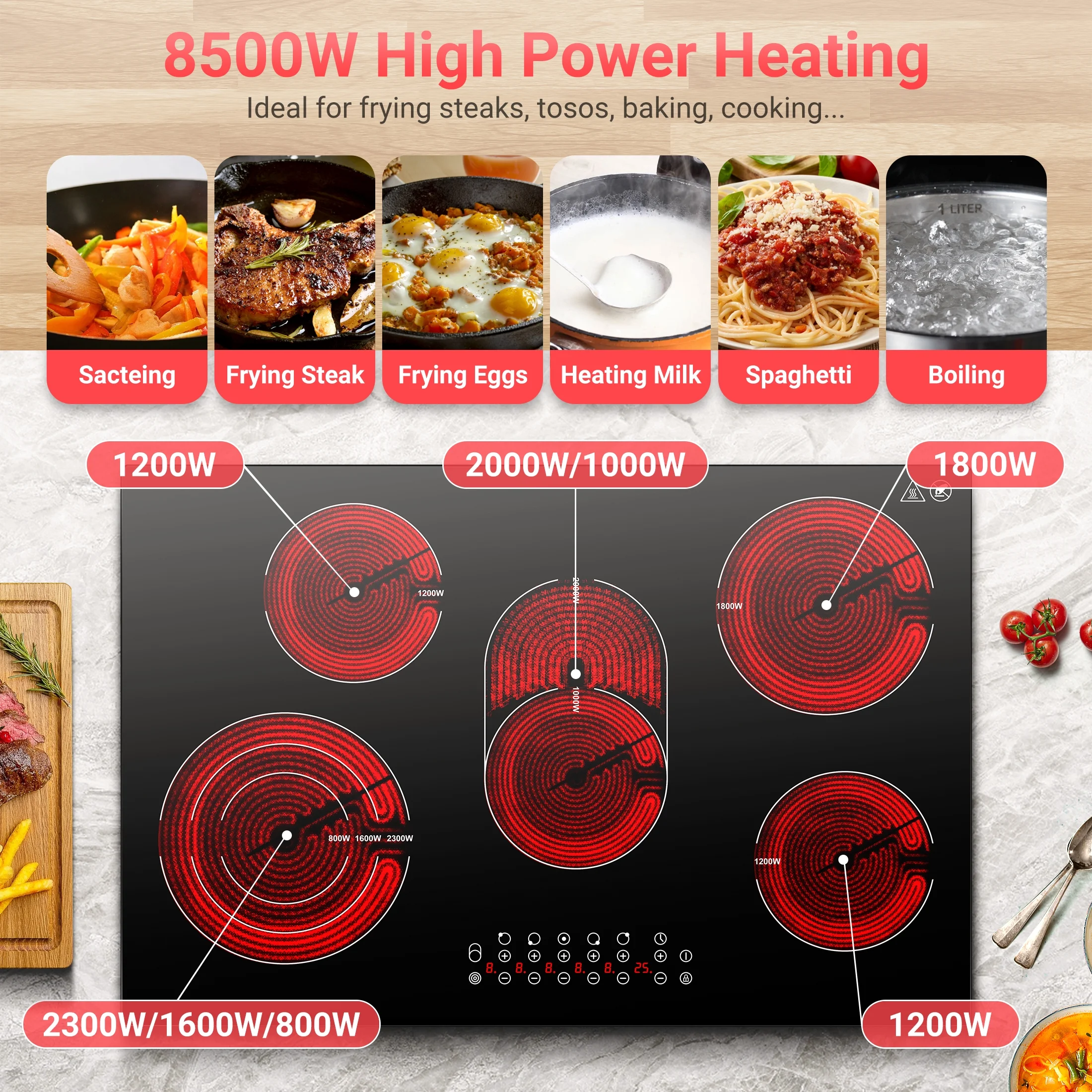 - 🍳�?500W FASTEST WAY TO COOK�?/b> Sunmaki electric cooktop 30 inch will provide a high power add up to 8500W. Equipped with 2 expandable heating elements, the 30'' stove top will provide a higher power and enough space for larger cookware. Whether you’re sauteing vegetables, searing a steak, boiling water, or slow cooking a tender roast, can handle all of your stovetop cooking needs.