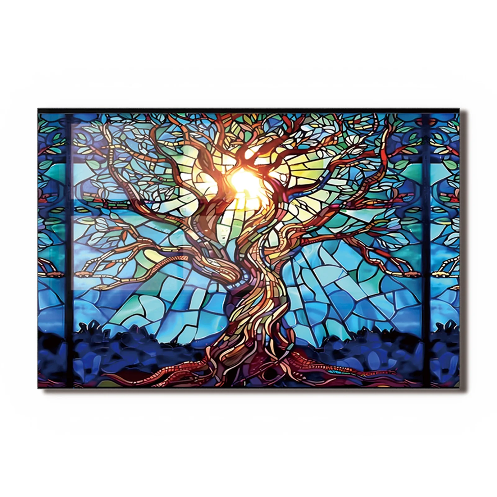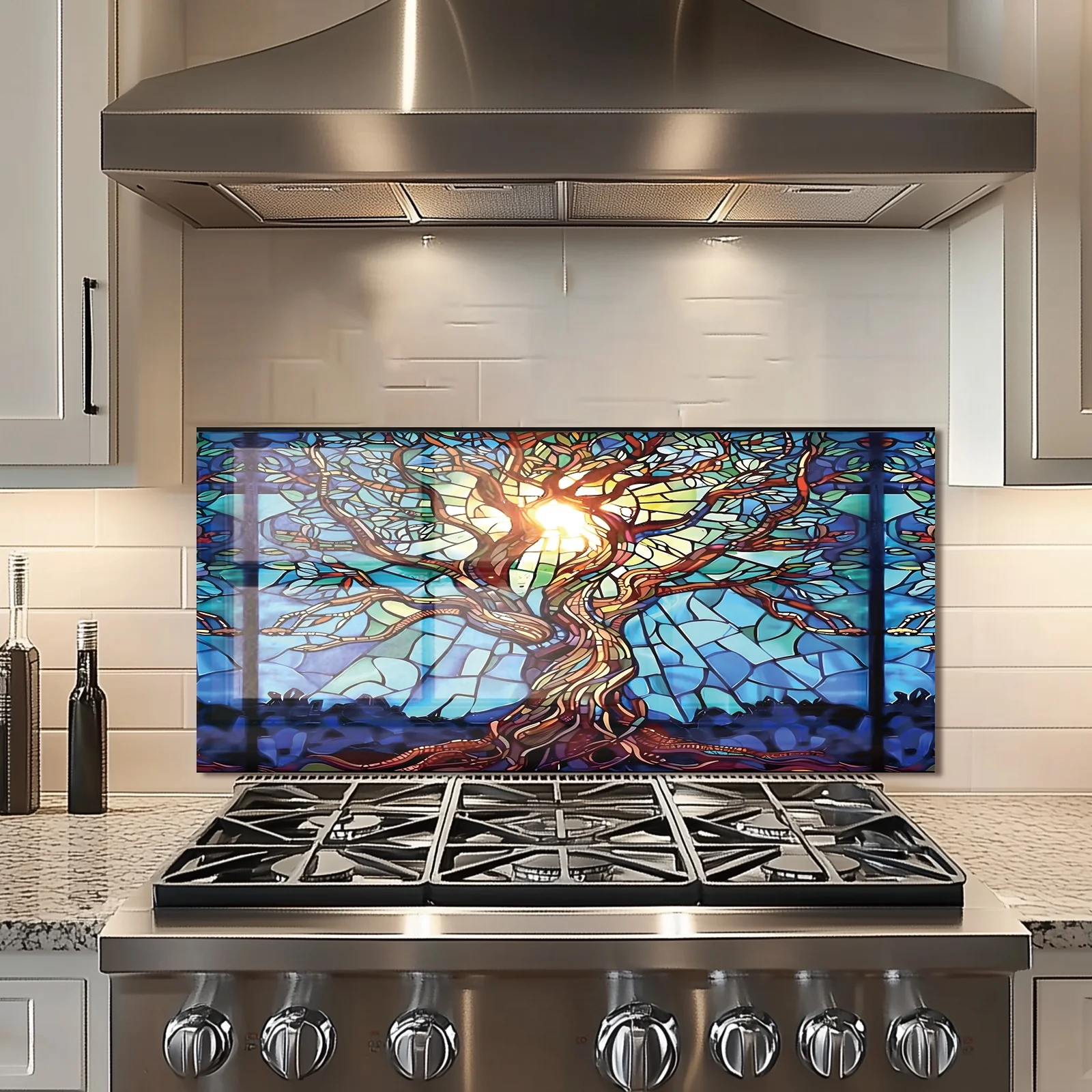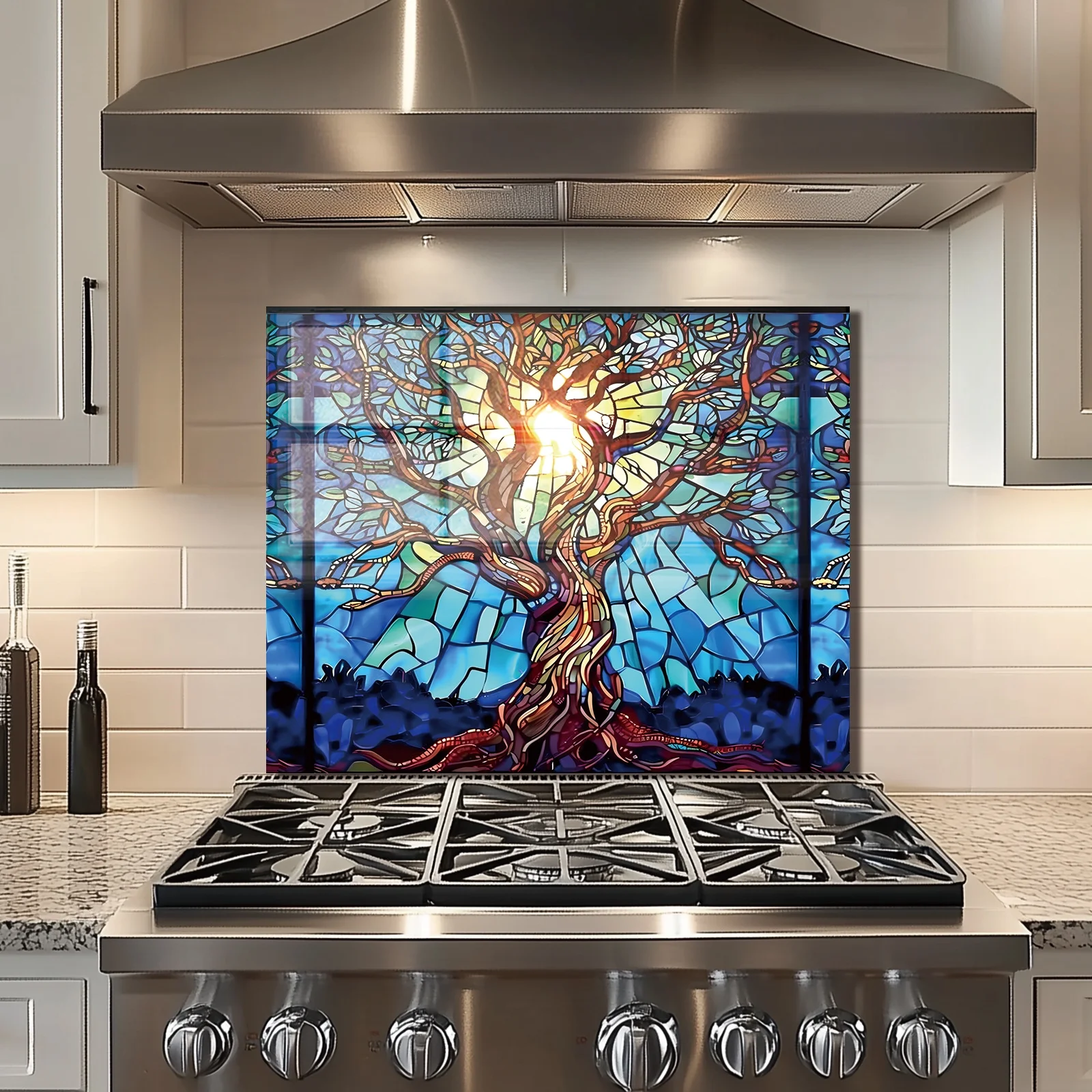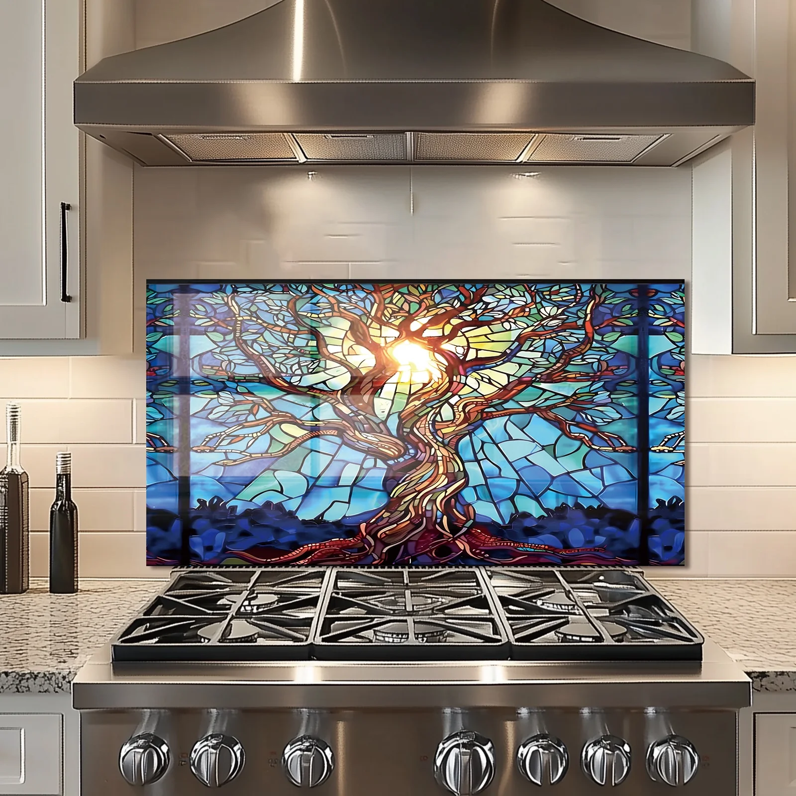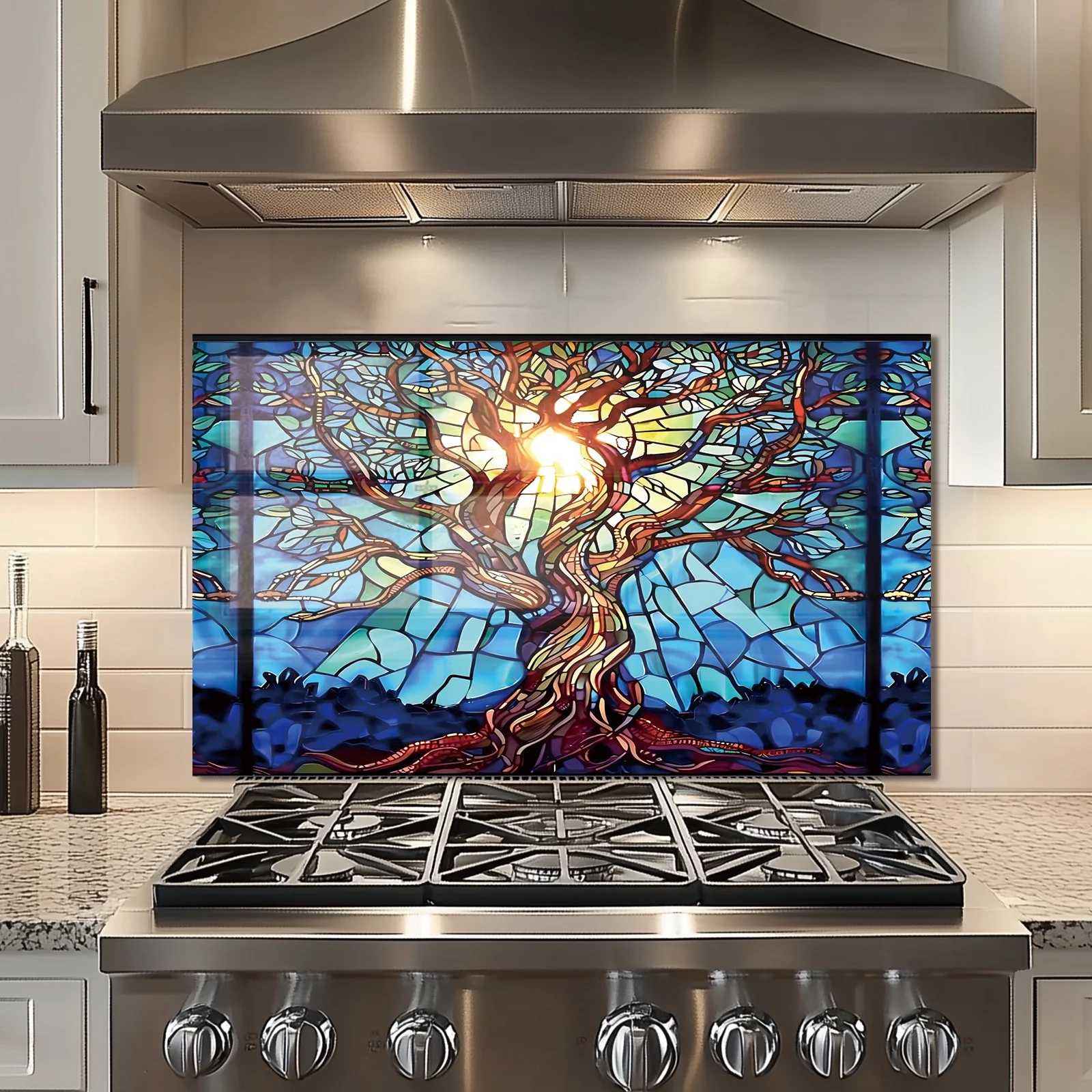 Mosaic Tree of Life Tempered Glass Backsplash for Kitchen Behind Stove, Stove Back Top Cover, Easy to Clean Glass Splashback, Sink Cover Splash Guard, Home Kitchen Wall Decor