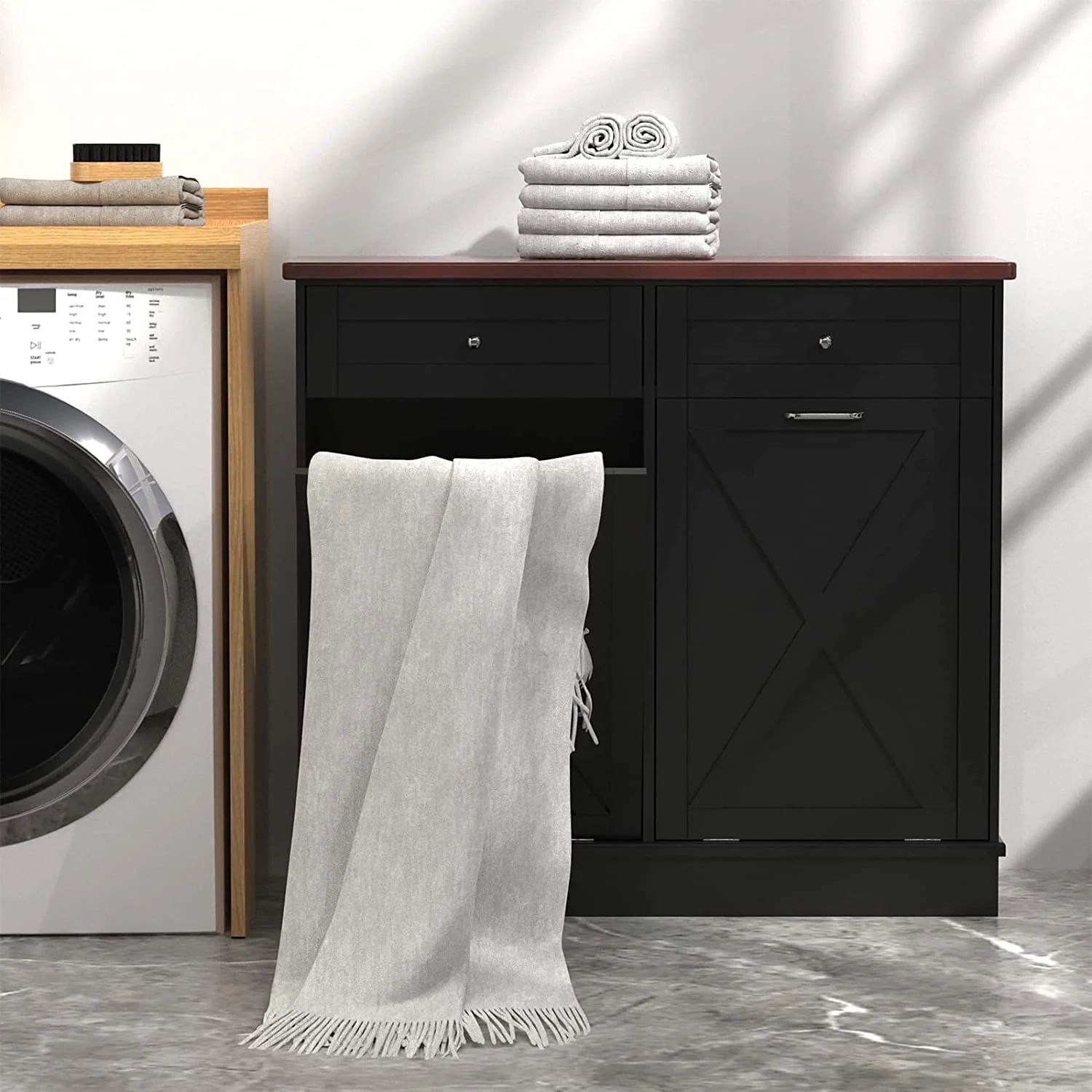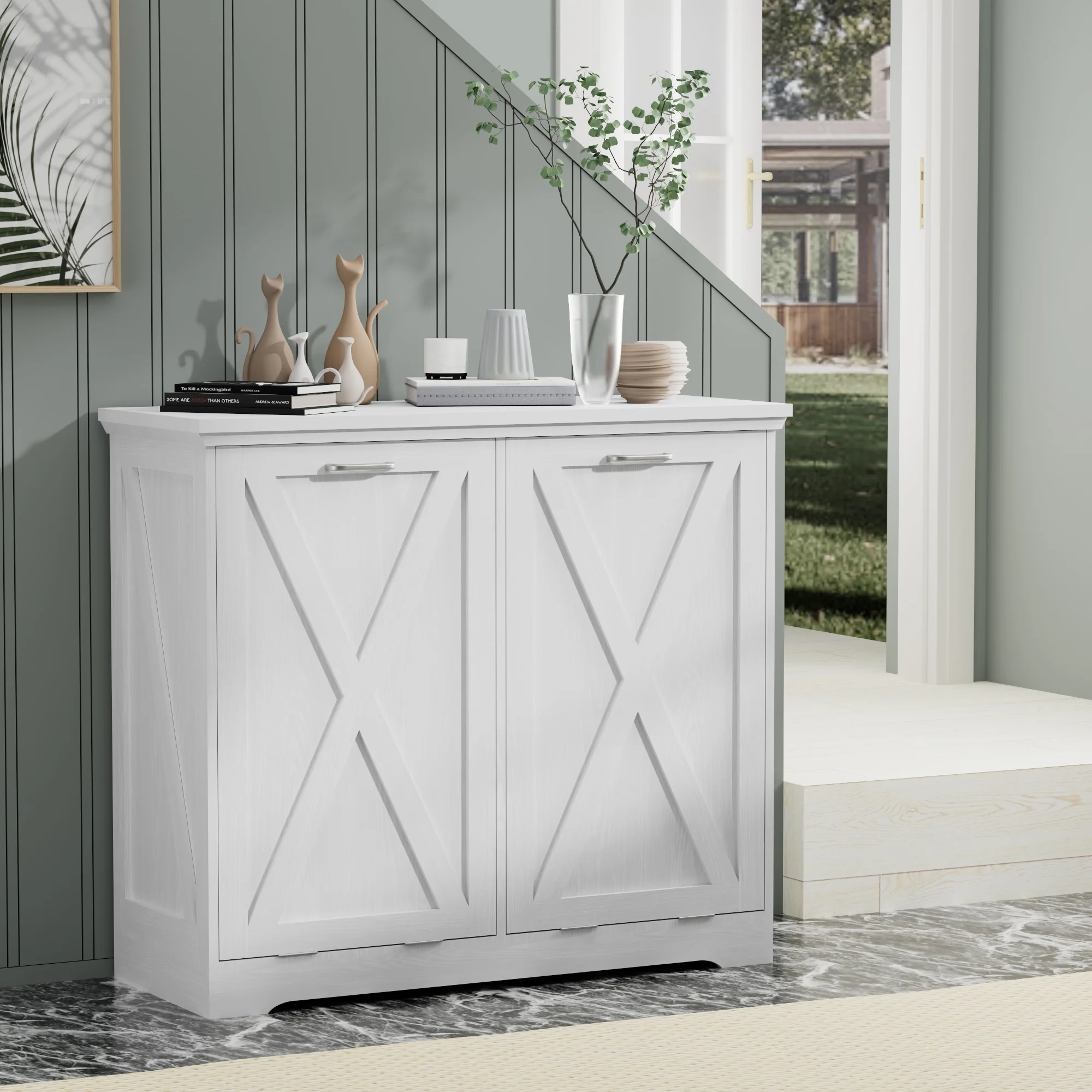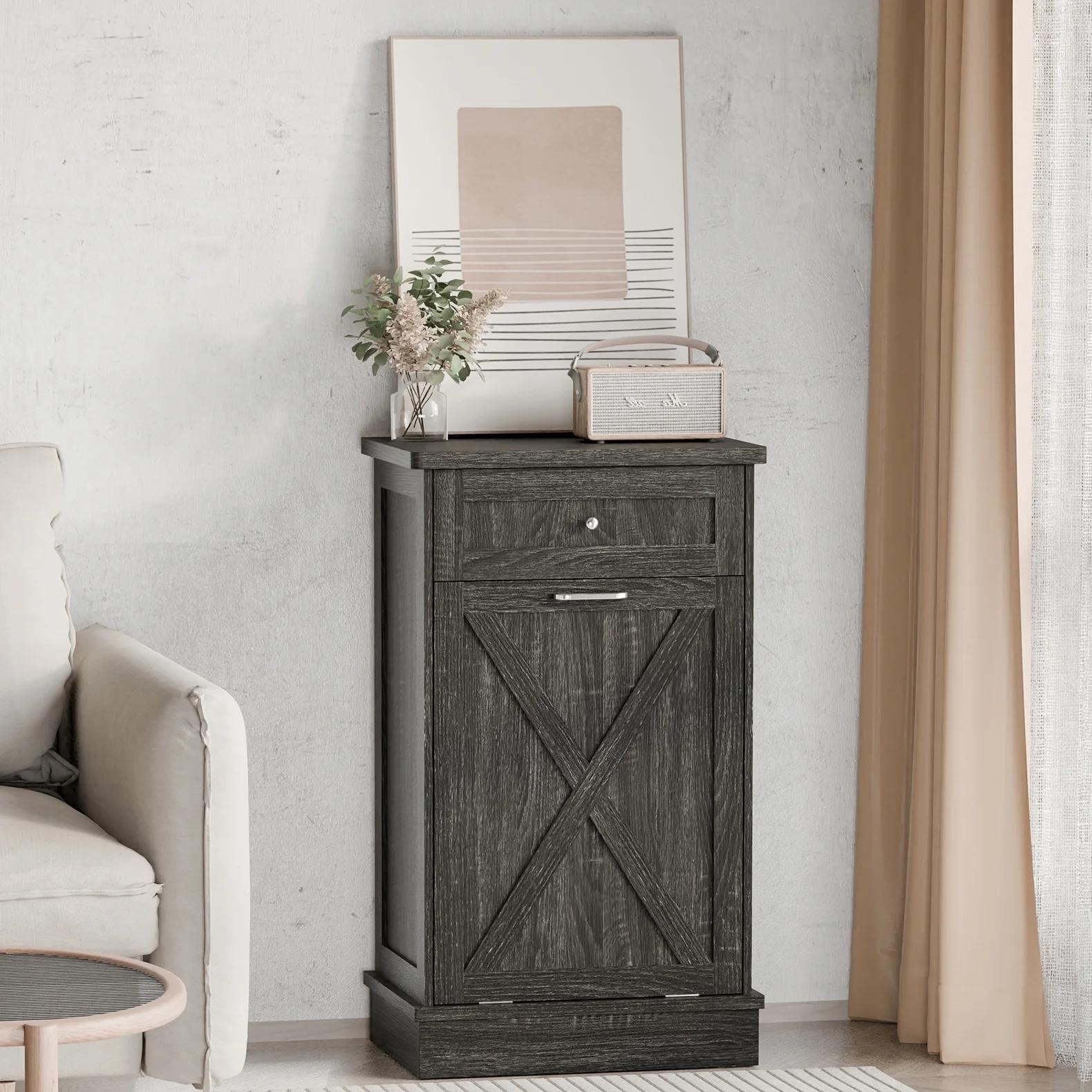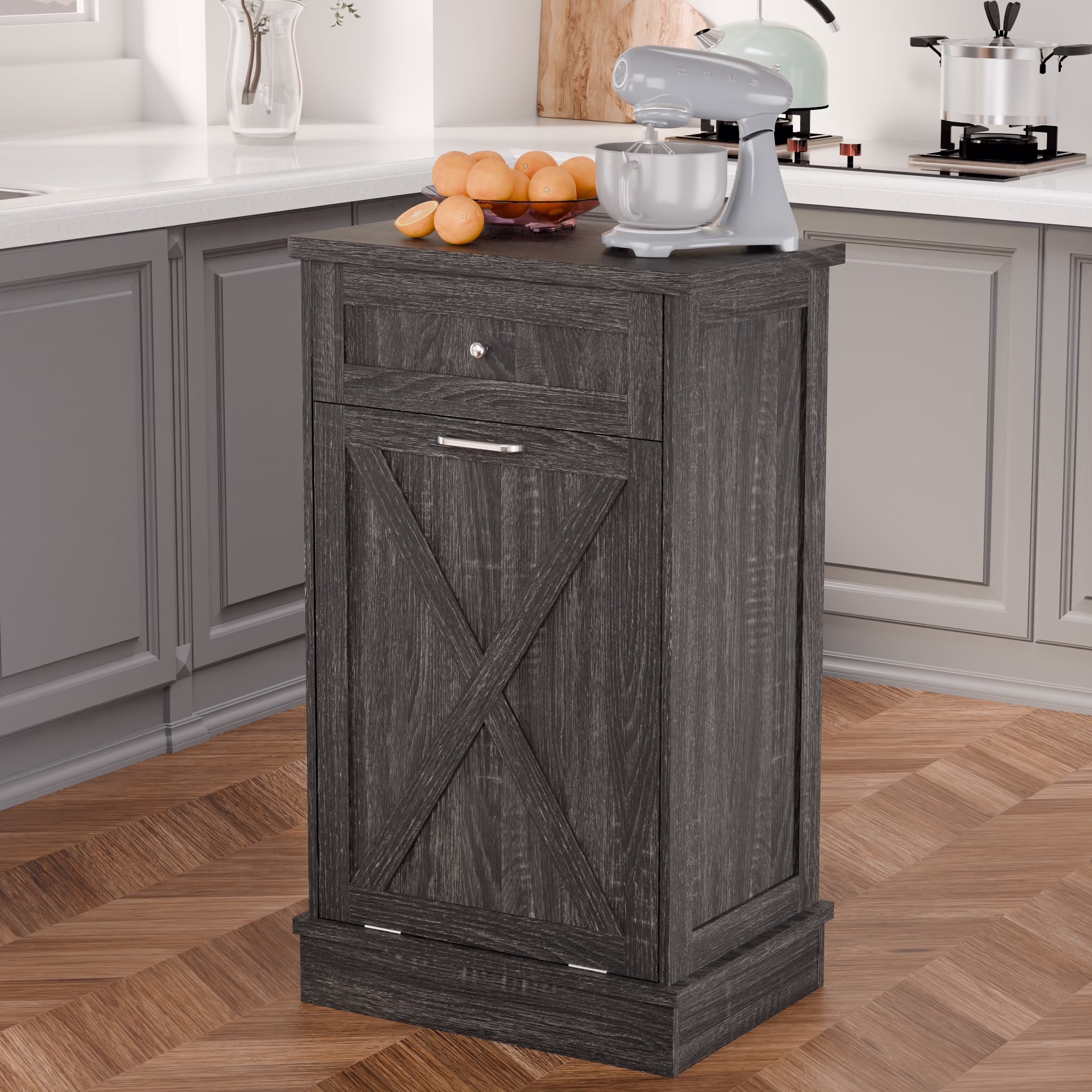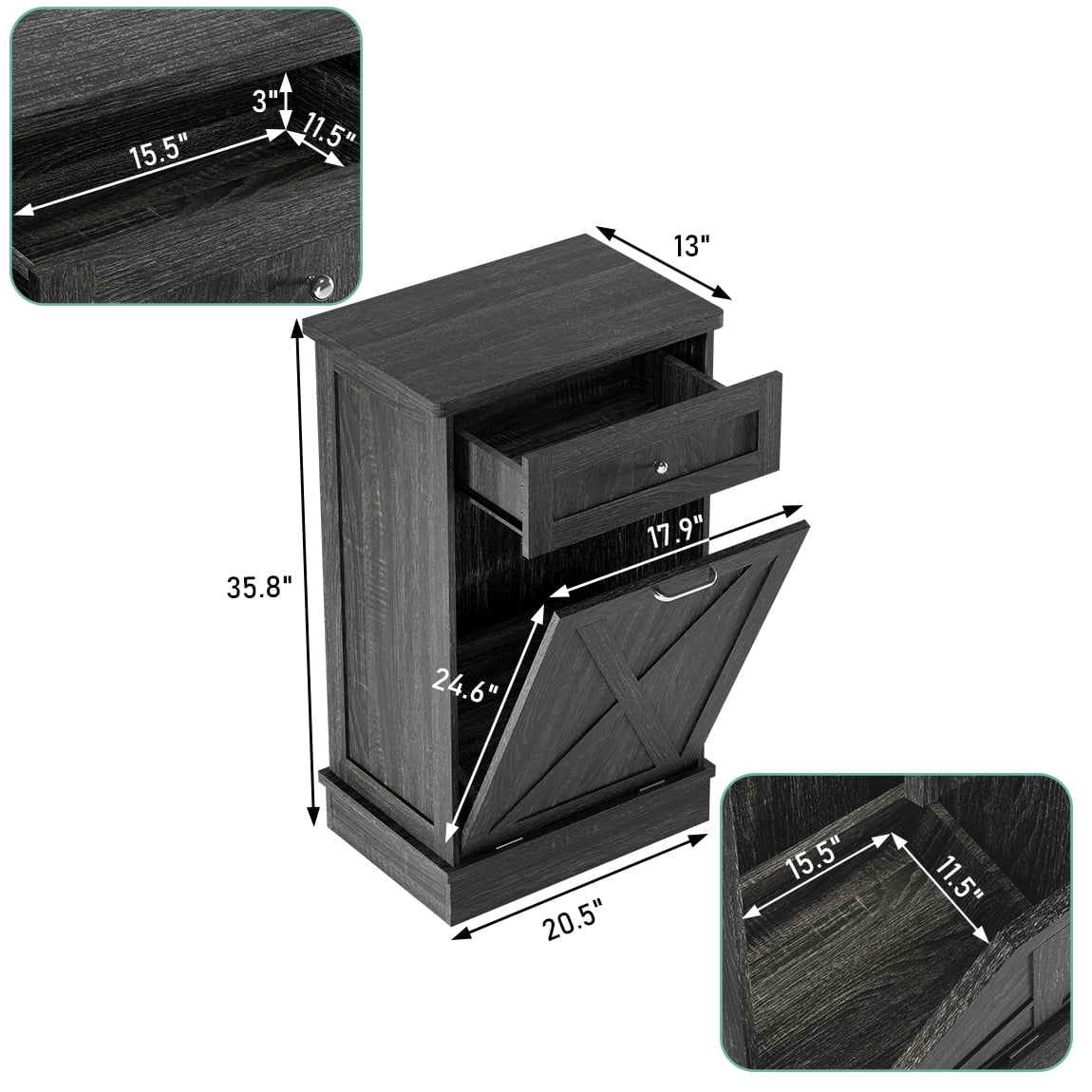 - ��New Upgrade Farmhouse Barn Door�� The cabinets are simple and practical in design, perfect for dressing up your kitchen, home, apartment, dorm room, laundry room, etc. Combined with 2 pull-out drawers, you can store kitchen supplies, pet food, and the slanted drawer below can even be used as a laundry cabinet.