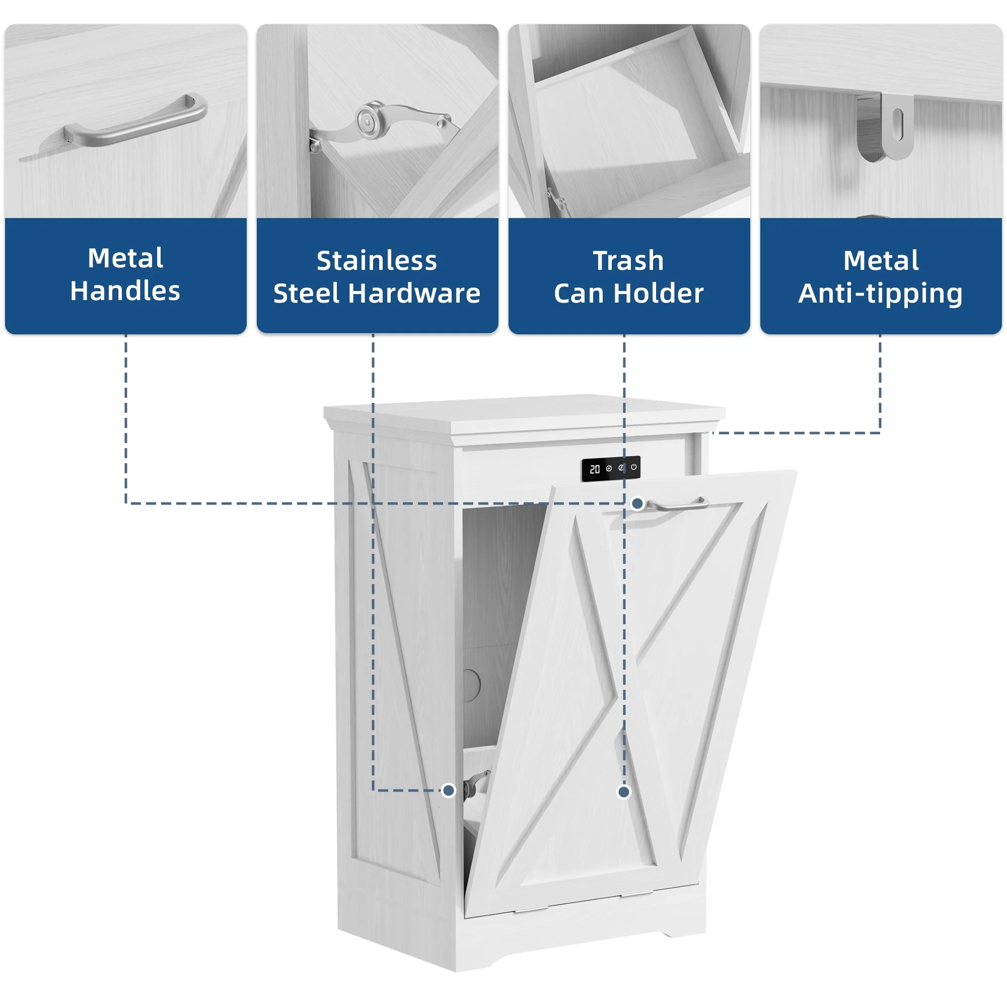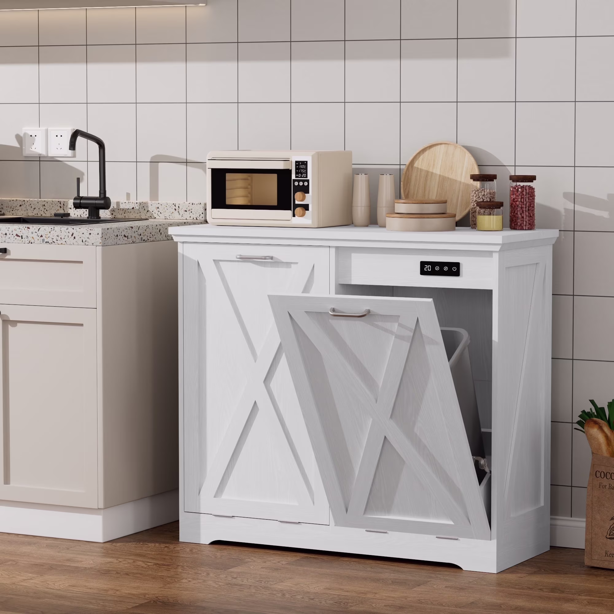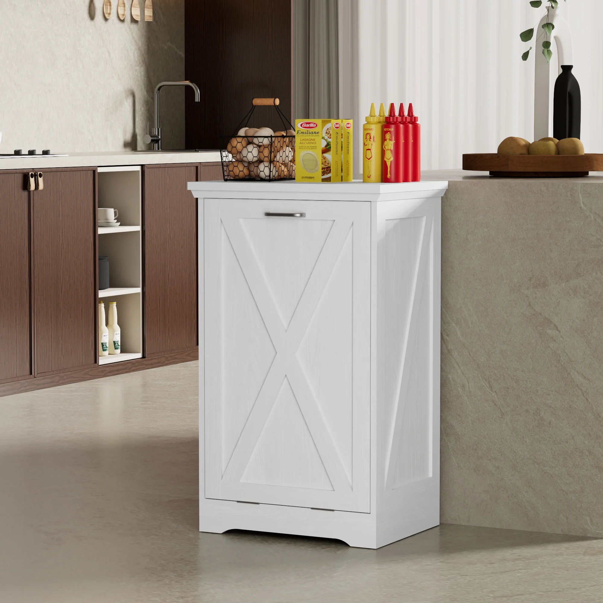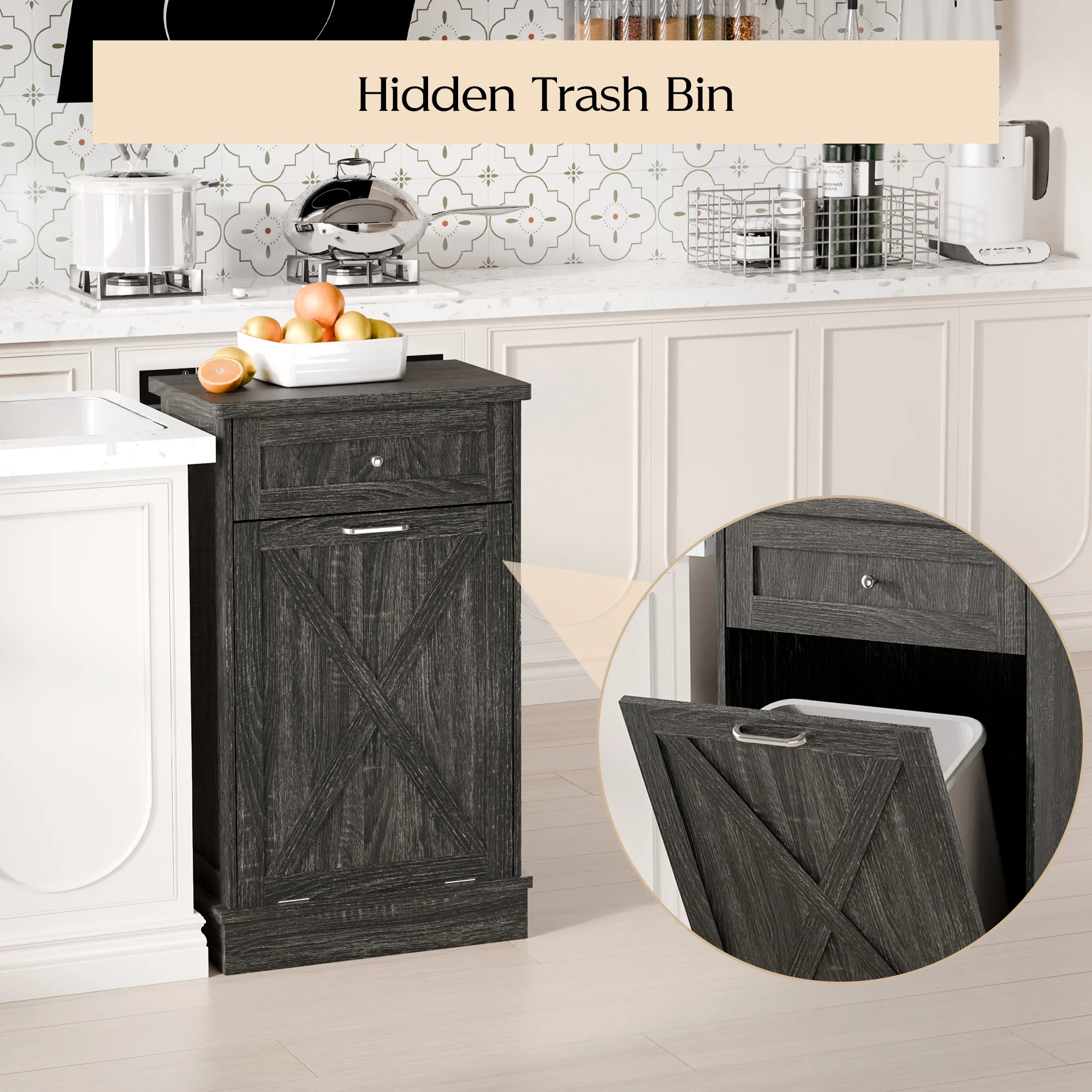 - ��Kitchen Safety Material��Our trash bin cabinet made of MDF wood with a polished, moisture-resistant coating, our garbage cabinets are simple, luxurious, and easy to clean. All wood panels used in our products are perfectly compliant with the California Air Resources Board (CARB) P2 requirements.
