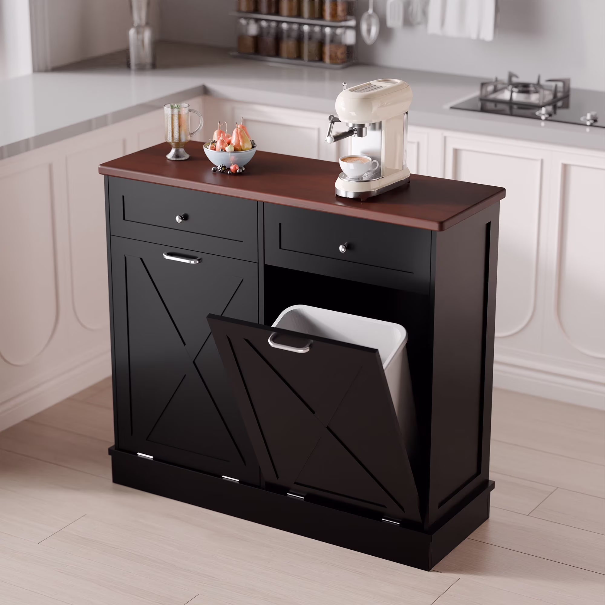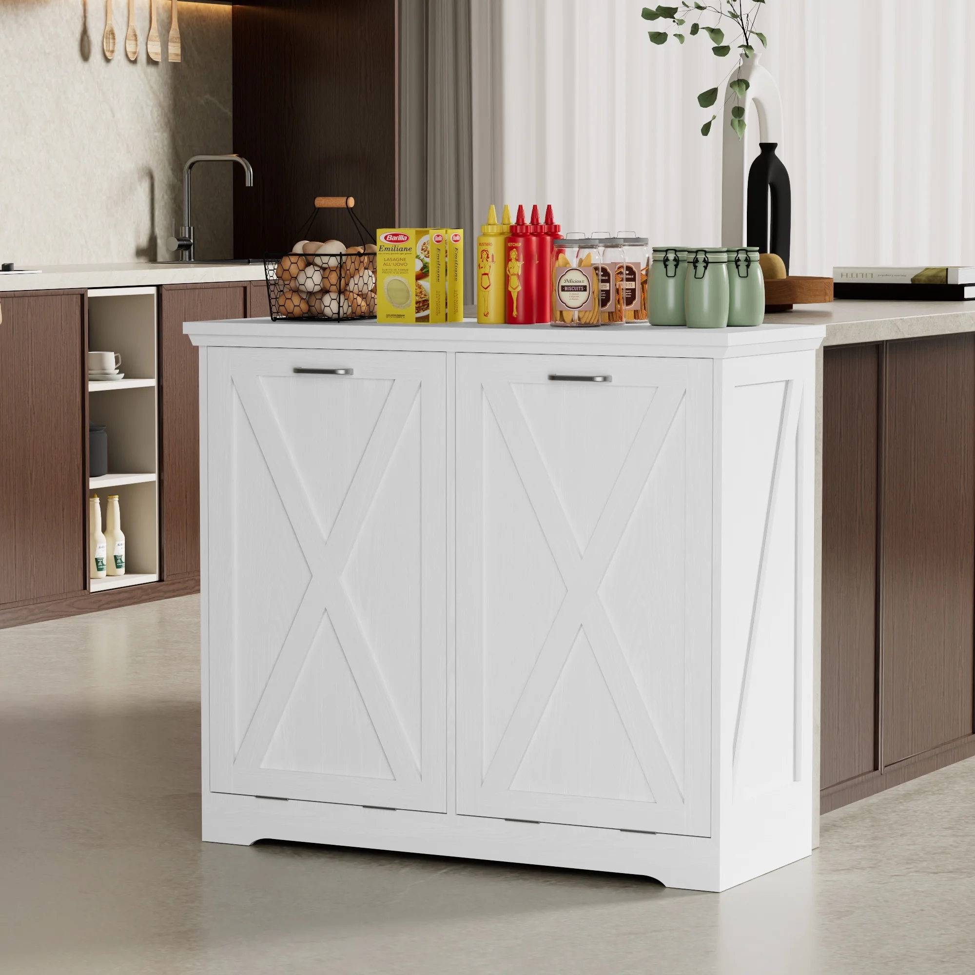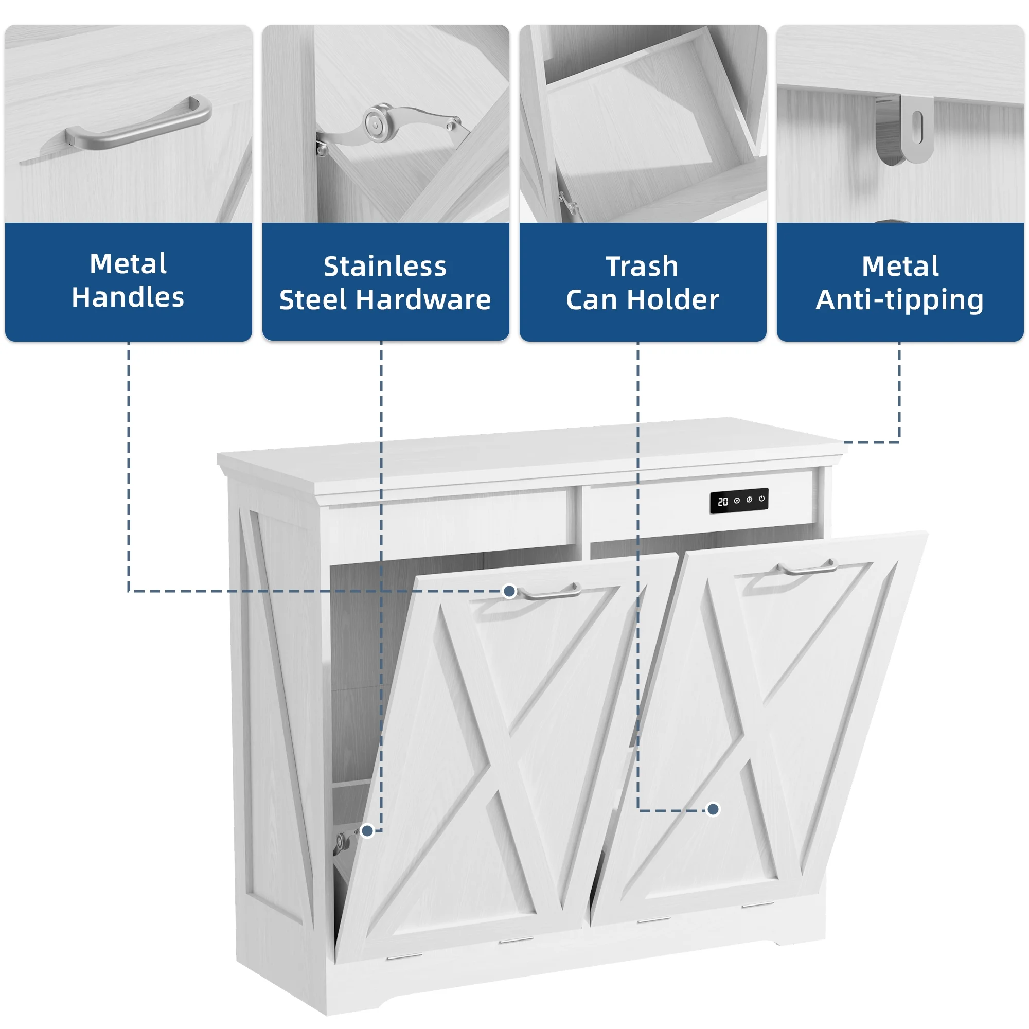 - ��Kitchen Safety Material��Our trash bin cabinet made of MDF wood with a polished, moisture-resistant coating, our garbage cabinets are simple, luxurious, and easy to clean. All wood panels used in our products are perfectly compliant with the California Air Resources Board (CARB) P2 requirements.
