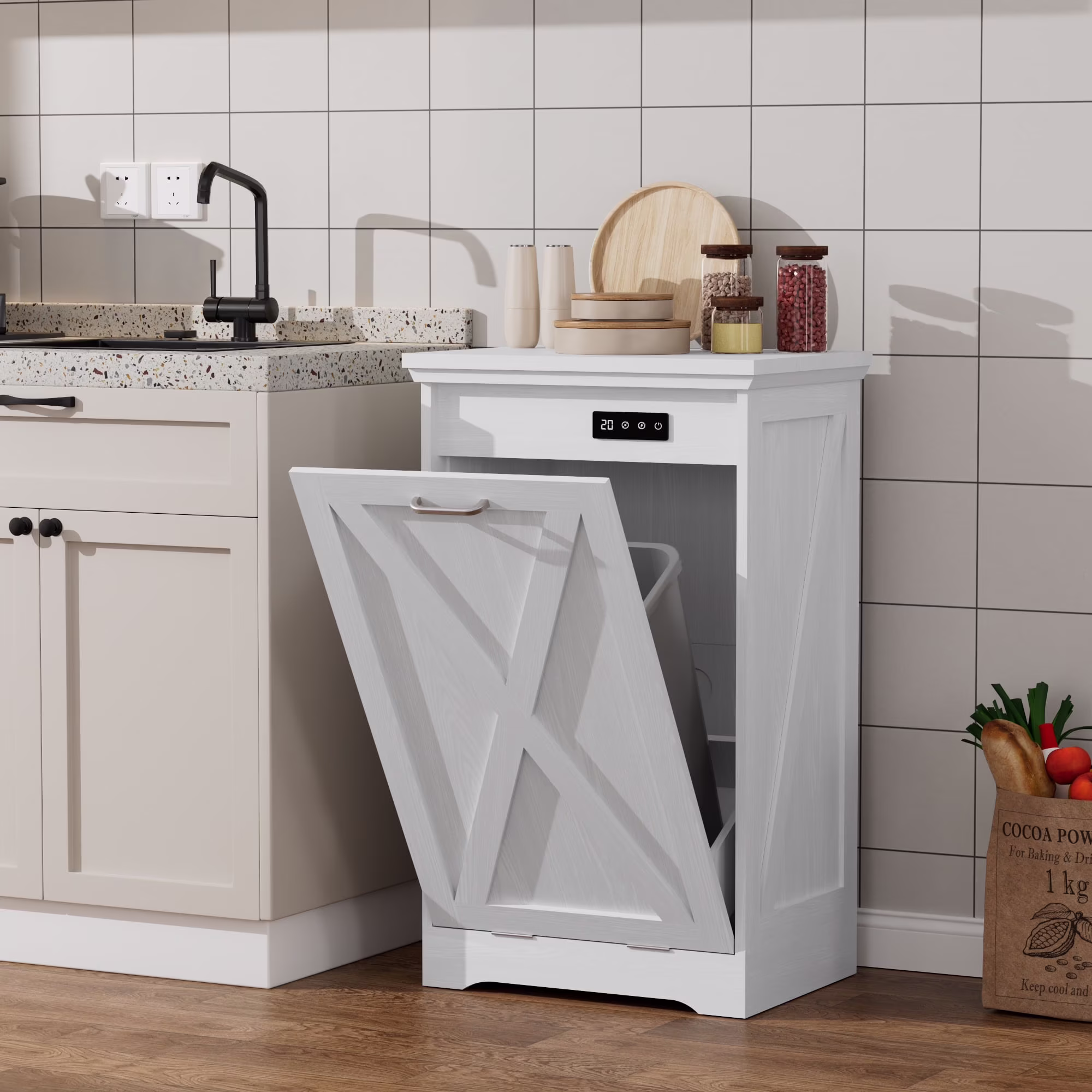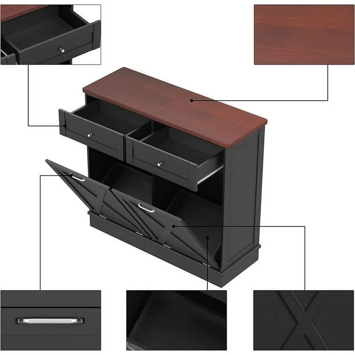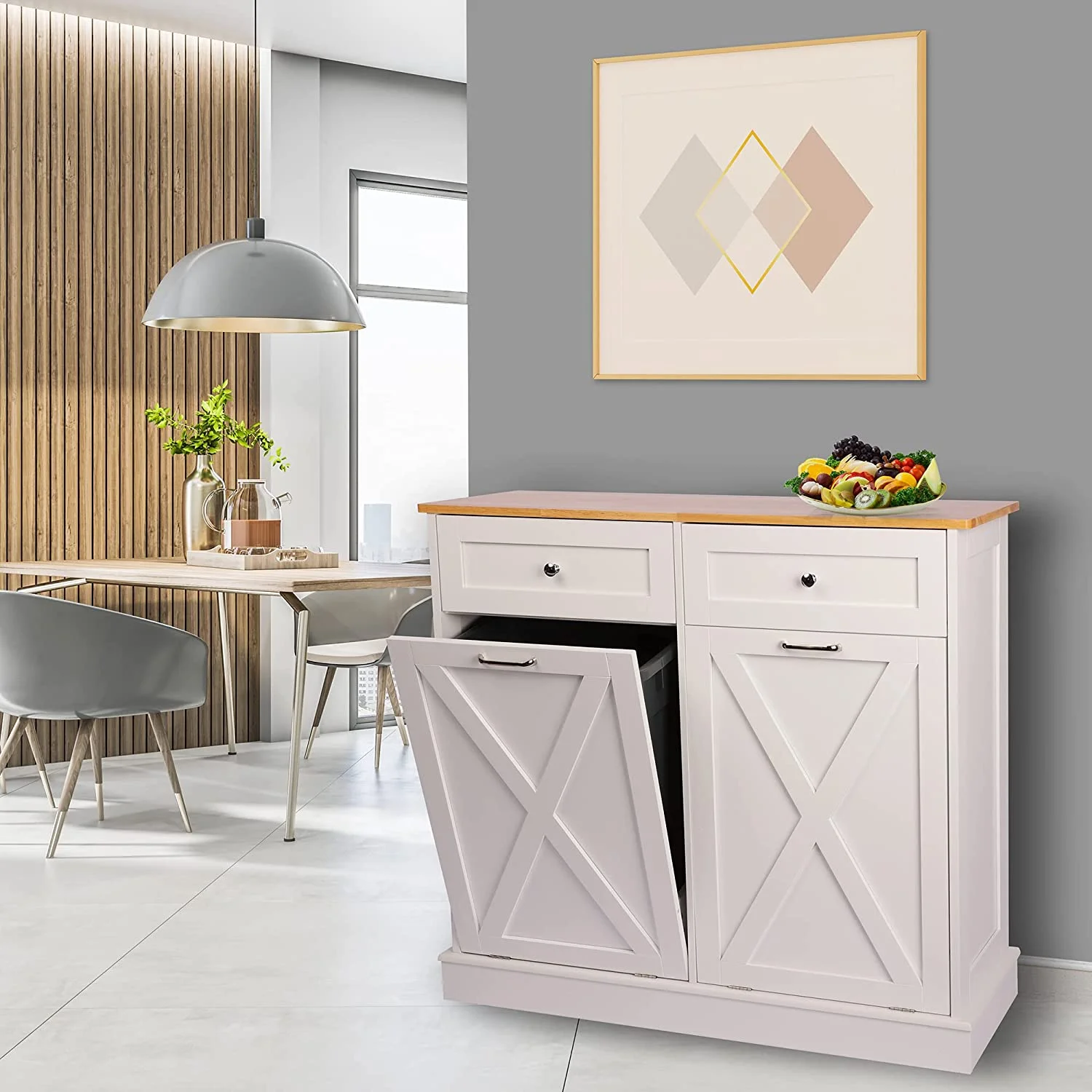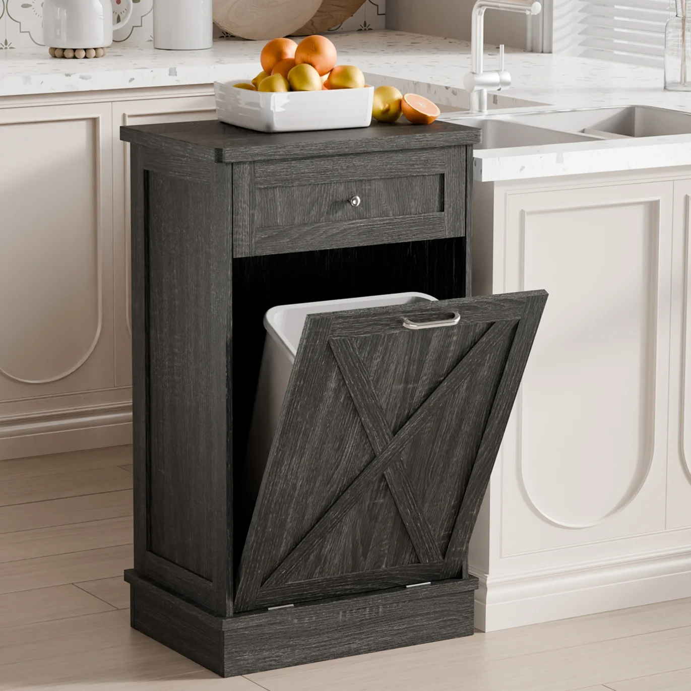 - ��Kitchen Safety Material��Our trash bin cabinet made of MDF wood with a polished, moisture-resistant coating, our garbage cabinets are simple, luxurious, and easy to clean. All wood panels used in our products are perfectly compliant with the California Air Resources Board (CARB) P2 requirements.