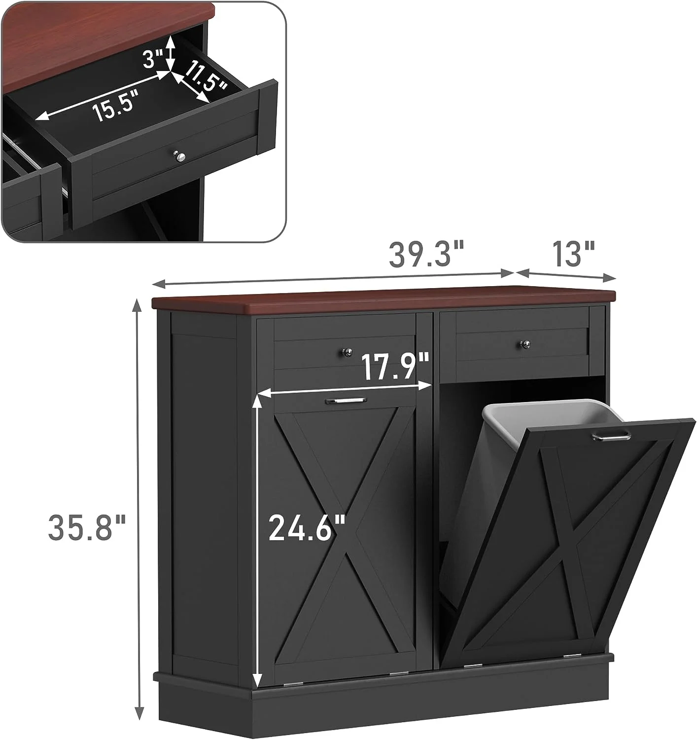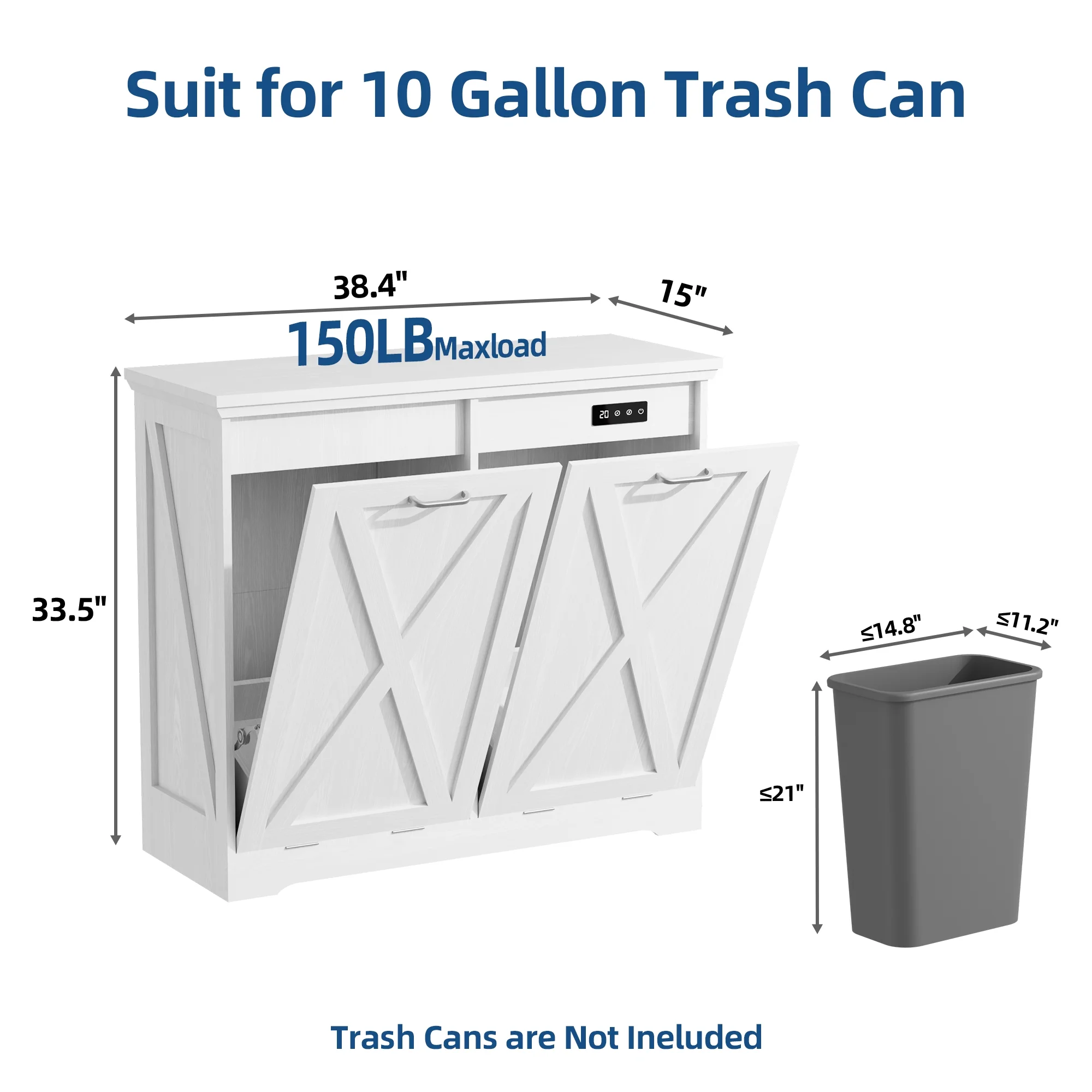 - ��Space Saving and Concealment��Double Tilt-out trash cabinet 35.8 "H x 39.3 "L x 13 "W (for 2 x 10 gallon trash cans), which can hide the trash cans well, keep the kitchen delicate and the floor clean. It also blocks odors from emanating, while your pets will never knock over the trash cans anymore.