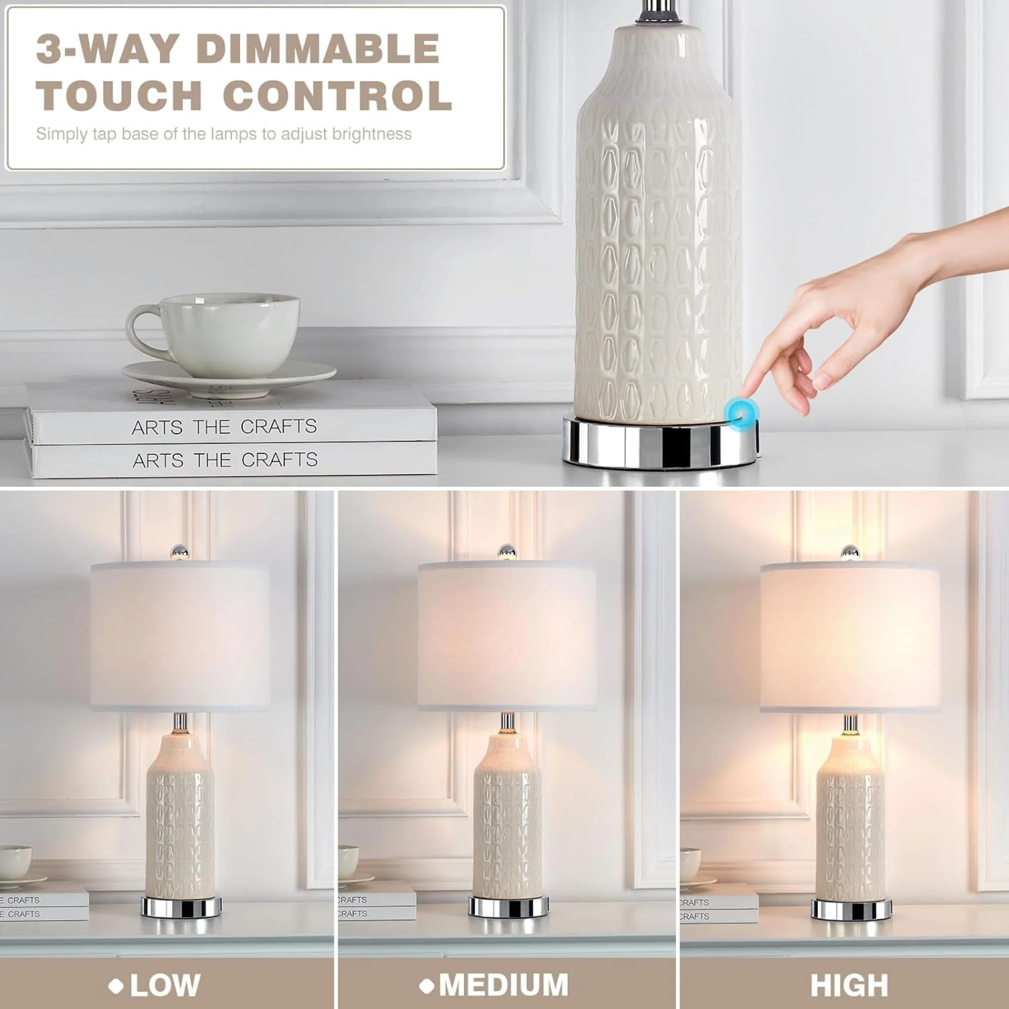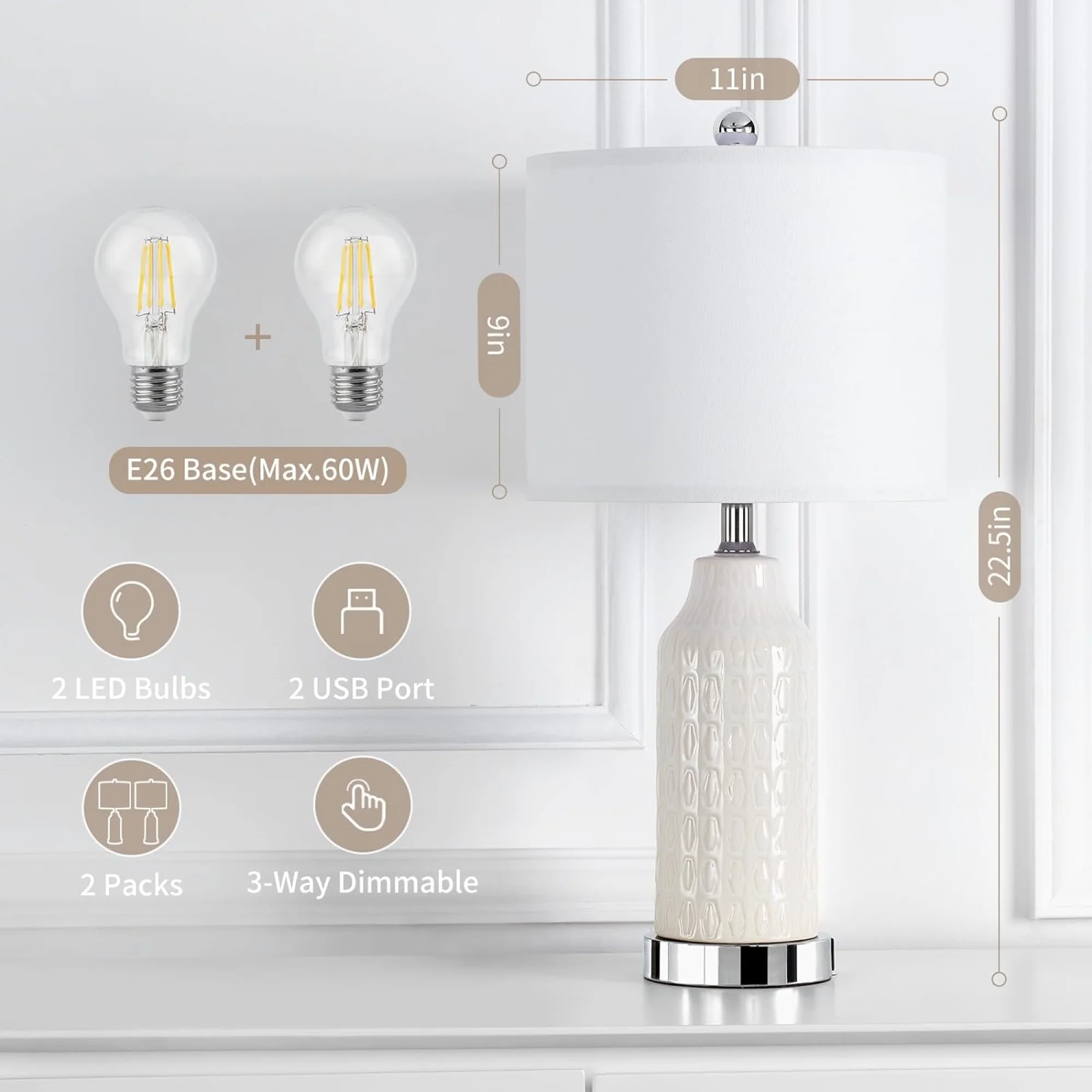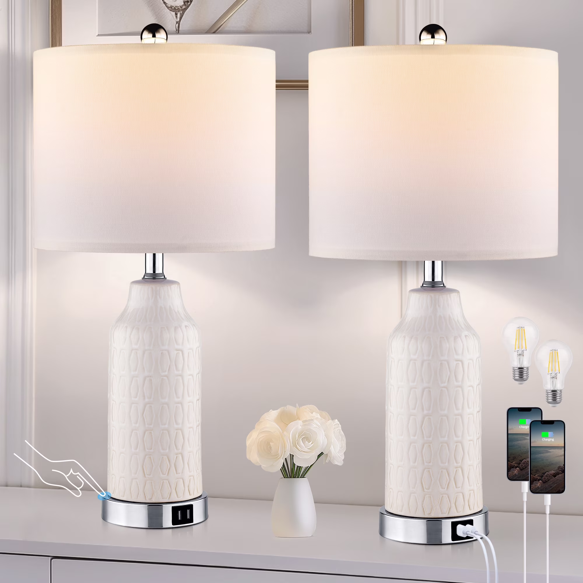 - 3 Way Dimmable Touch Control Table Lamp with Nightlight : white farmhouse table lamps features a rotary switch for the top main light and a 3-way dimmable touch control for the nightlight. Rotary switch can turn on/off main light, the silver sensor touch switch on the lamp base can turn on/off nightlight and offers three levels of brightness (low, medium, high), you can choose the lighting according to your various brightness requirements such as sleeping, reading, study, working or daily use. Two energy-efficient LED bulbs included, standard E26 bulb base can compatible with incandescent (60W), LED, CFL, halogen or Edison bulbs.