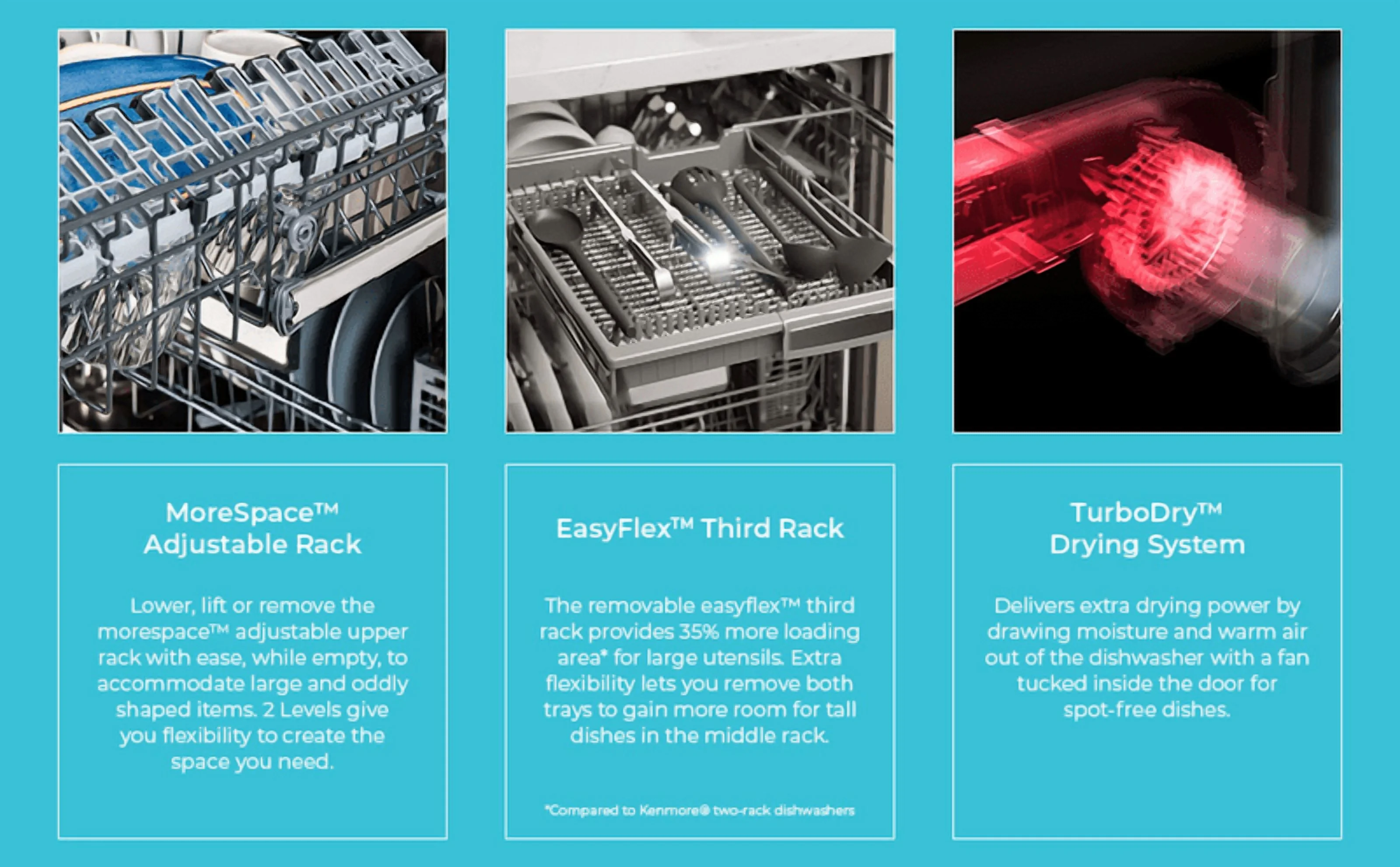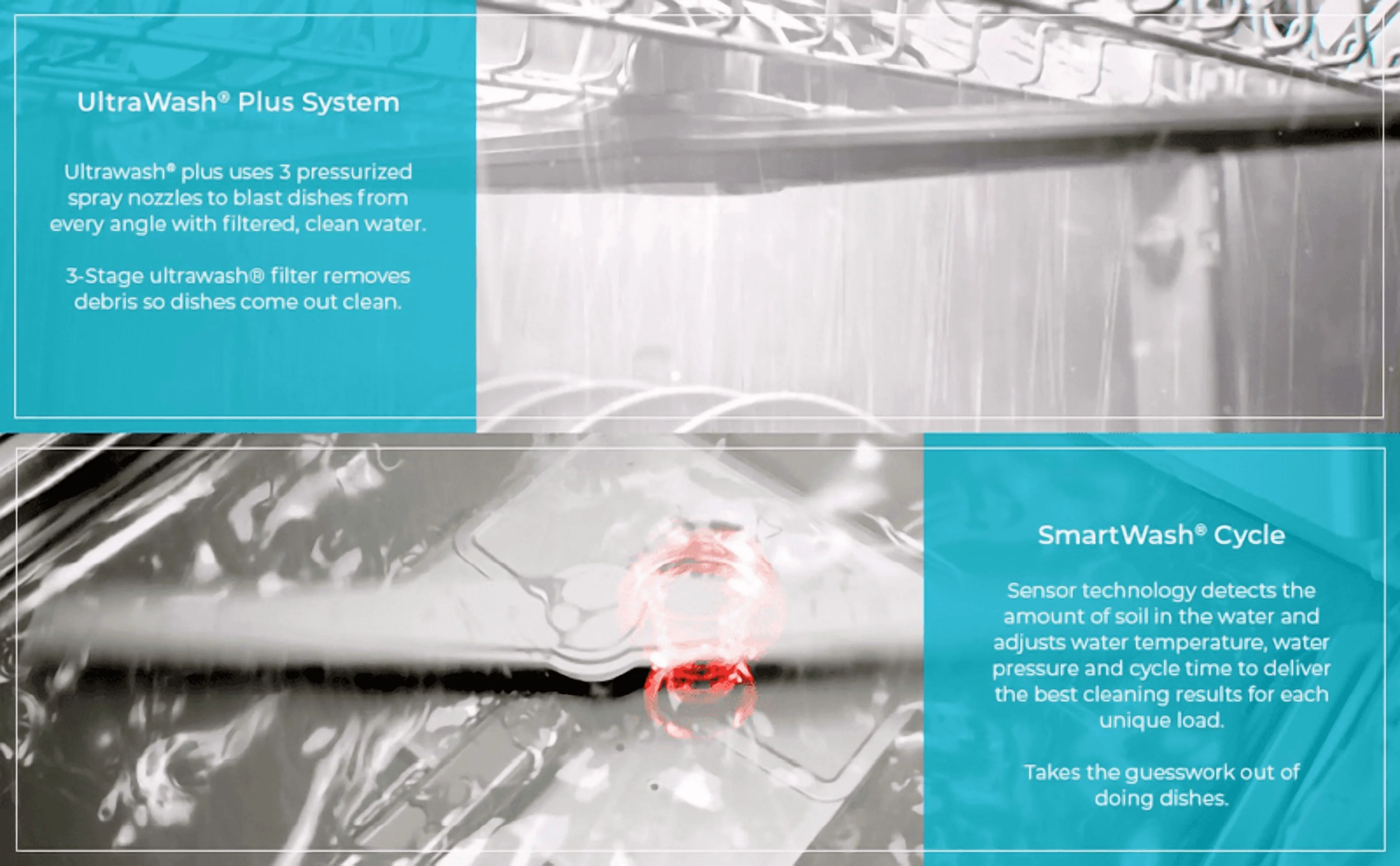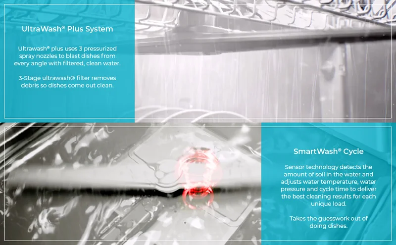 - INNOVATIVE SYSTEMS: UltraWash Plus system uses 3 spray arms while constantly filtering the wash water through the wash cycle, while TurboDry uses hot water and a fan to promote the condensation of moisture in the tub for ready-to-use dishes