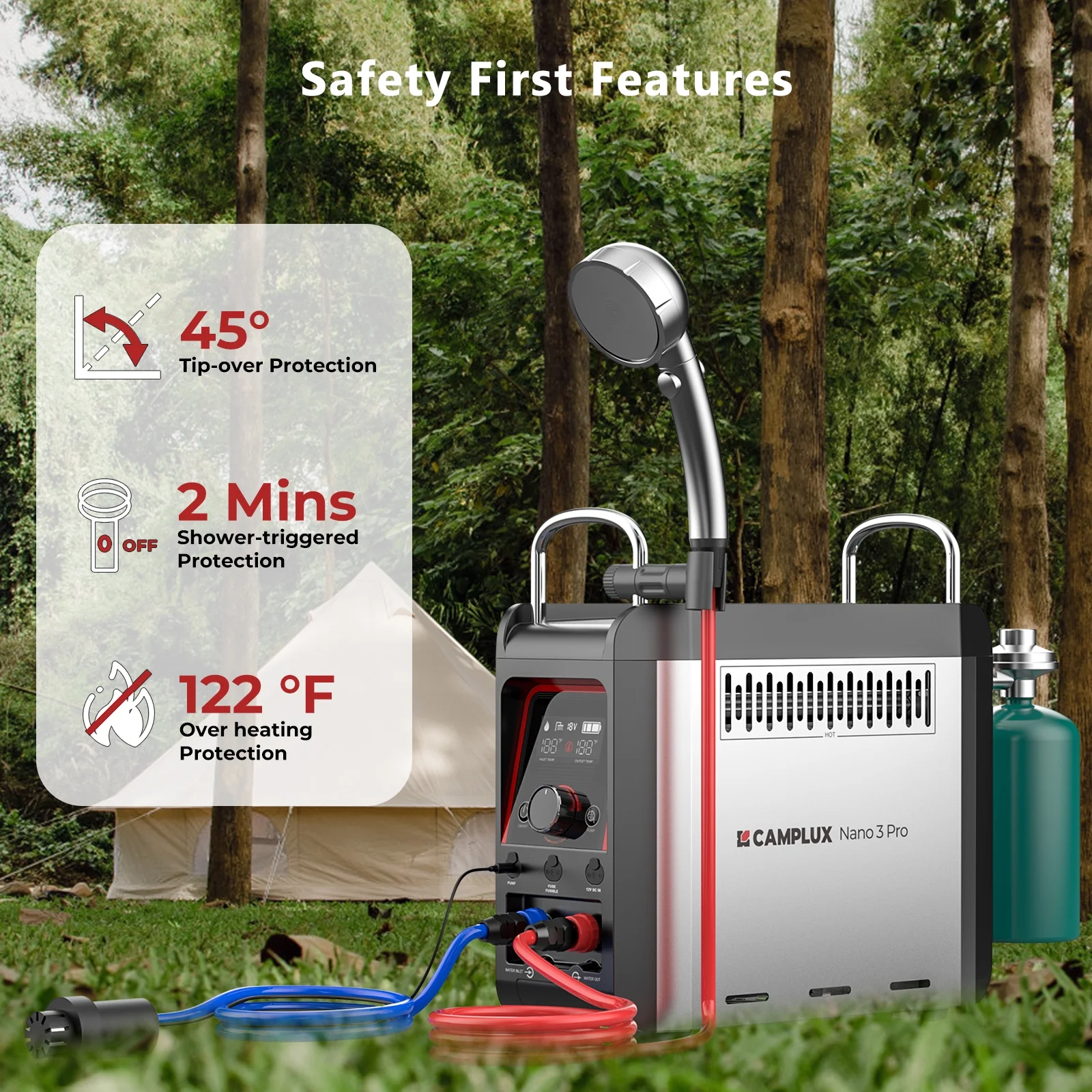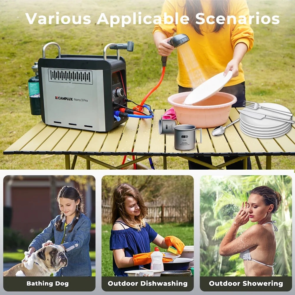 - ��Instant Hot Water Anywhere��Enjoy a warm shower in seconds with the CAMPLUX Nano 3 Pro. Heats water instantly, perfect for camping, hiking, fishing, hunting, and other outdoor adventures.