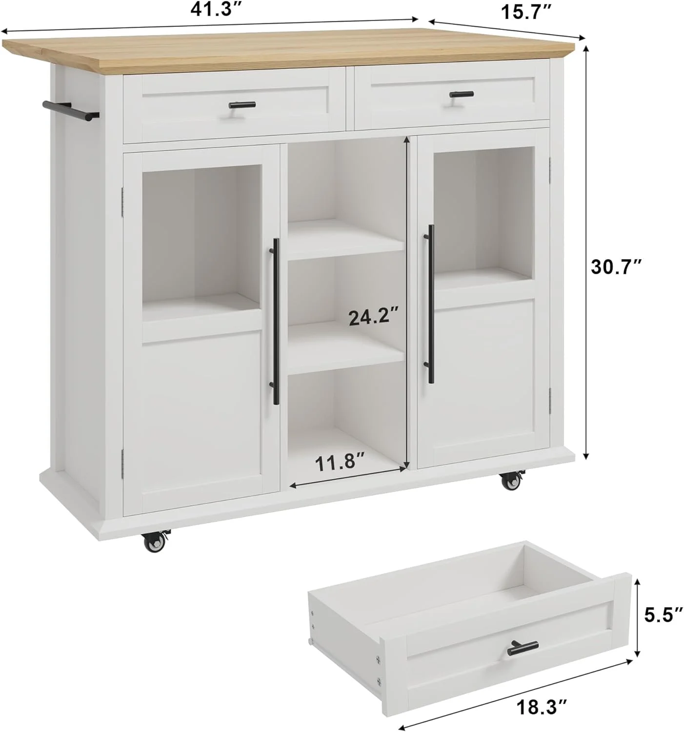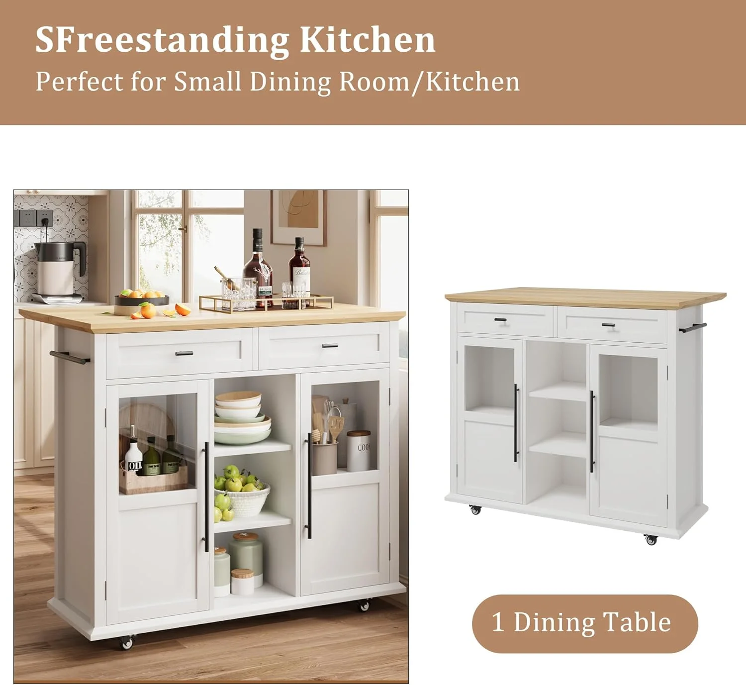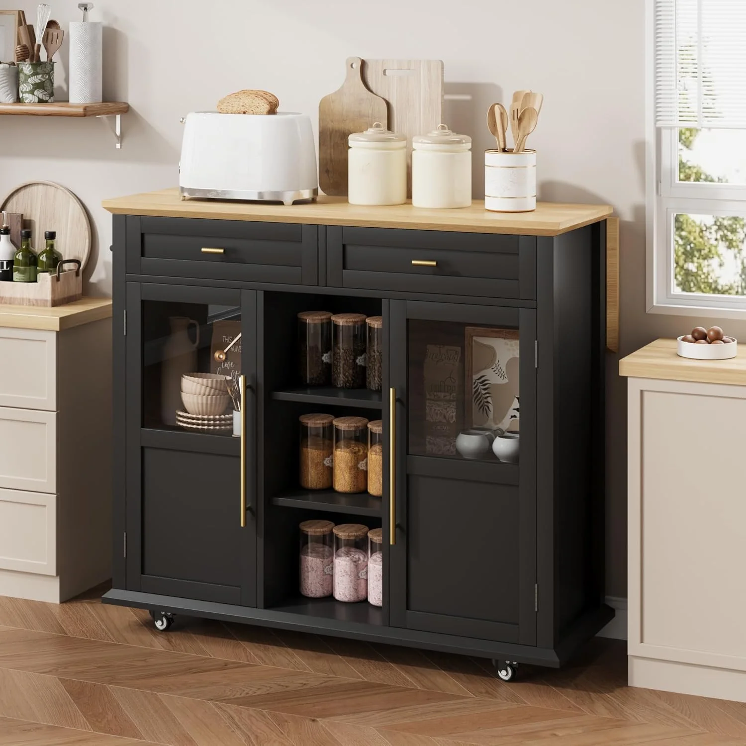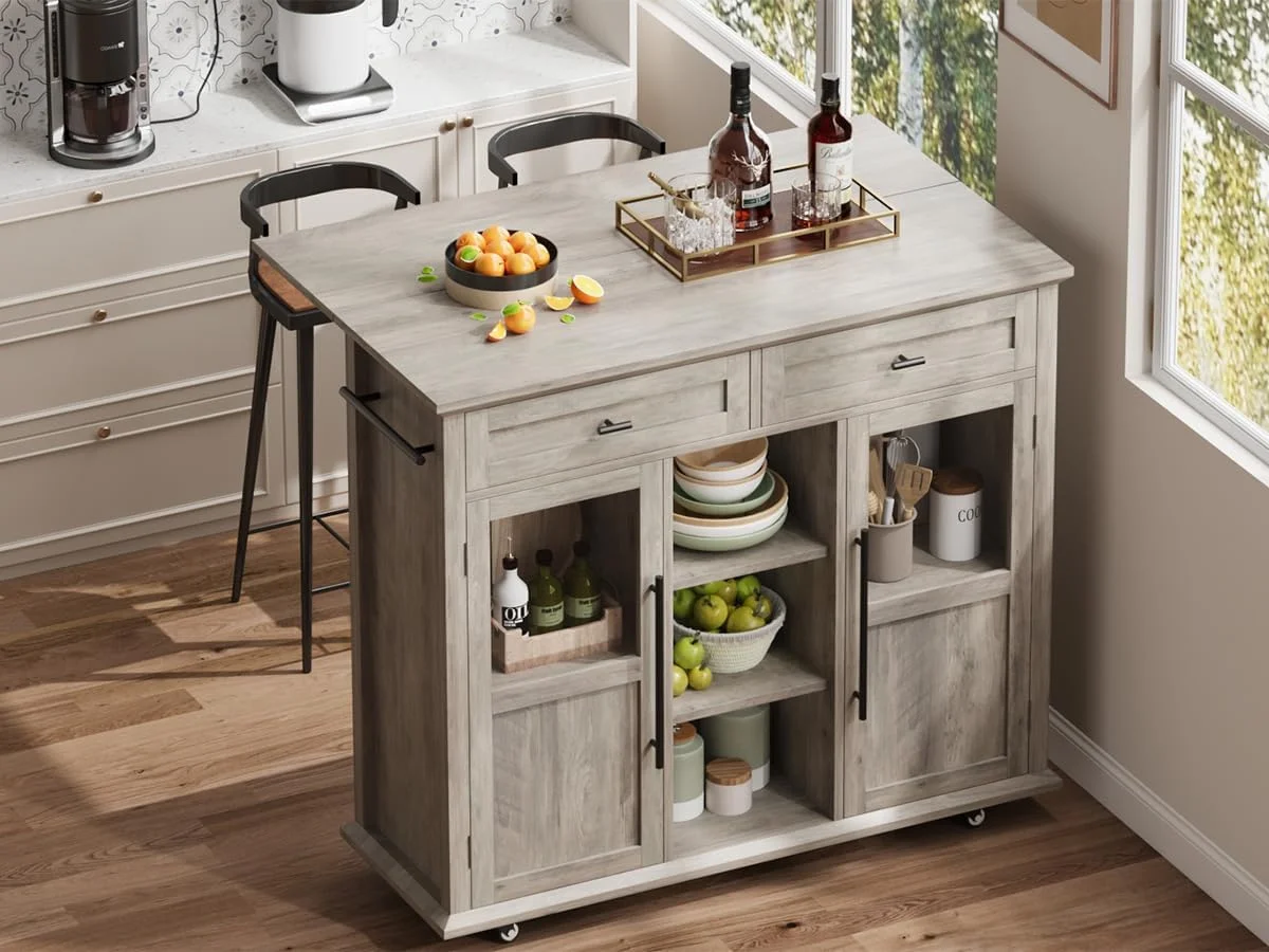- ��Ample Storage & Organization�� Featuring 2 glass-door cabinets with 4 interior shelves and 2 large pull-out drawers, this foldable kitchen island cart provides the extra prep area, mobile serving space, or additional storage you need, adapting effortlessly to your kitchen requirements.