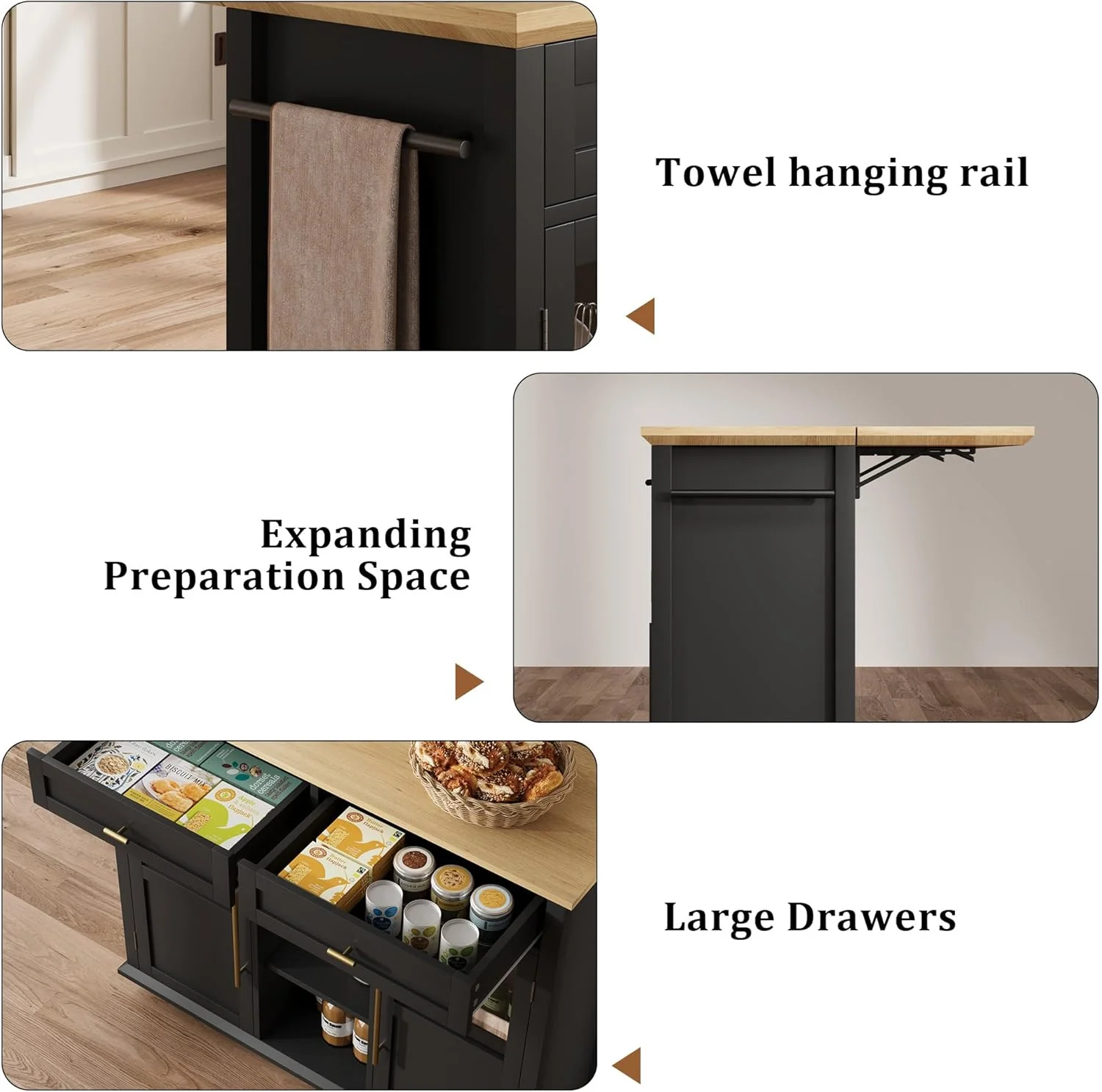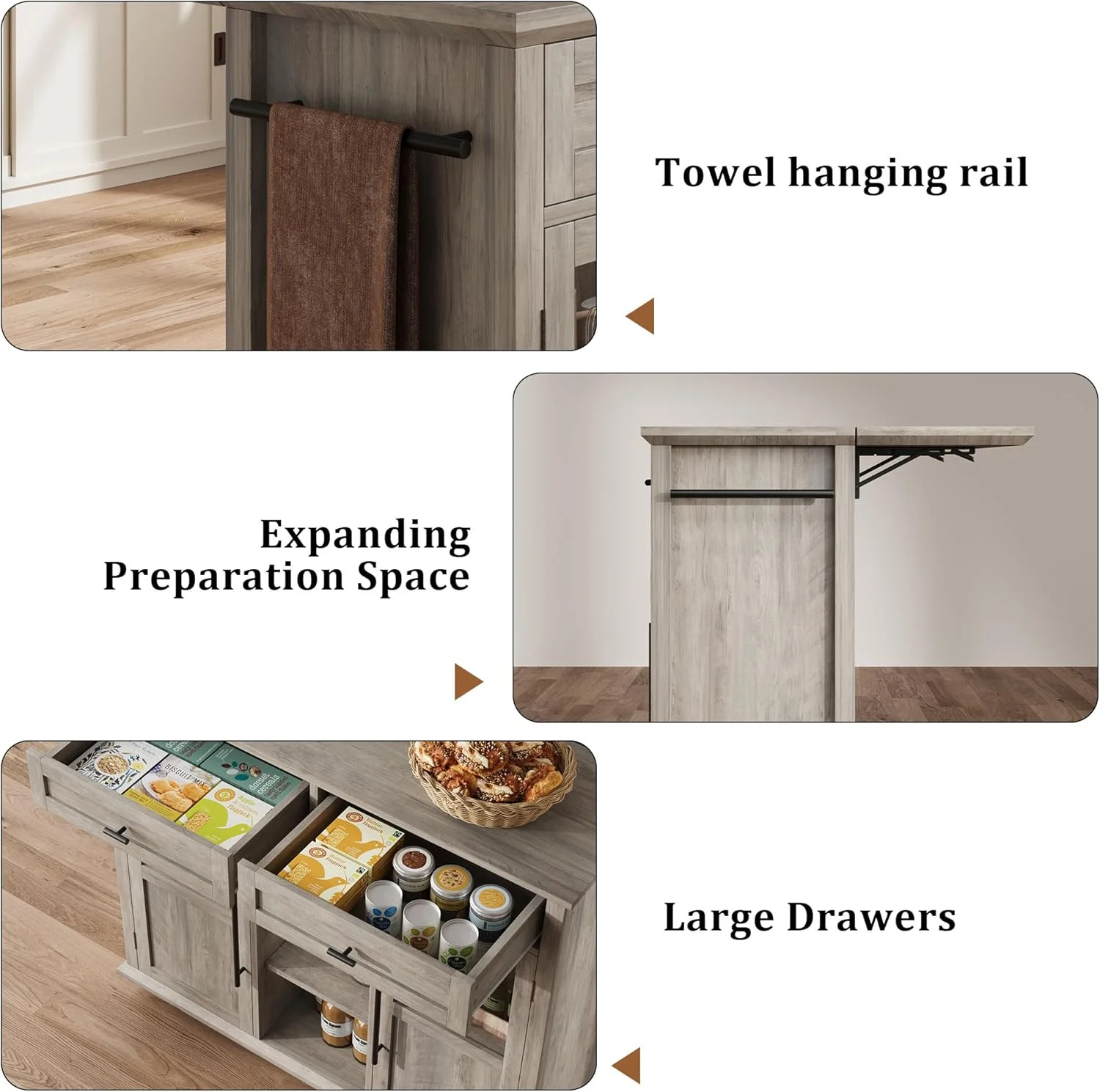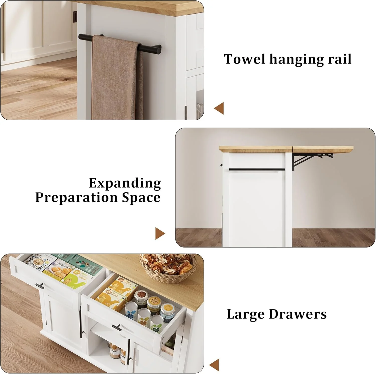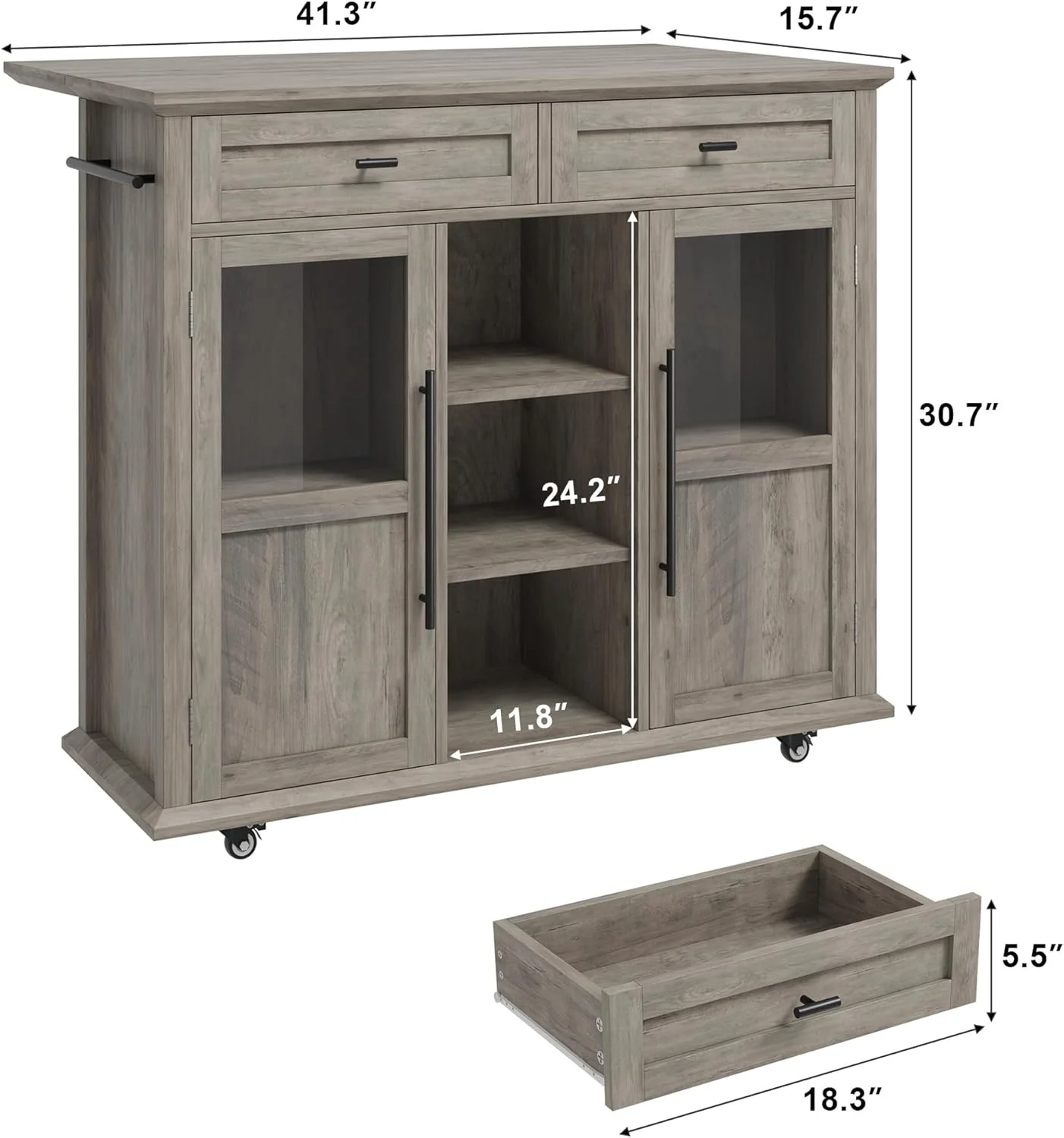 - ��Ample Storage & Organization�� Featuring 2 glass-door cabinets with 4 interior shelves and 2 large pull-out drawers, this foldable kitchen island cart provides the extra prep area, mobile serving space, or additional storage you need, adapting effortlessly to your kitchen requirements.