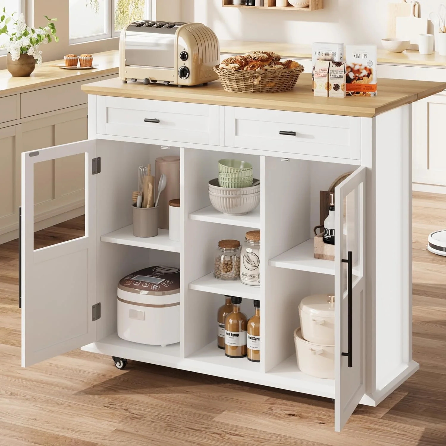 The cart features 2 glass-door cabinets complete with 4 interior shelves, along with 2 large pull-out drawers, allowing you to organize your kitchen essentials efficiently. Whether you need extra prep space, a mobile serving cart, or additional storage, this foldable kitchen island cart adapts to your needs seamlessly.