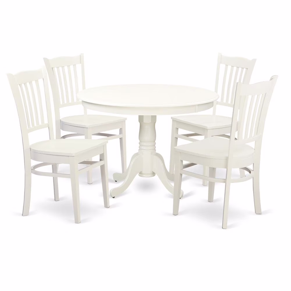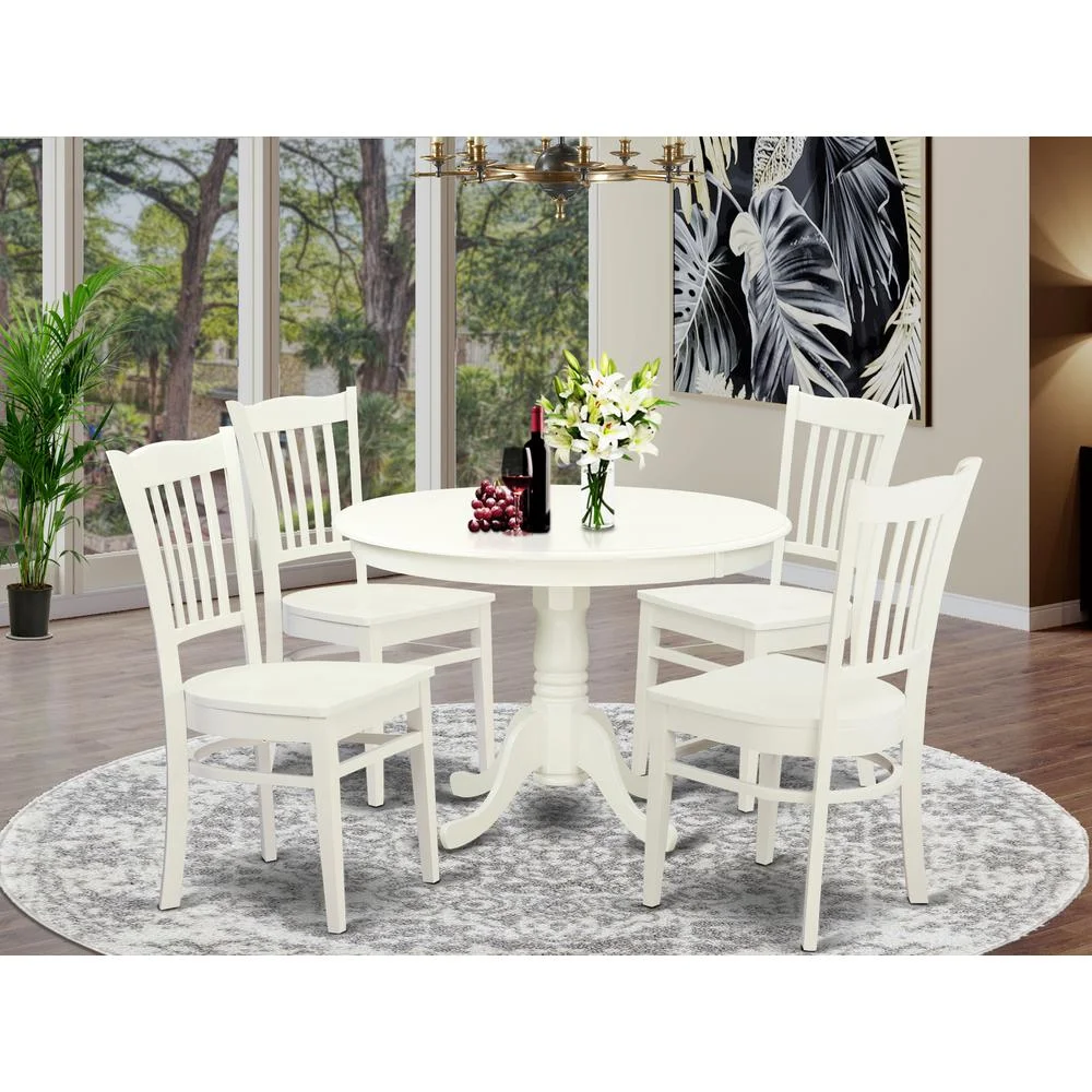 Smooth antique dining room table set brings fashion to all kitchen or morning meal nook. This beautiful small dining table and kitchen chairs set is finish in an elegant linen white color. The 36 inch circular table top with beveled sides is pristine enough to demonstrate fine China and sturdy enough for any family barbecue. Supported by a fashionable 30 inch pedestal stand that features four stylishly designed legs. Exquisite, slatted, high backed dining chairs feature flowing contours from top to bottom and classy detailing. 5 pc set with one kitchen table and four wood seat kitchen chairs in a rich linen white.