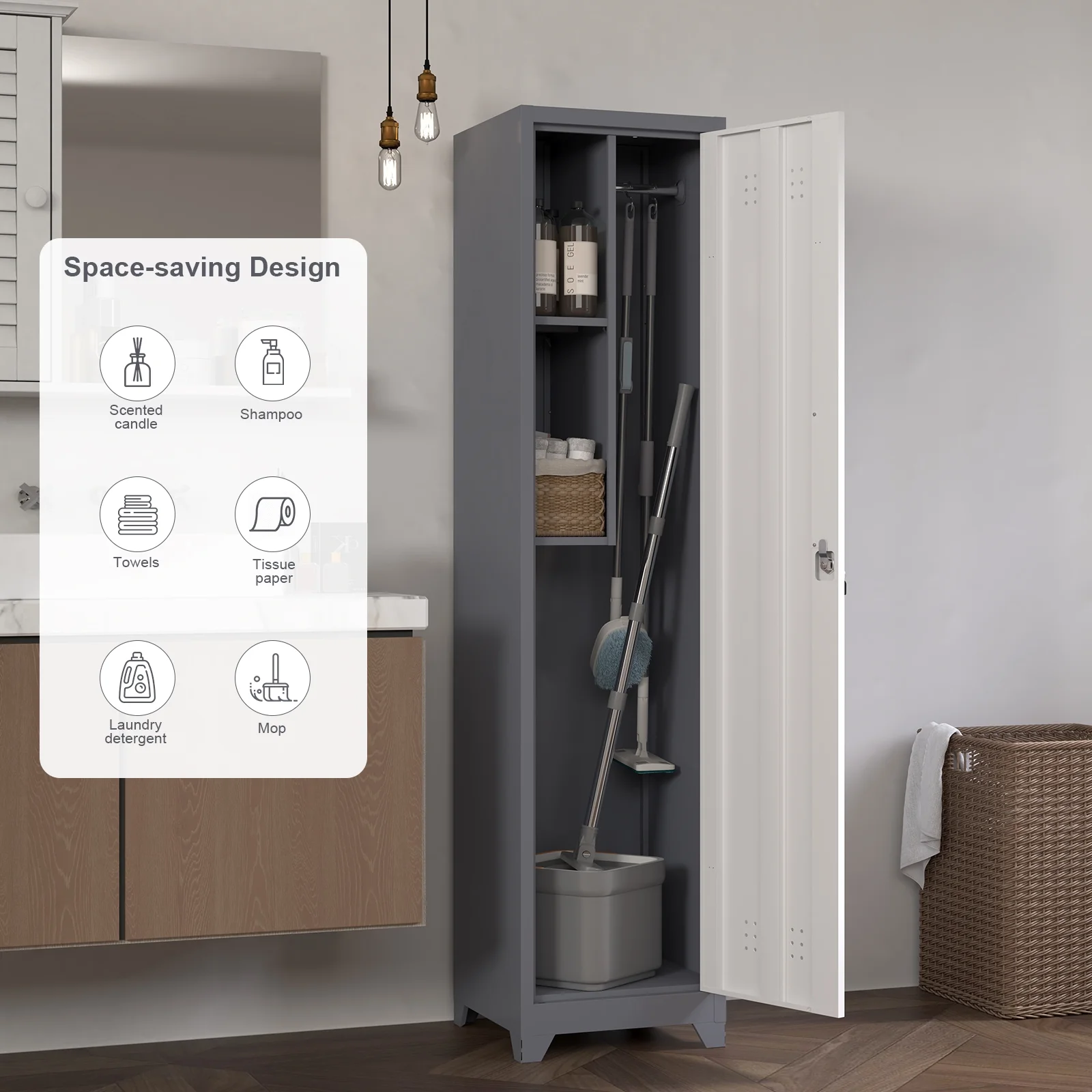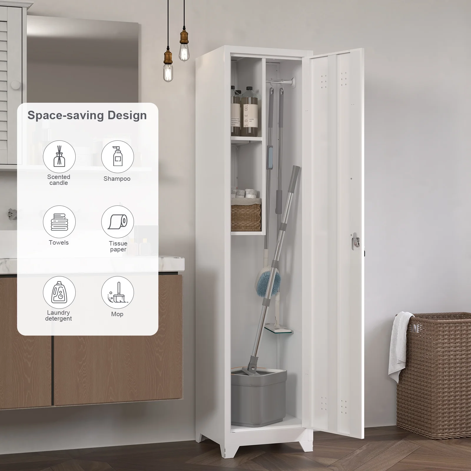 Marcree 65" H Slim Broom Storage Cabinet, Metal Broom Closet with Shelves and Hanging Rod, Utility Cabinet for Brooms and Mops, Tall Cleaning Storage Cabinet for Kitchen, Pantry, Office, Shop, Garage