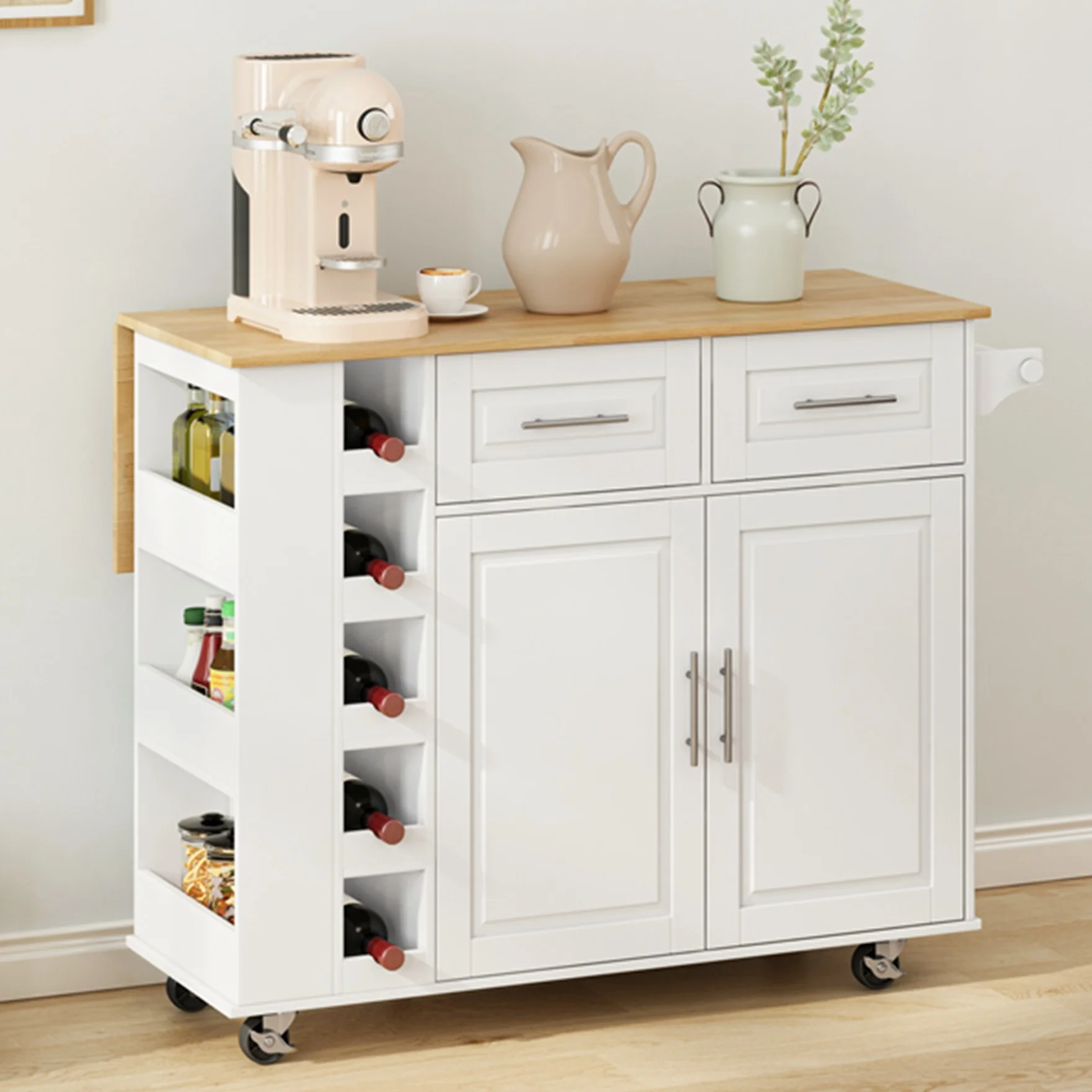 Movable Kitchen Island Cart with 2 Door Cabinet, 2 Drawers and Drop Leaf Top, Island Table with Spice Rack, Towel Holder, Wine Rack and Wheels, Kitchen Storage Cabinet, White