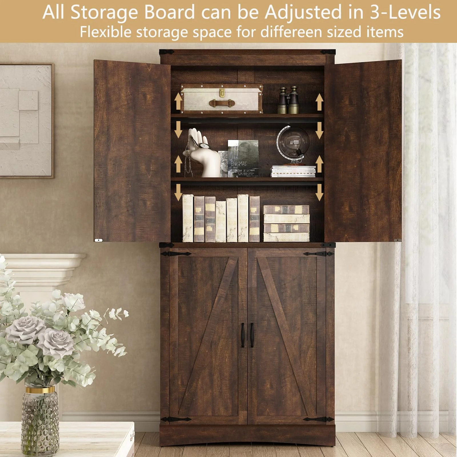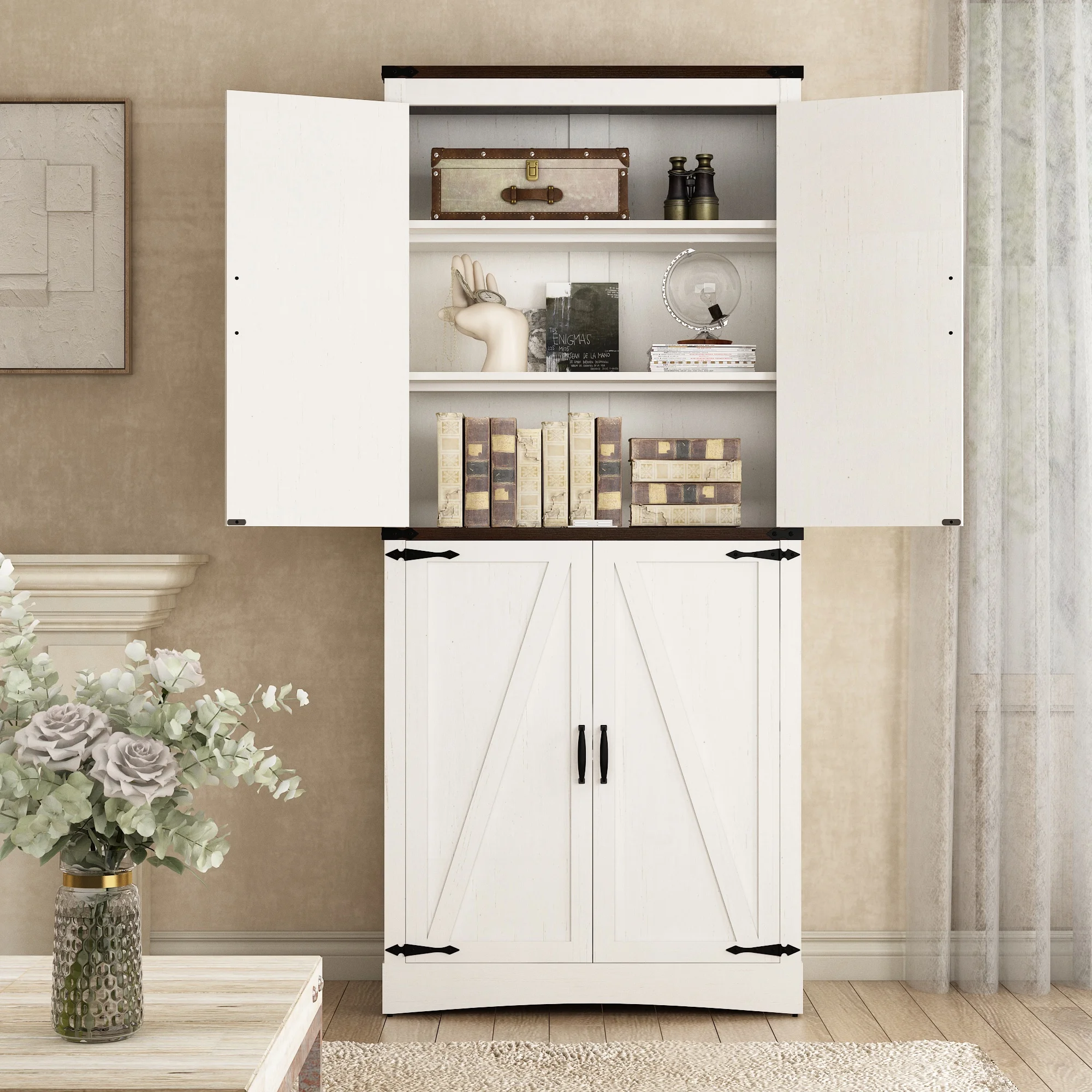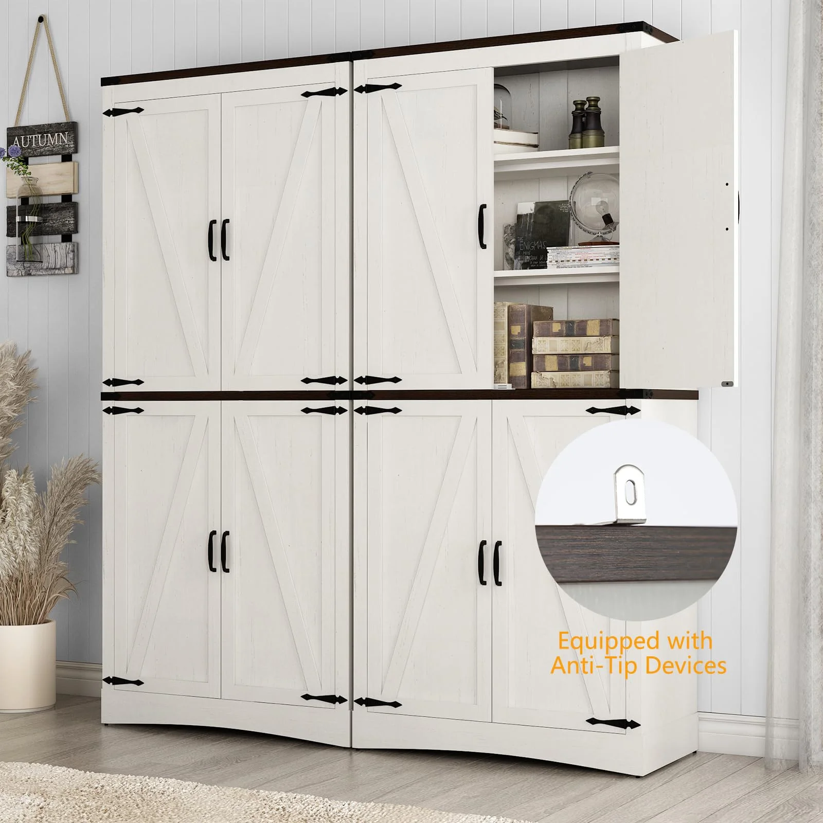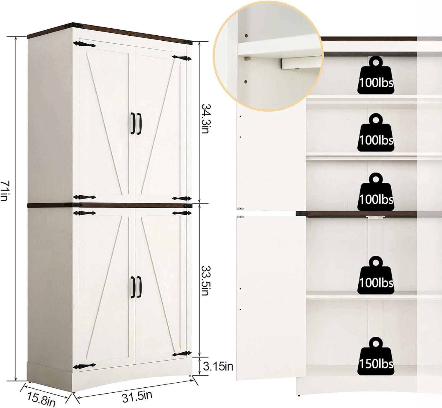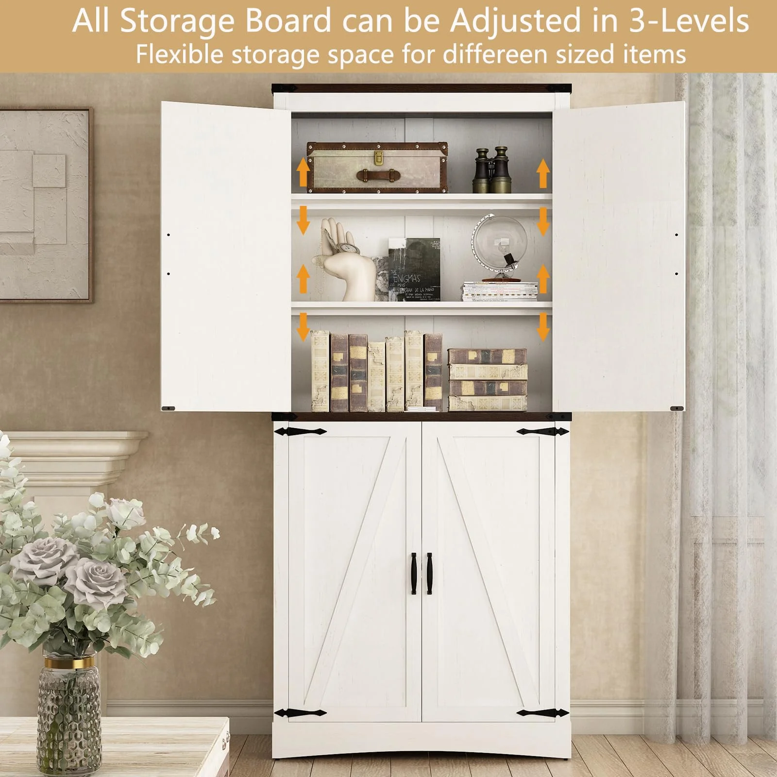 71" Tall Farmhouse Kitchen Pantry Cabinet, 5 Layers Storage Cabinet with Adjustable Shelves, Farmhouse Pantry Cabinet with 4 Barn Doors for Kitchen, Dining Room, Bathroom, Living Room, Rustic White
