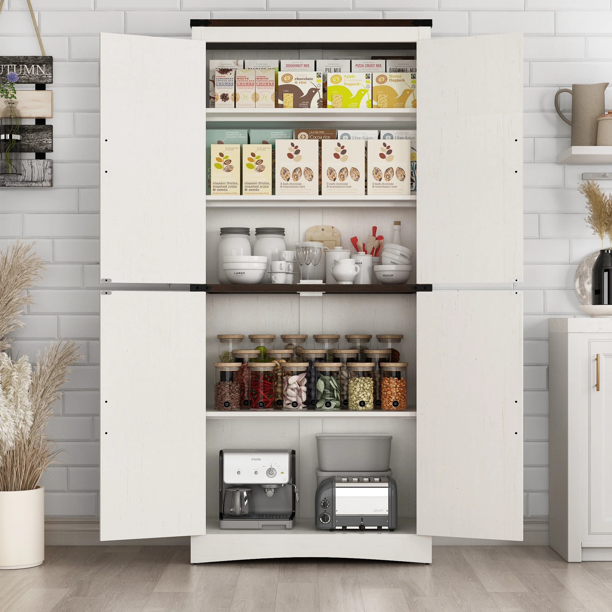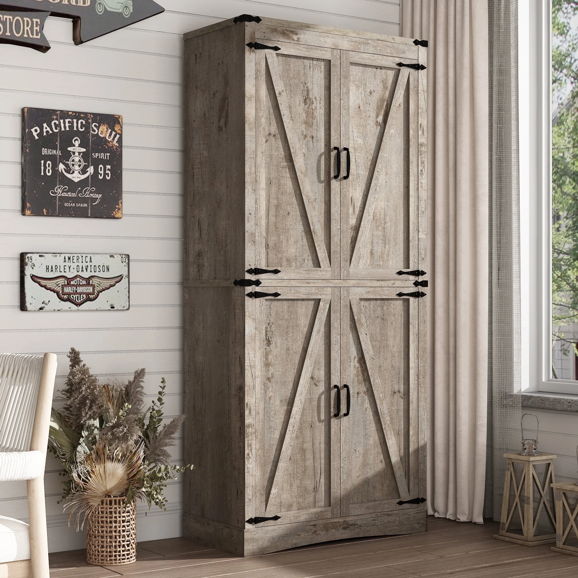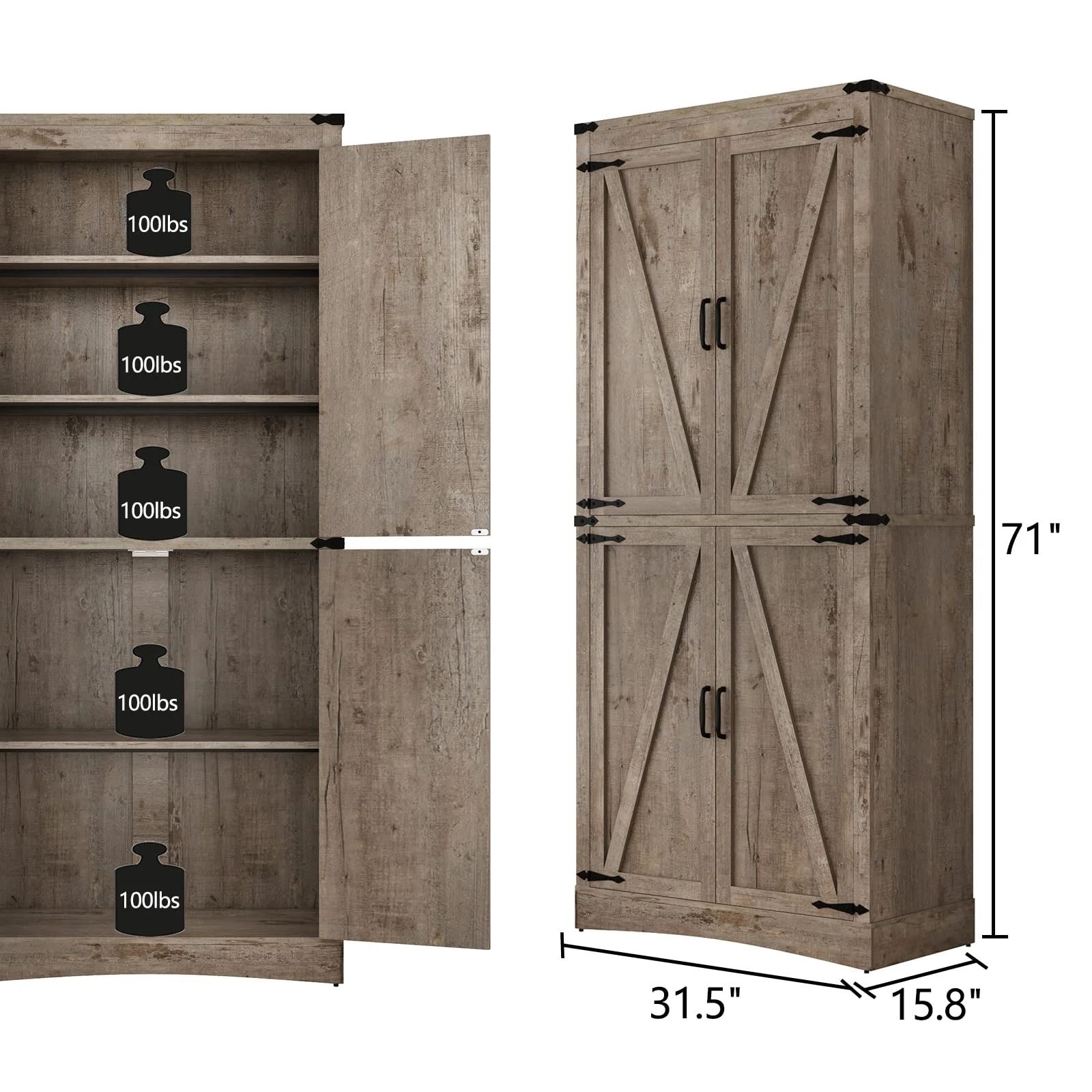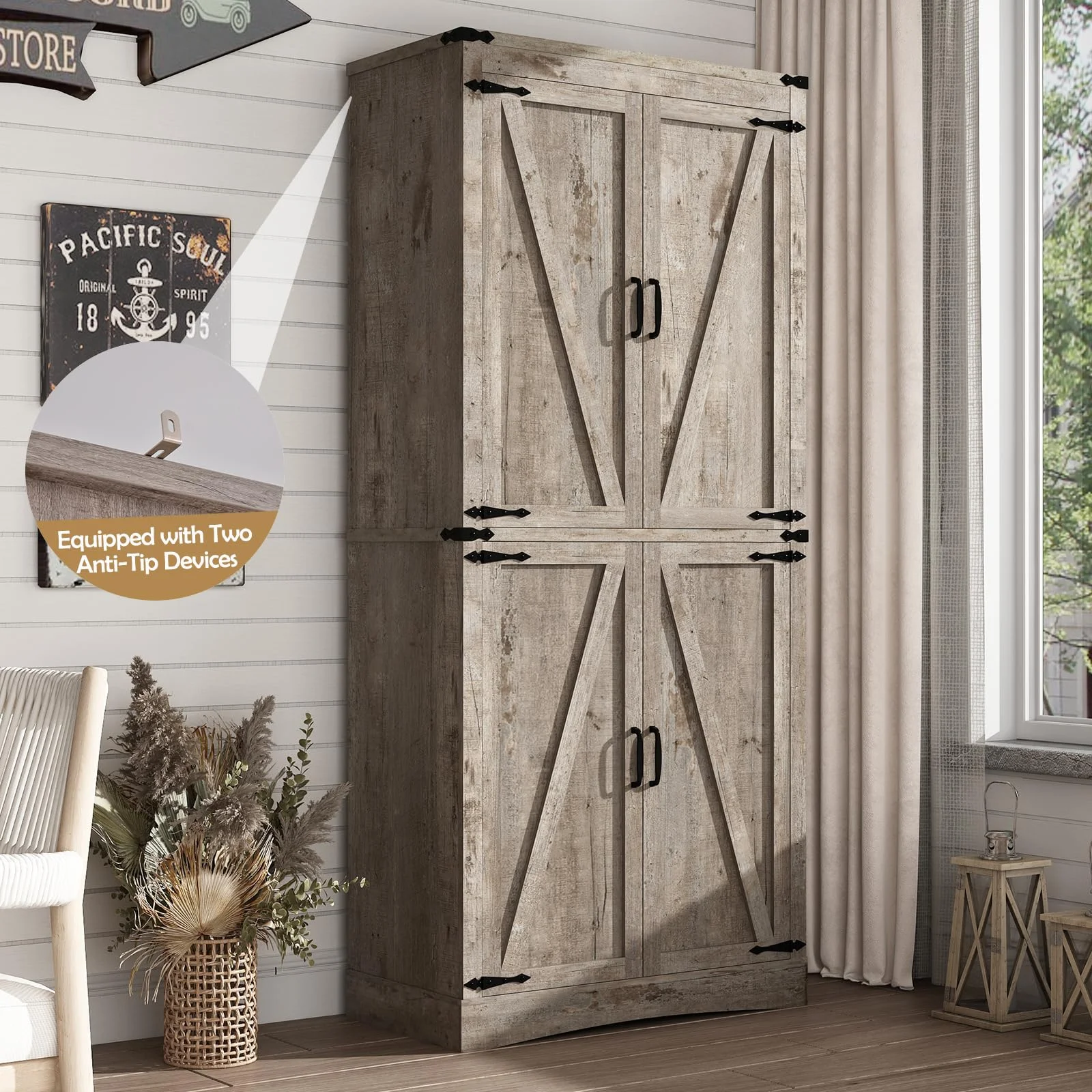 71" Tall Farmhouse Kitchen Pantry Cabinet, 5 Layers Storage Cabinet with Adjustable Shelves, Farmhouse Pantry Cabinet with 4 Barn Doors for Kitchen, Dining Room, Bathroom, Living Room, Rustic White