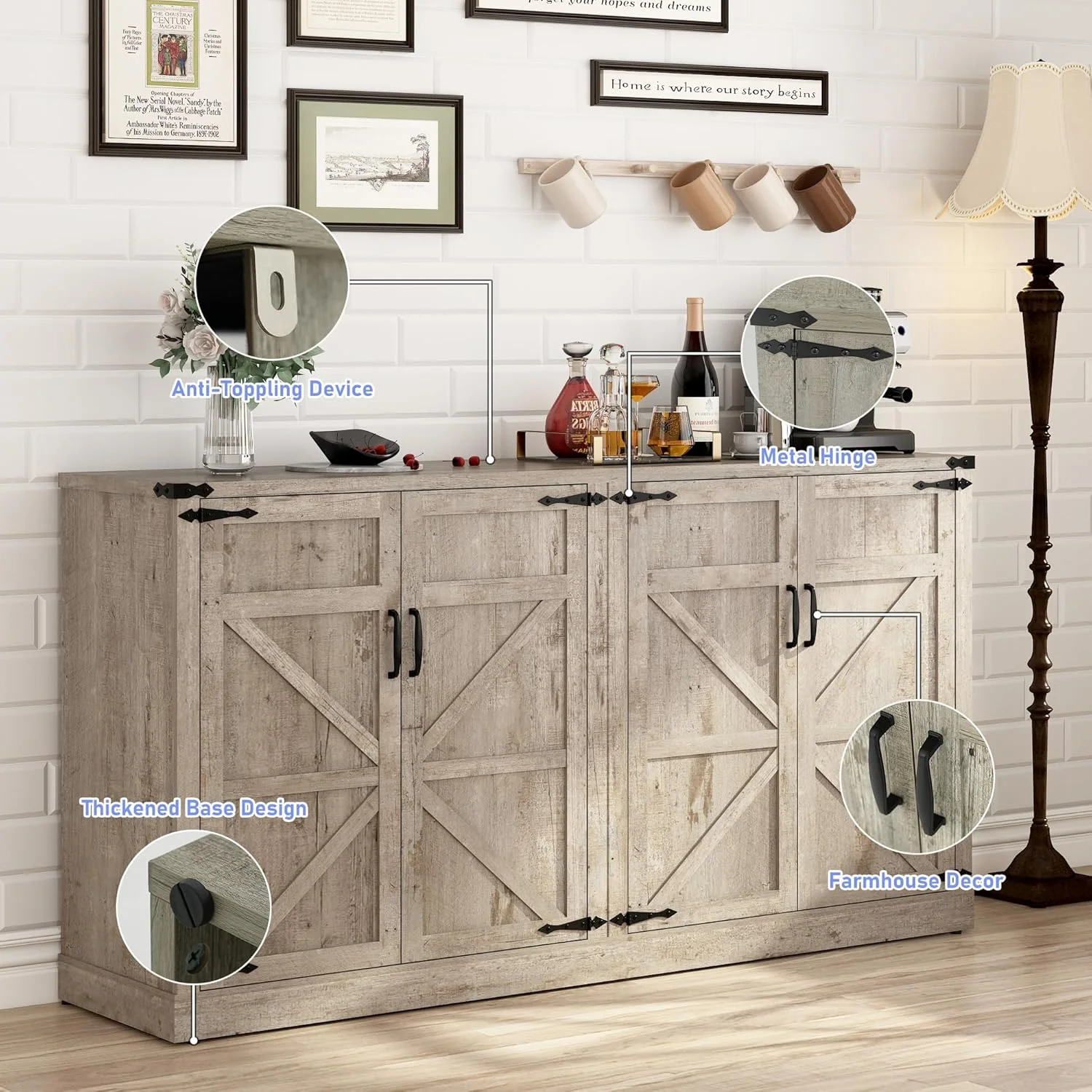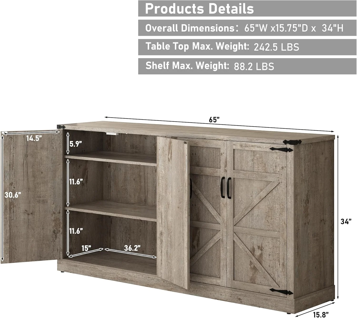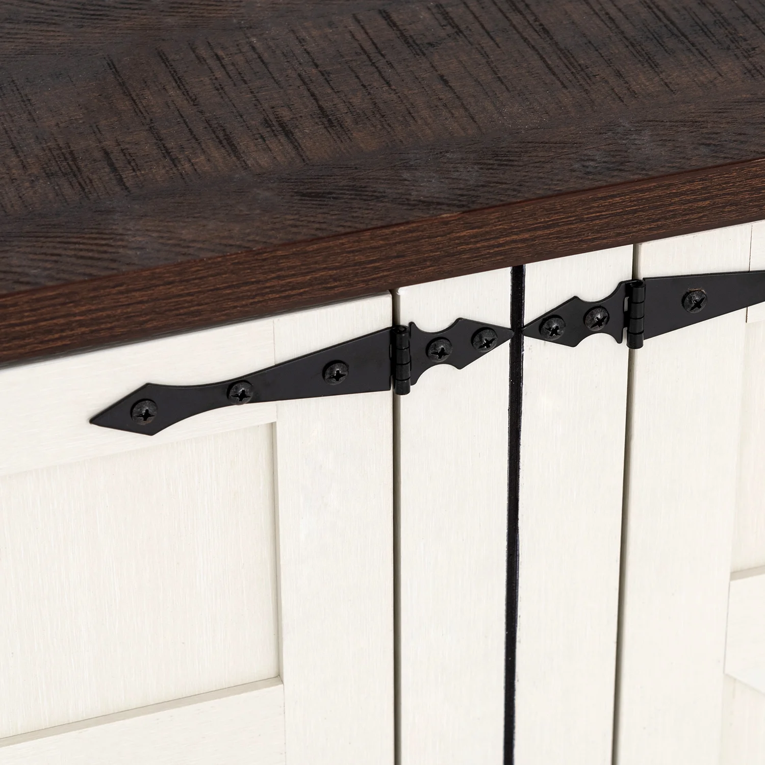 Farmhouse Storage Cabinet :Our barn door storage cabinet have beautiful metal buckles installed in every corner.In order to be closer to the natural texture, our storage cabinets use distressed knife-cut grain craftsmanship, chic industrial and farmhouse styles, unique barn 4 door designs, and antique board finishes to creating a comfortable and retro atmosphere.