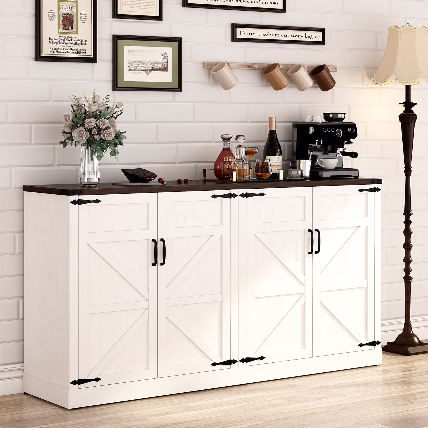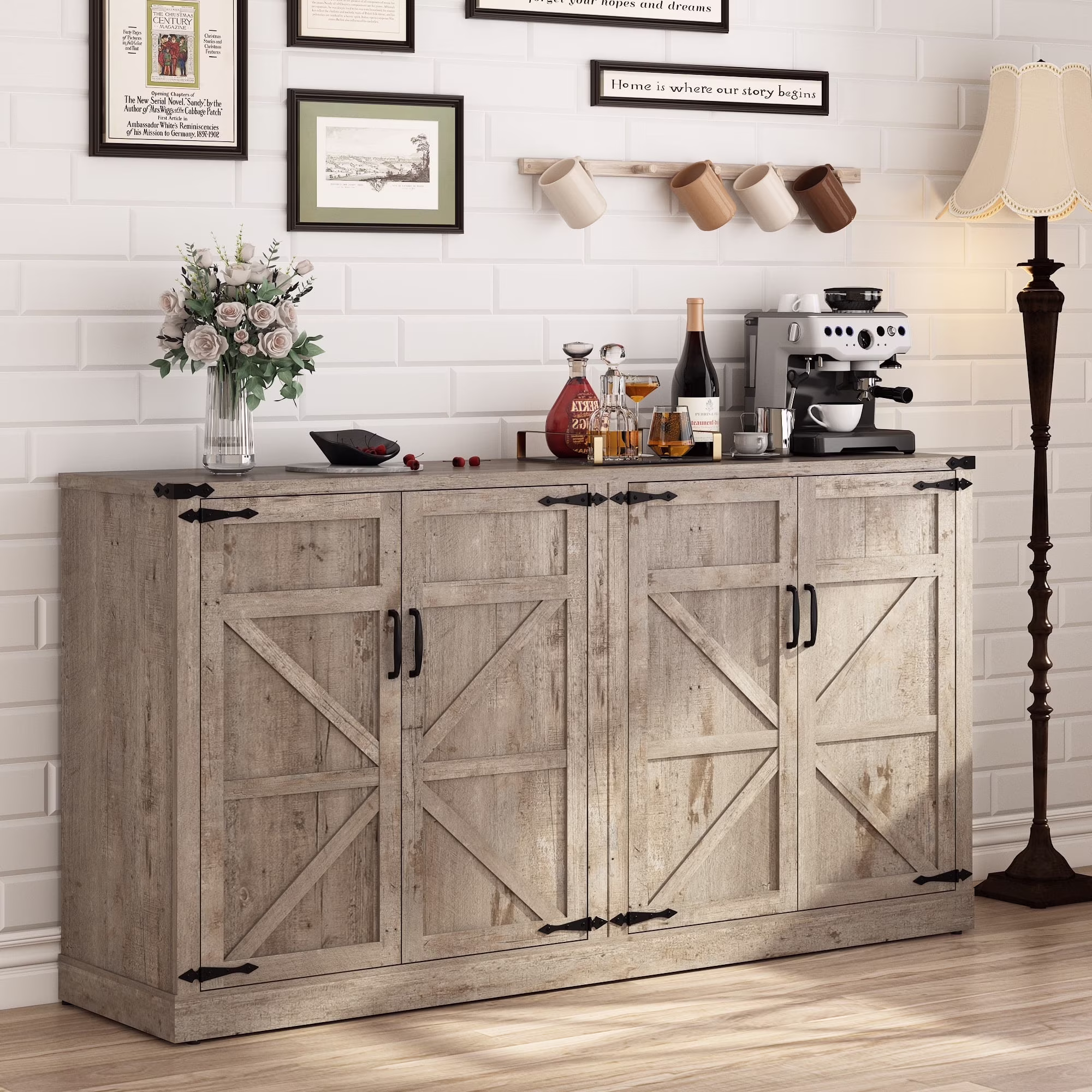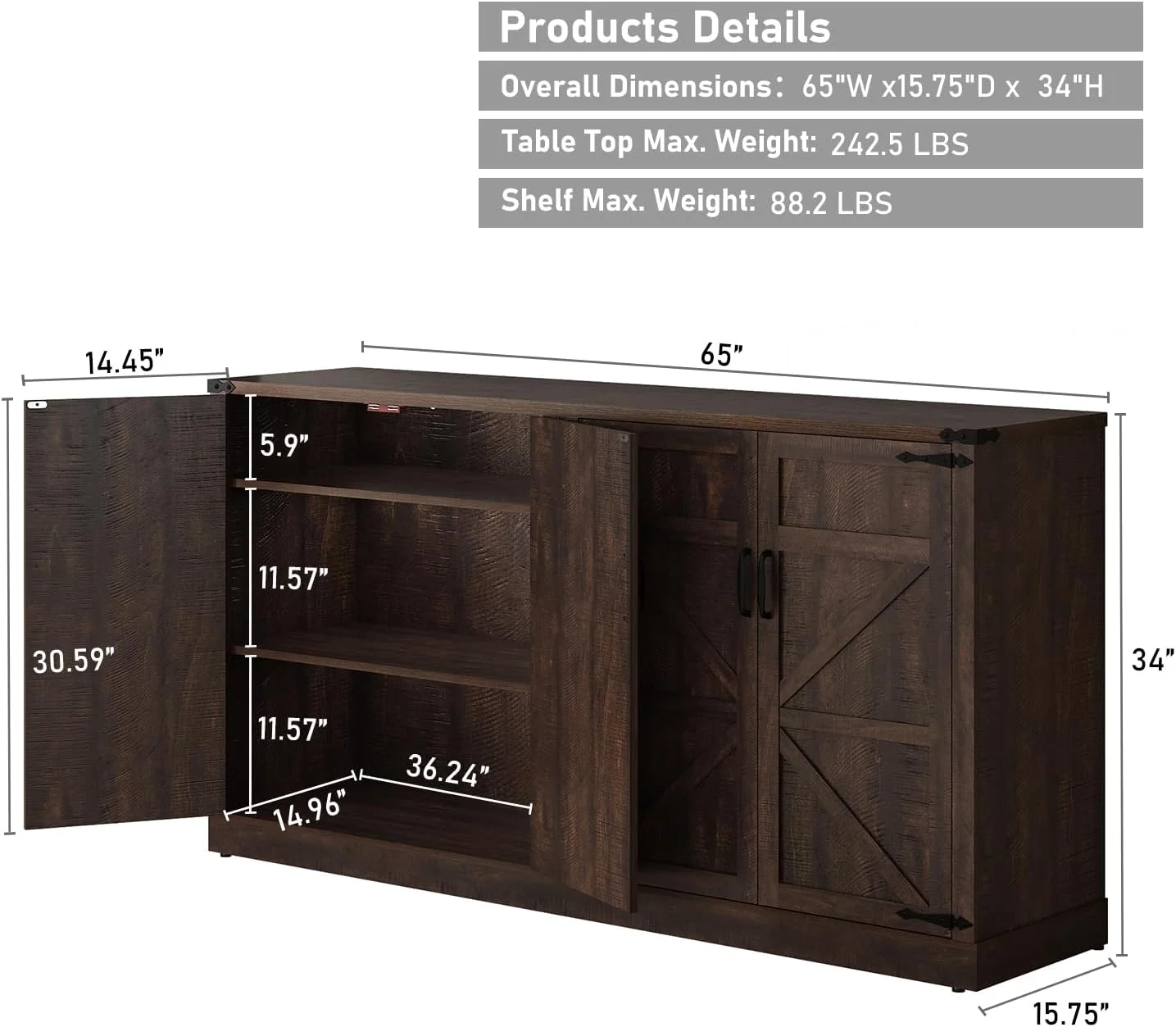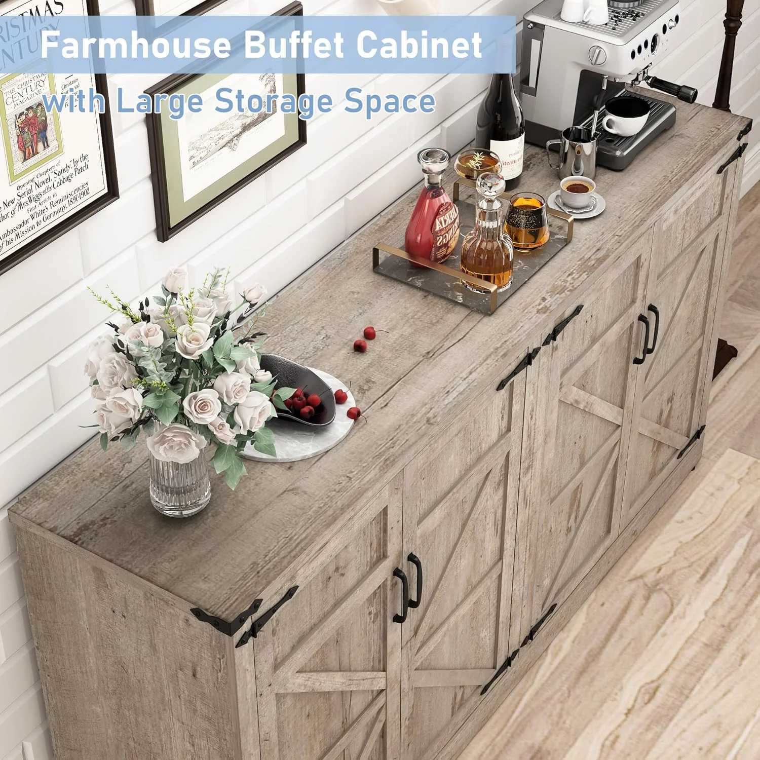 Farmhouse Storage Cabinet :Our barn door storage cabinet have beautiful metal buckles installed in every corner.In order to be closer to the natural texture, our storage cabinets use distressed knife-cut grain craftsmanship, chic industrial and farmhouse styles, unique barn 4 door designs, and antique board finishes to creating a comfortable and retro atmosphere.