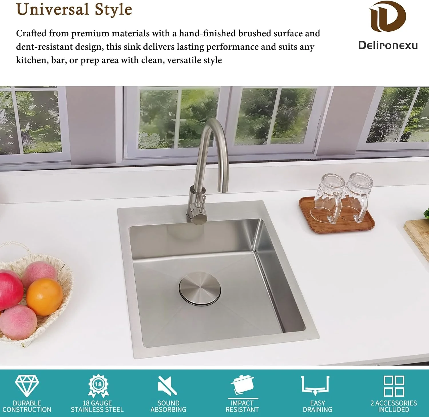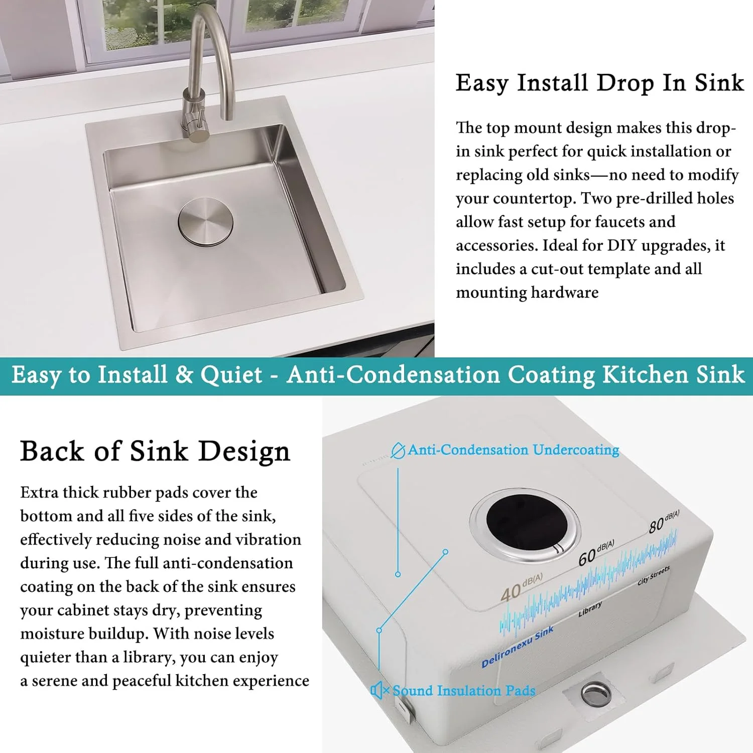 - ��Ultra-Quiet Small Kitchen Sink��:Extra-thick sound-dampening pads covering over 80% of these single bowl kitchen sinks effectively reduce noise and vibration during use for a quieter, more comfortable experience. The small kitchen sink design features a full-cover anti-condensation coating to prevent moisture buildup, keeping your cabinet dry and clean. Enjoy peace of mind in compact kitchens, whether rinsing glasses, prepping food, or cleaning up��perfect as a prep sink or wet bar sink.
