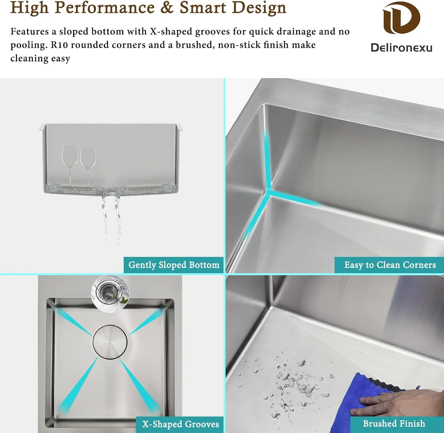 - ��Fast Drainage & Easy to Clean Bar Sink��:This wet bar sink features a gently sloped bottom and engineered X-shaped grooves for fast water flow, preventing pooling and ensuring complete drainage. The R10 tight-radius corners make cleaning effortless, eliminating hard-to-reach buildup areas. The commercial-grade brushed finish on this bar sink not only hides scratches but also helps keep the stainless steel bar sink looking new longer.