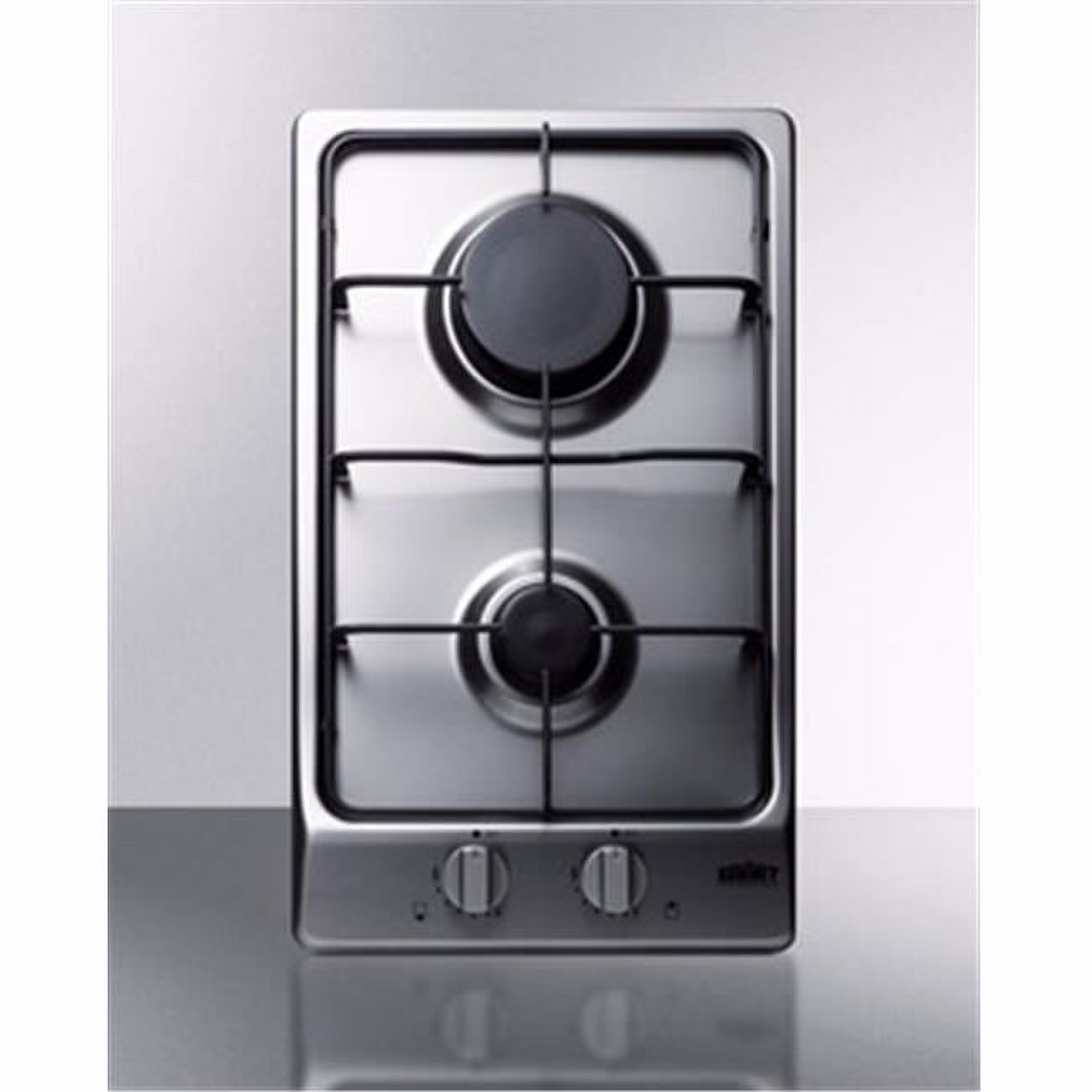 The is a two-burner gas cooktop with a stainless steel surface that offers lasting durability and modern style. Continuous cast iron grates make it easier to cook and clean. This model features a rear 10,000 BTU Sabaf burner and front 3,550 BTU Sabaf burner to ensure quality heating that meets your needs. The surface features a unique curved design that adds to the attractive look.