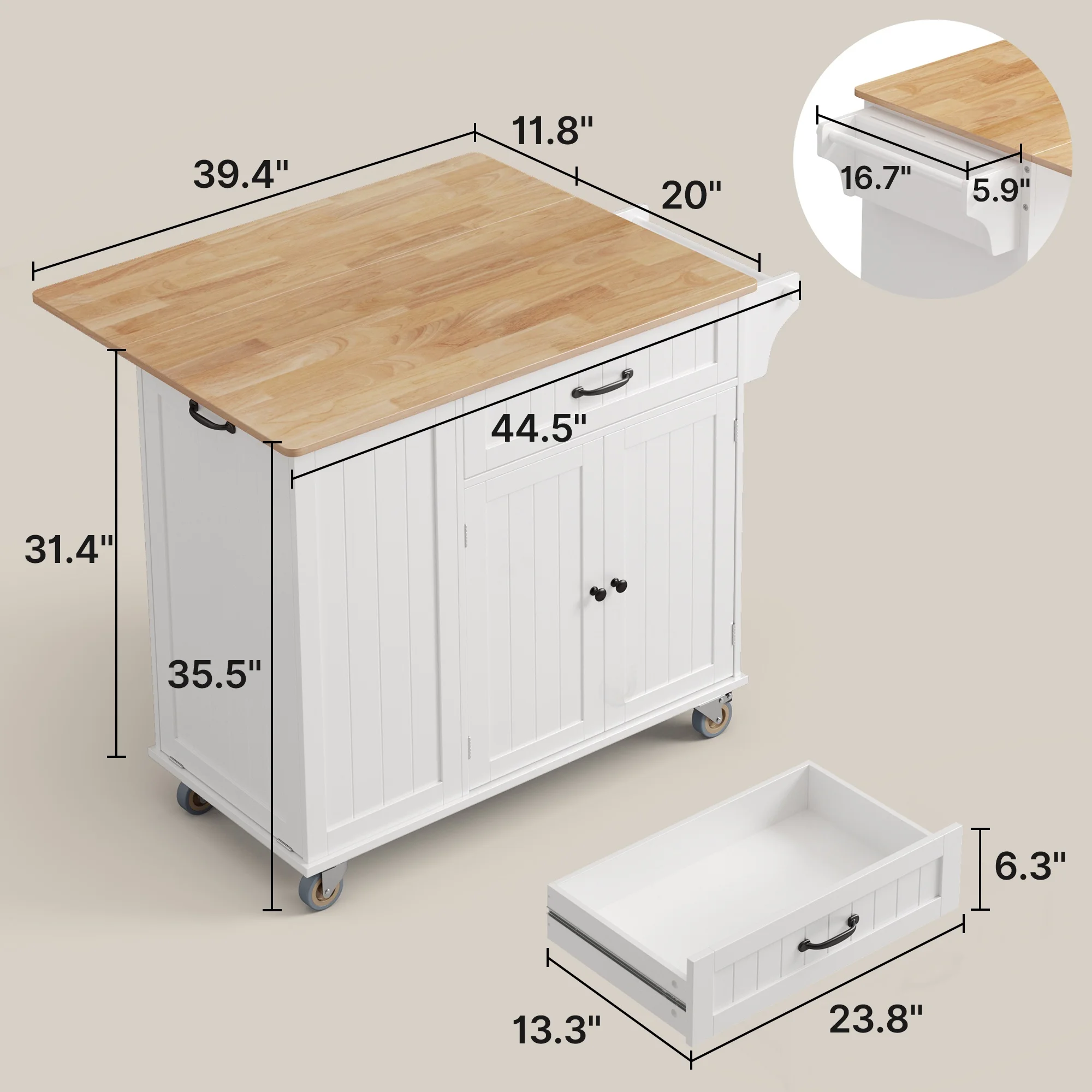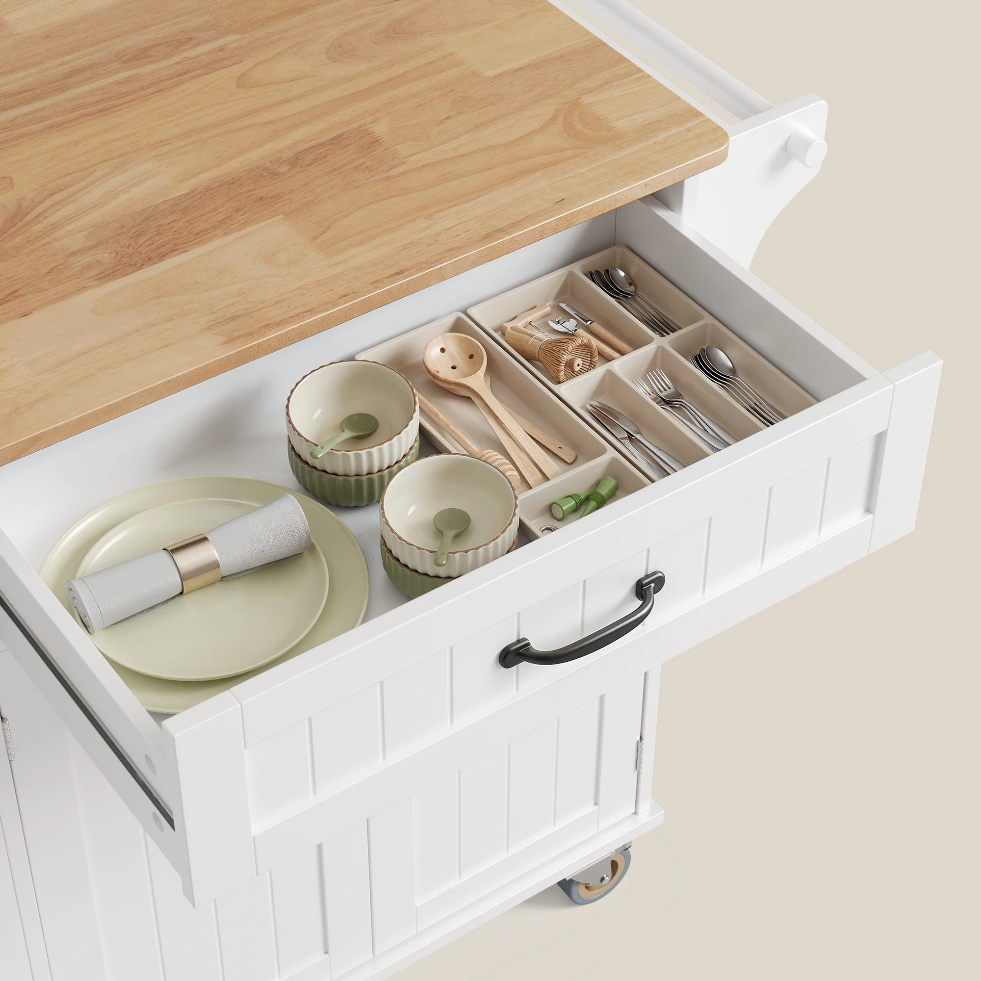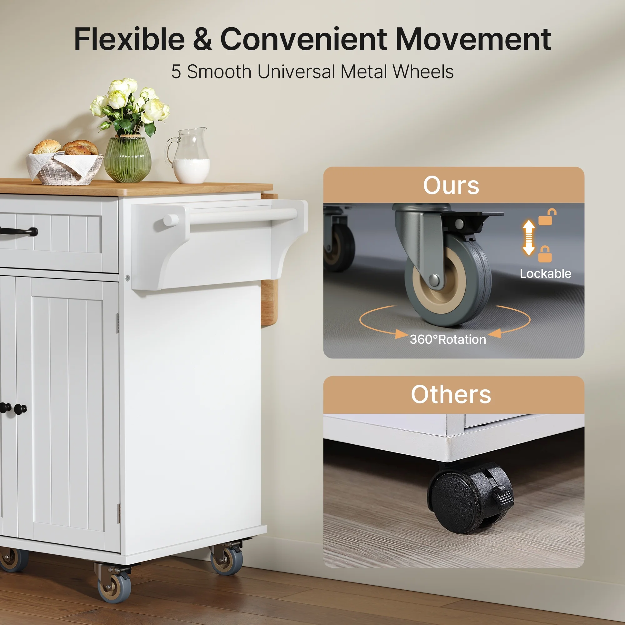 Noelse Rolling Kitchen Island with Drop Leaf Table and Hidden Trash Cabinet, Mobile Kitchen Cart with Storage Drawer, Adjustable Shelves & Rubberwood Countertop on Wheels, White