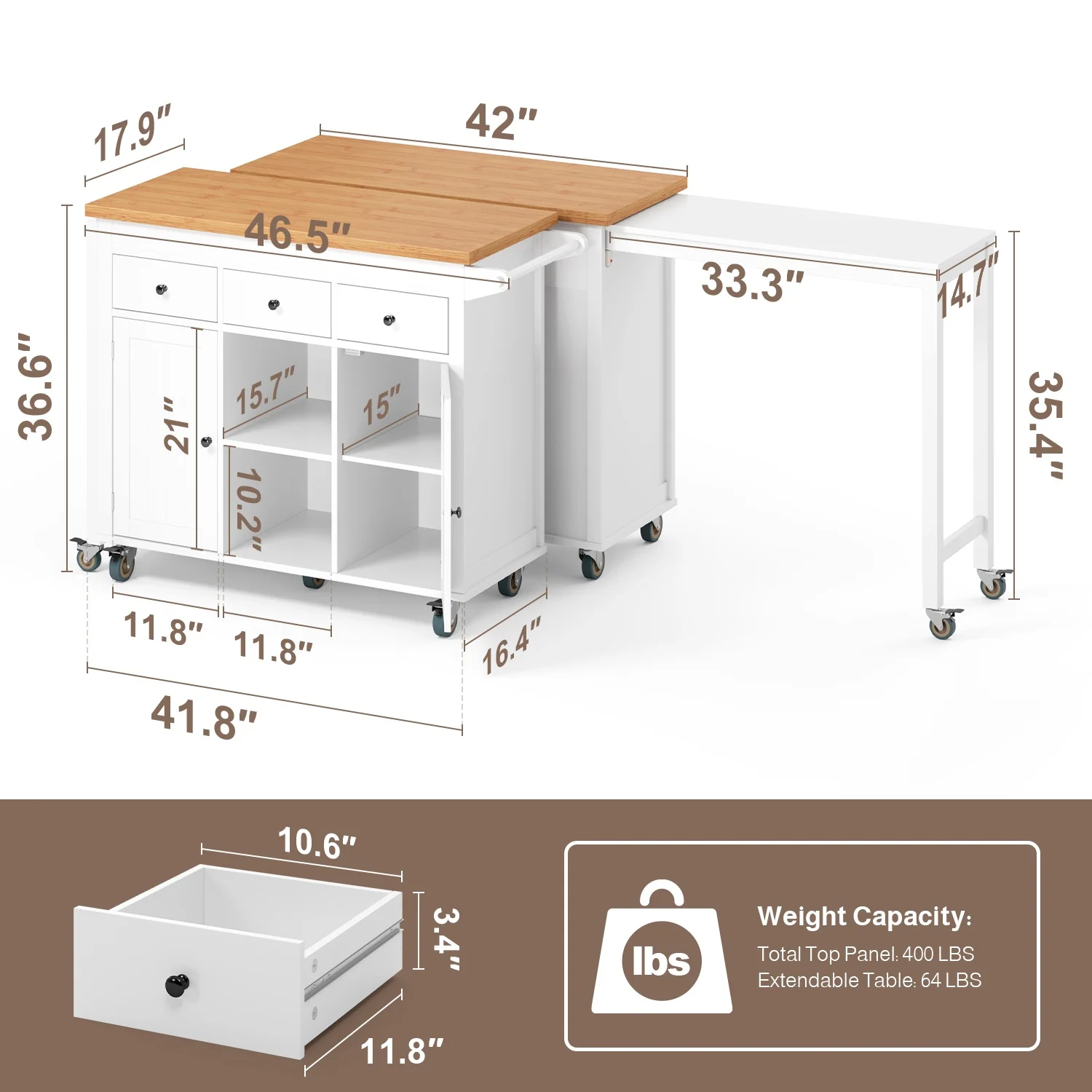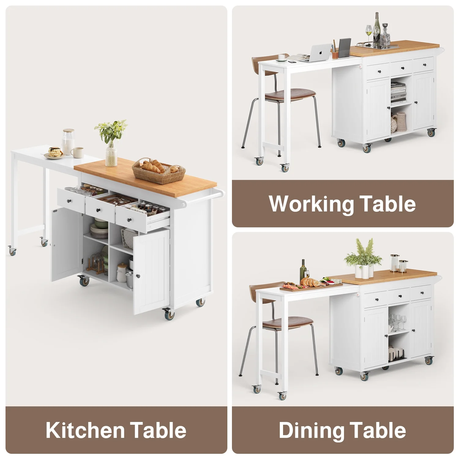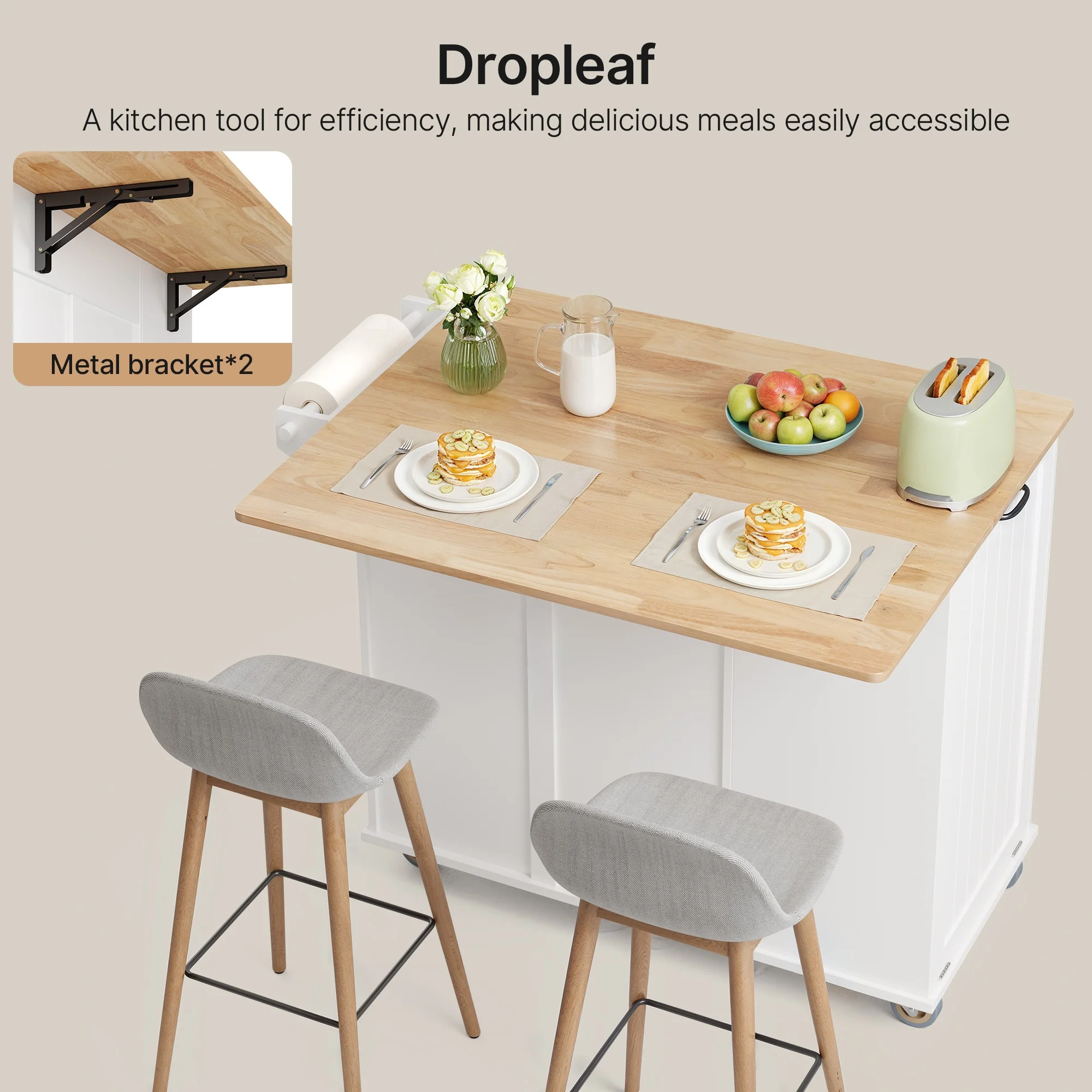 Noelse Rolling Kitchen Island with Drop Leaf Table and Hidden Trash Cabinet, Mobile Kitchen Cart with Storage Drawer, Adjustable Shelves & Rubberwood Countertop on Wheels, White