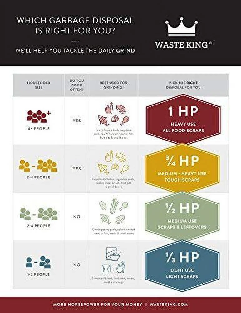 Waste King L-1001: 1/2 horsepower garbage disposal with pre-installed power cord and sound insulation. Energy efficient permanent magnet motor and stainless steel swivel impellers help reduce jamming. Fast and easy to install with a removable splashguard that is easy to clean and replace. Rust and corrosion-proof glass-filled nylon grind chamber and drain housing. Continuous feed technology. Front-mounted reset button for easy use. Safe to use with properly-sized septic tanks.