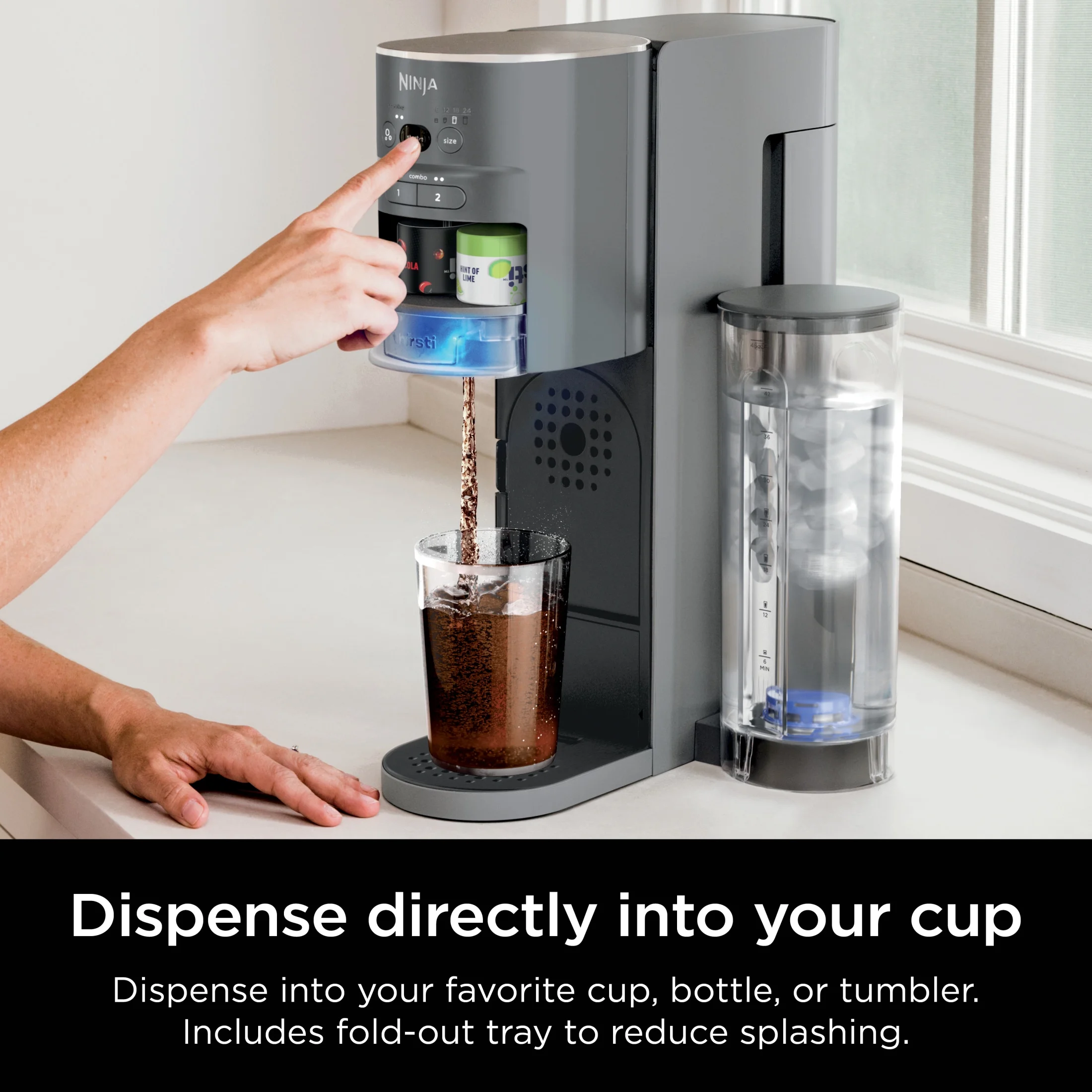 - INCLUDES: Ninja Thirsti Station, 48oz Removeable Temperature Sensitive Water Reservoir, 60L CO2 Cylinder, Variety of Flavored Water Drops