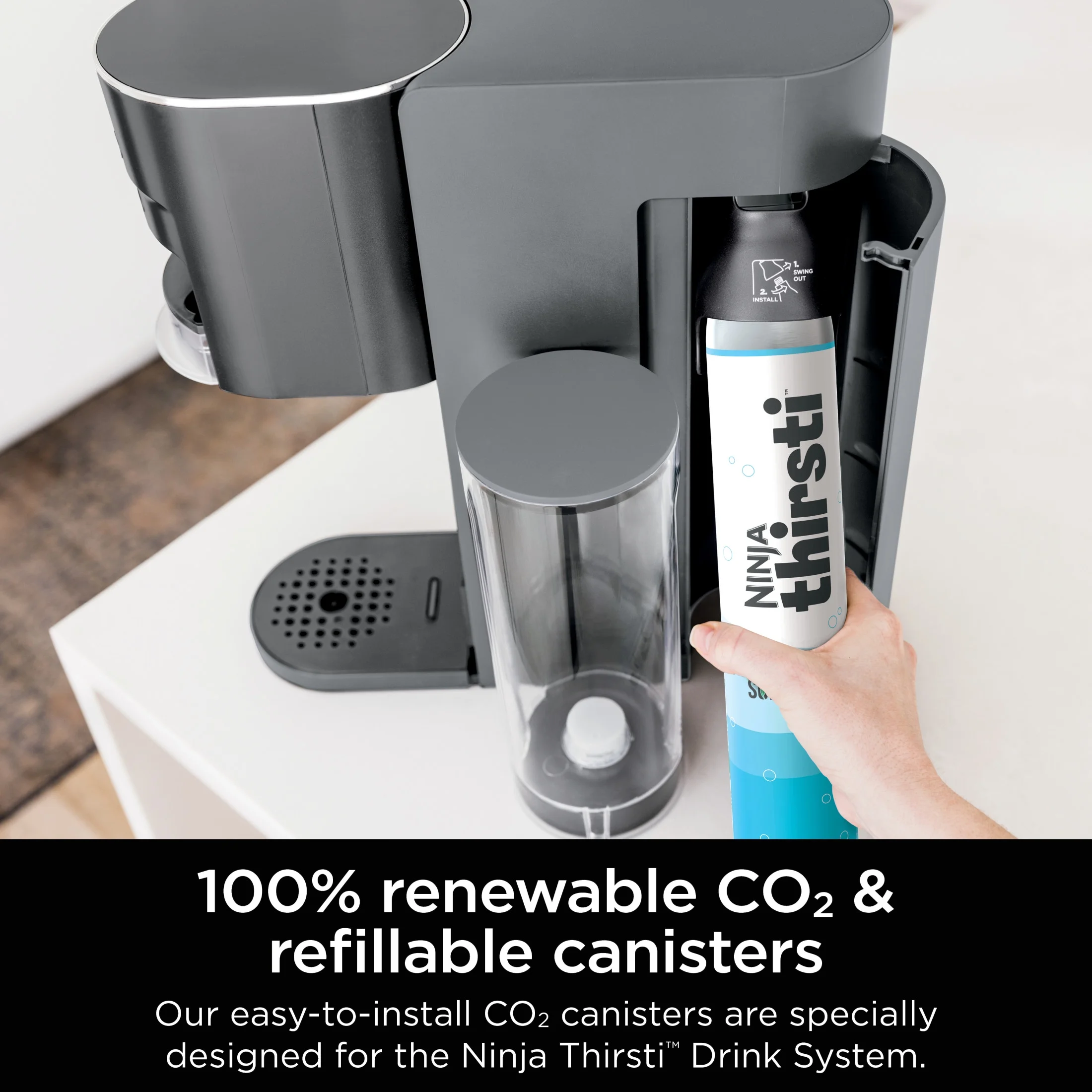 - CO2 MADE SIMPLE: Easy-to-install canisters. The Ninja Thirsti Drink System is designed for use EXCLUSIVELY with the Ninja Thirsti 60L CO2 Canisters to provide more efficient carbonation vs. leading competitors. Using other competitor CO2 canisters in the Ninja Thirsti Drink System may not be compatible or safe.