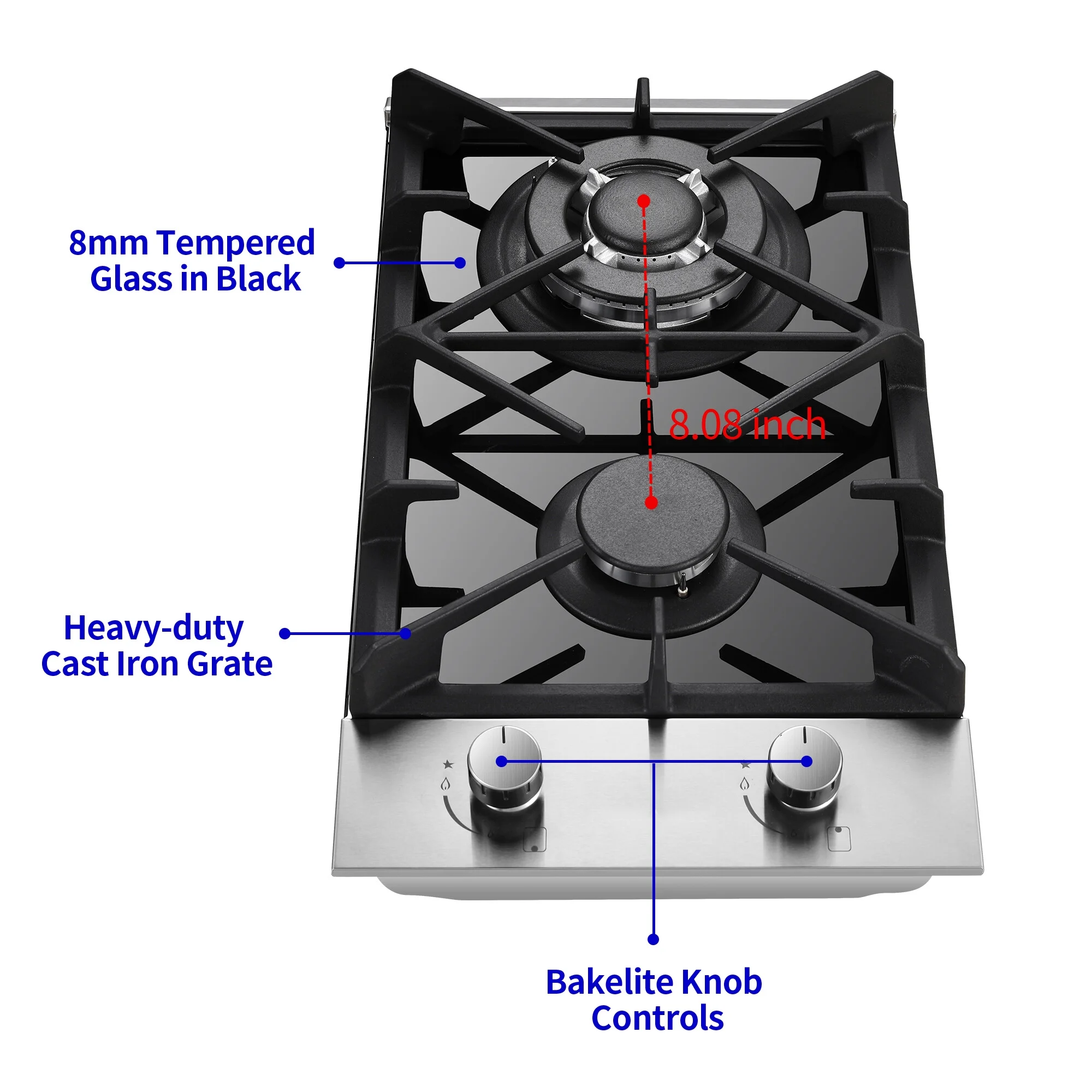 2 Burners Power: 10,500 BTU + 5,000 BTU