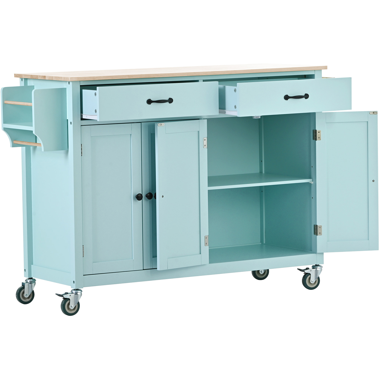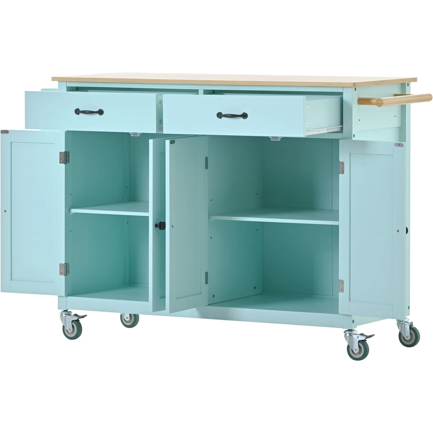 The Kitchen Island Cart with Solid Wood Top and Locking Wheels is a must-have for any kitchen. This versatile cart has a 4-door cabinet with adjustable shelves that provides ample storage for pots, pans and other kitchen essentials.The Moveable Kitchen Island Cart's two spacious drawers provide additional storage for utensils, towels and more. The solid wood top provides a spacious and durable work surface for food preparation, while the built-in spice rack and towel rack keep your kitchen organized.Rolling Bar Cart The cart has four sturdy wheels, two of which can be locked, ensuring stability and maneuverability as you move the cart around the kitchen. The frame of the trolley is made of solid wood to ensure durability. The painted finish on the cart protects it from everyday wear and tear, and the mint green color will add a splash of color to any kitchen d��cor.
