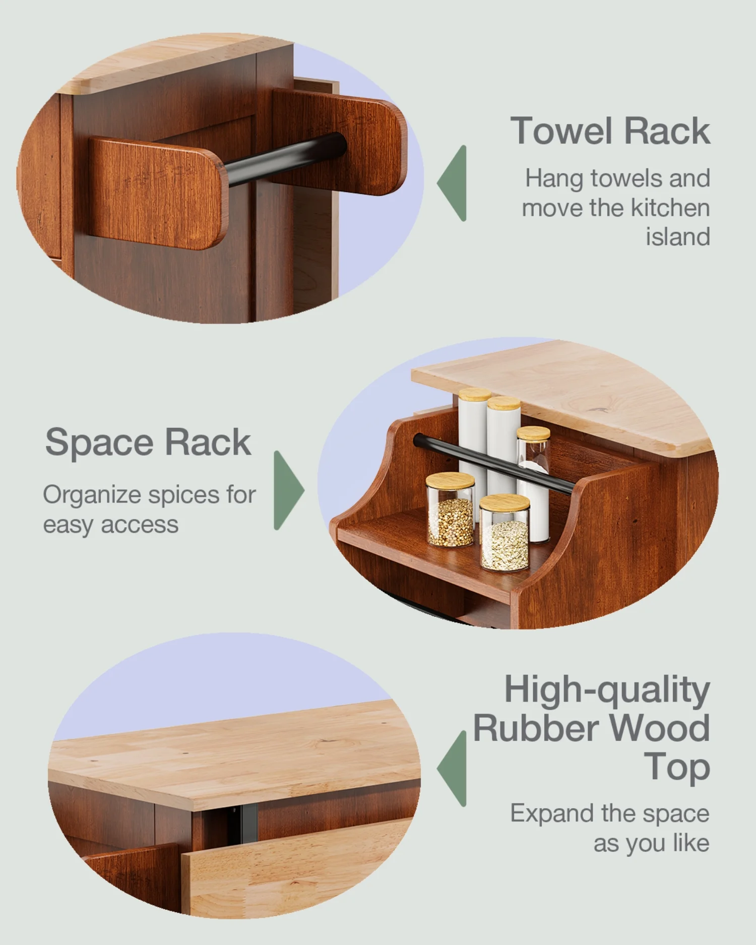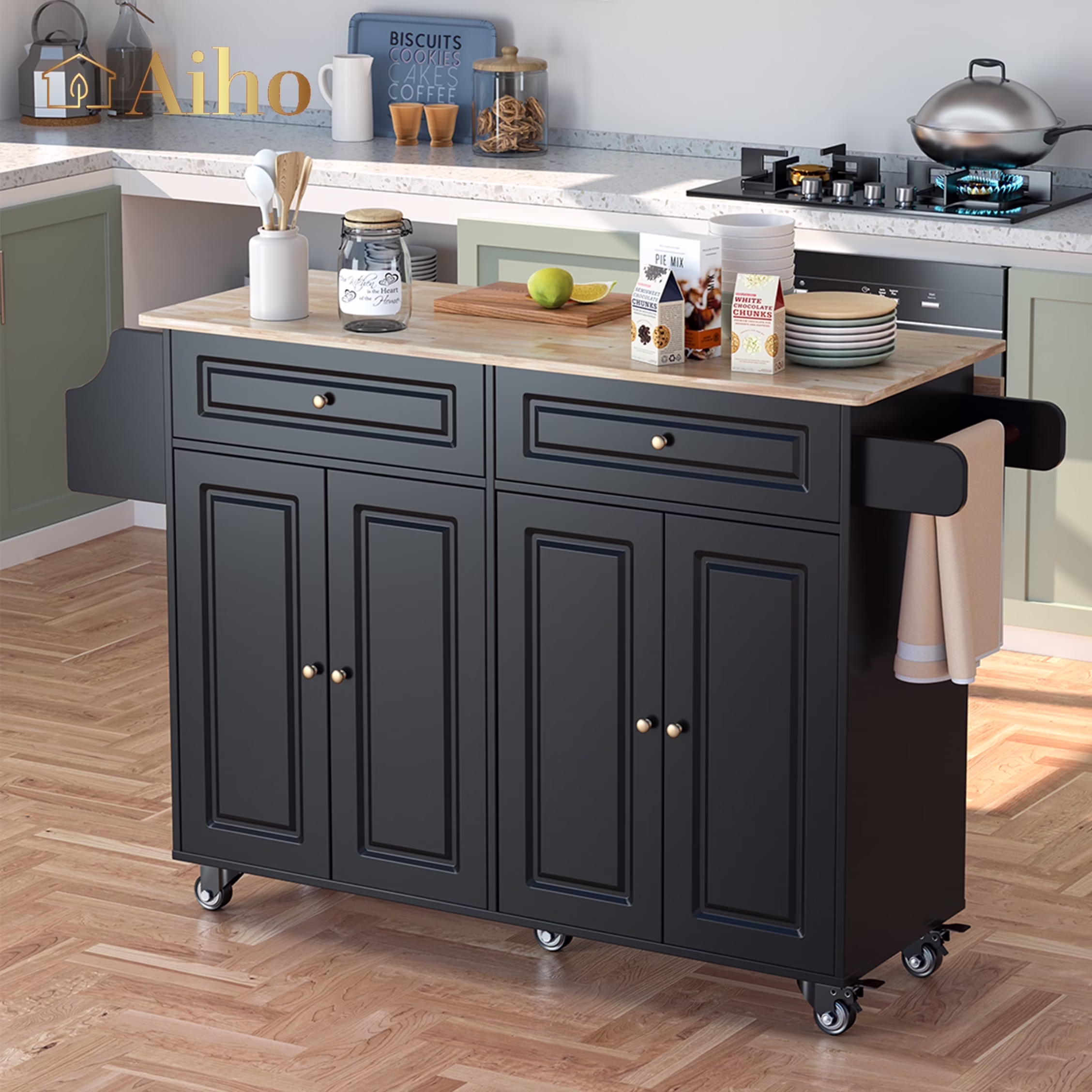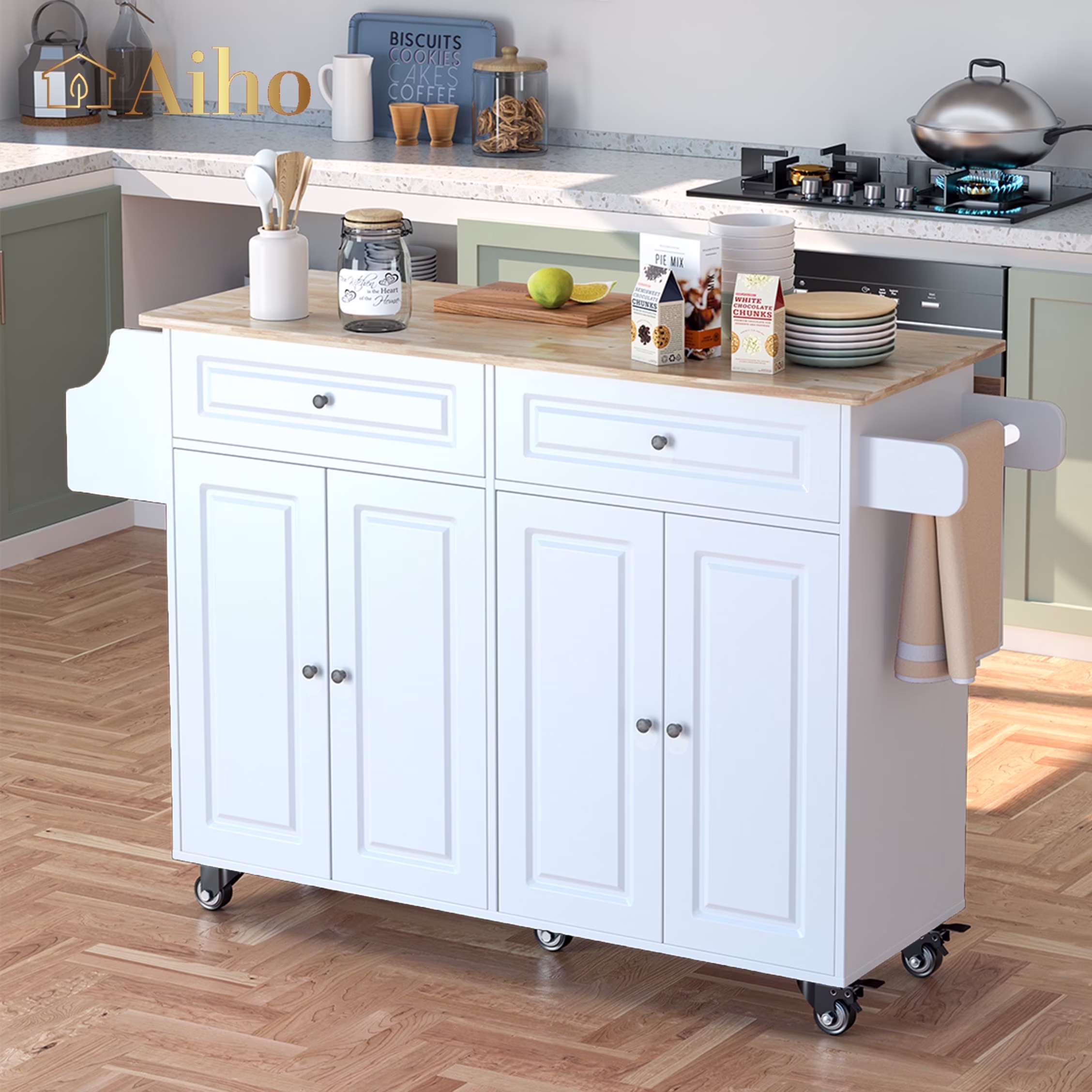 - ??��EXTRA-LARGE STORAGE KITCHEN ISLAND�� �C The Aiho Kitchen Island features 2 storage cabinets and 2 drawers for easy access, plus a towel rack and a spice storage area on the side. It provides ample space to store various kitchen tools and utensils, helping keep your kitchen and dining area neat and organized.