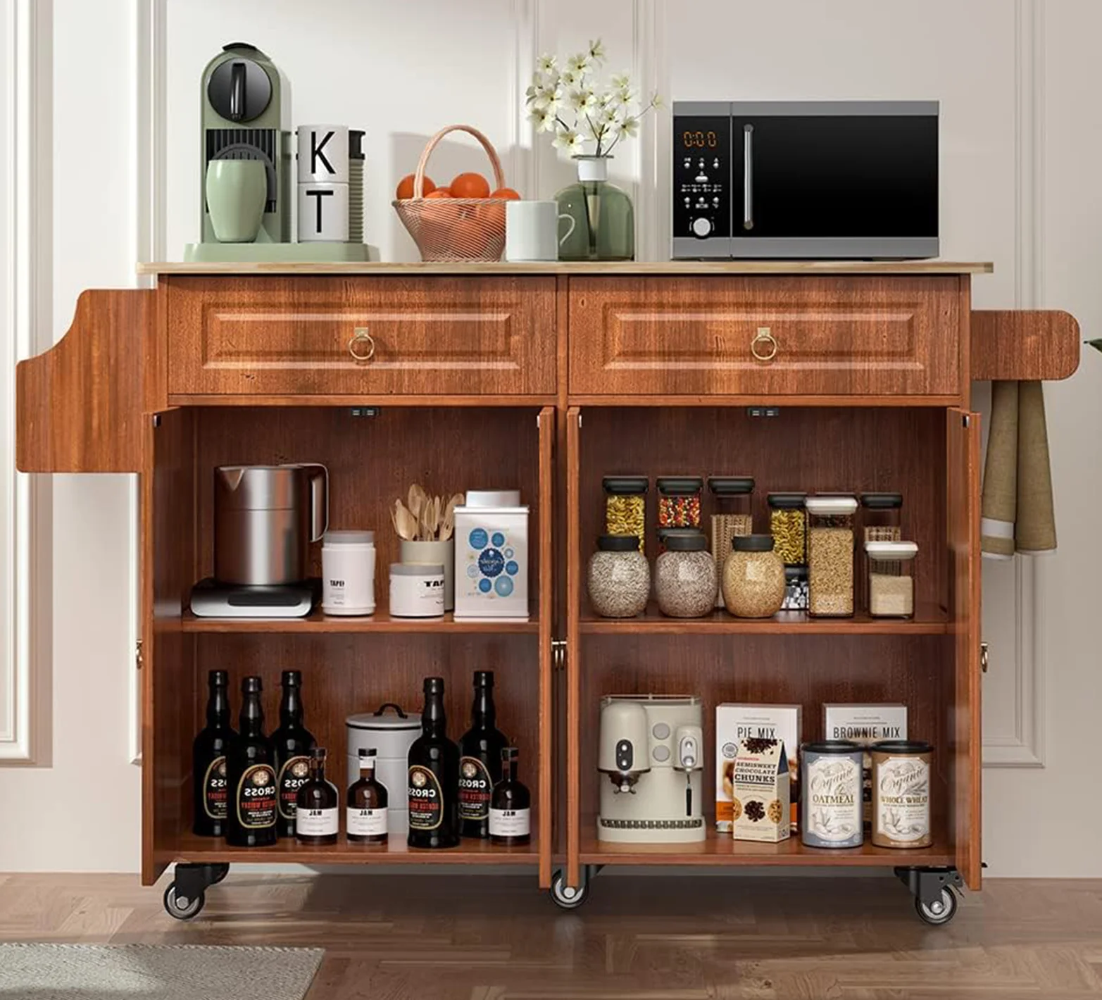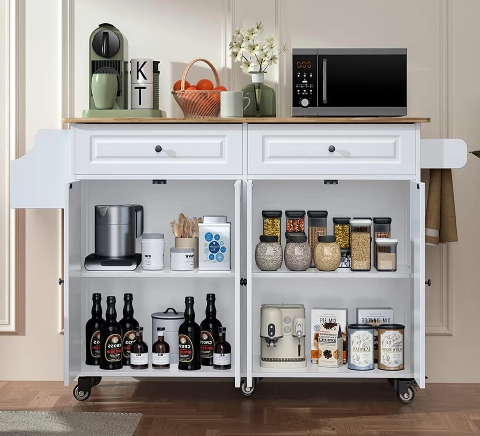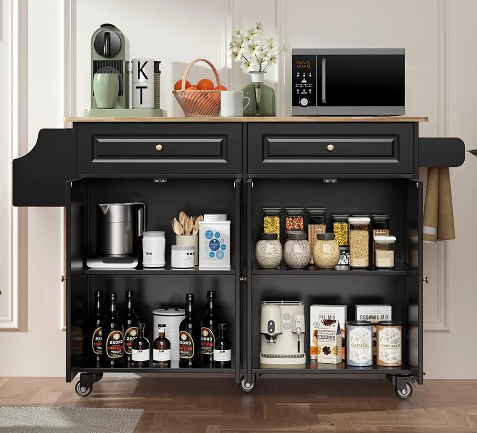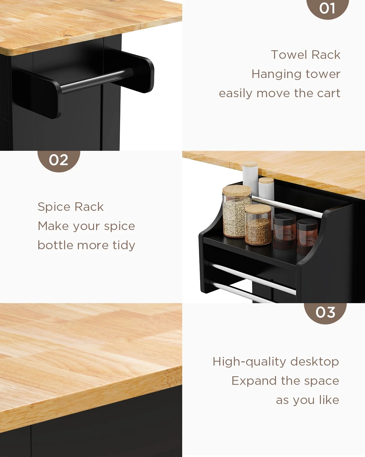 - ??��EXTRA-LARGE STORAGE KITCHEN ISLAND�� �C The Aiho Kitchen Island features 2 storage cabinets and 2 drawers for easy access, plus a towel rack and a spice storage area on the side. It provides ample space to store various kitchen tools and utensils, helping keep your kitchen and dining area neat and organized.