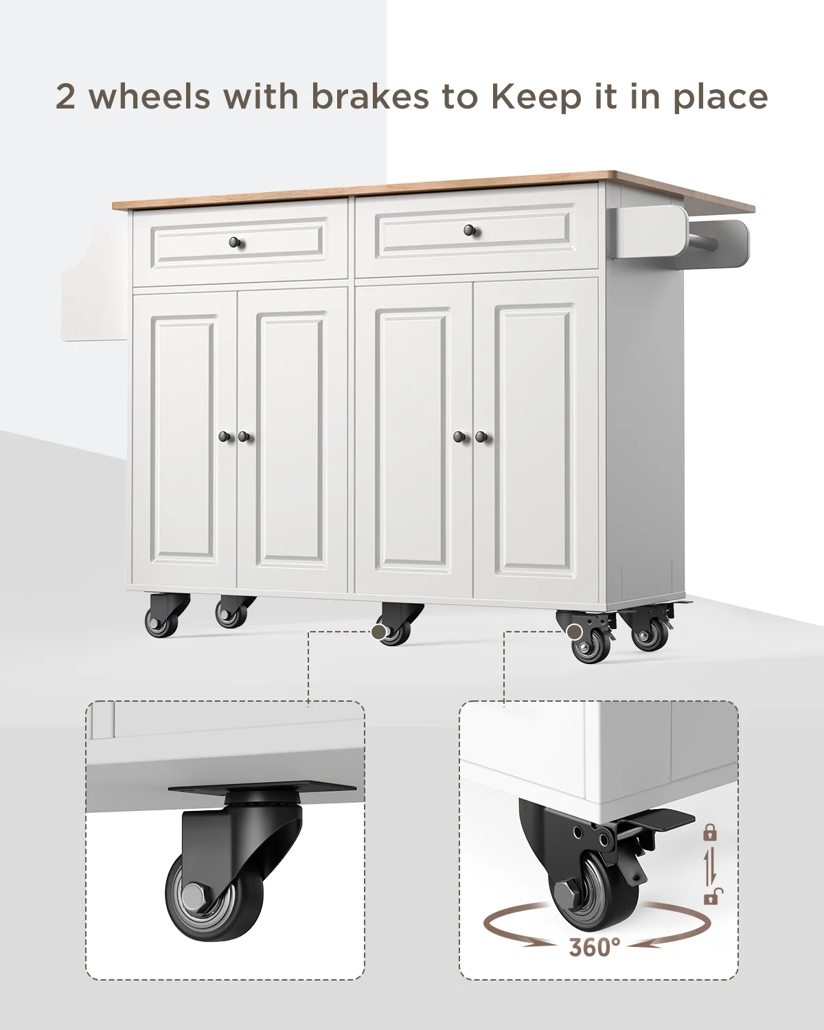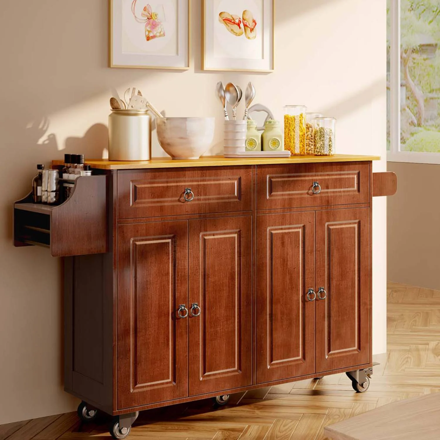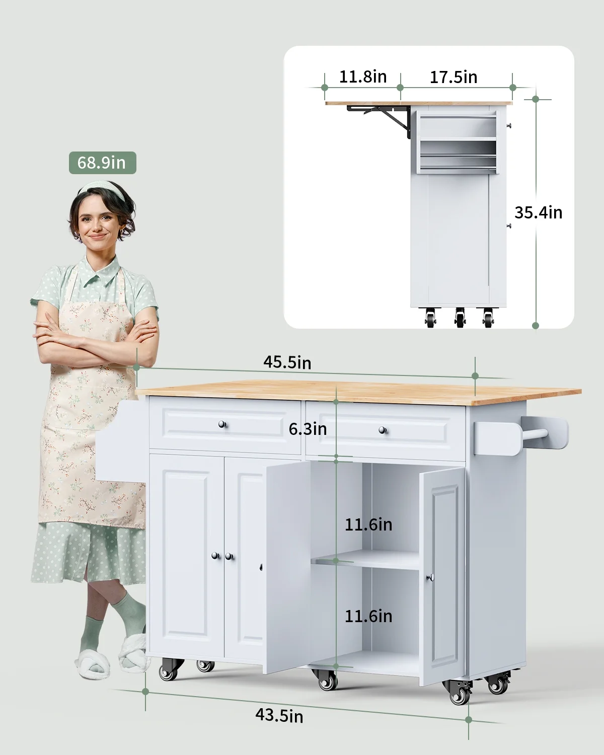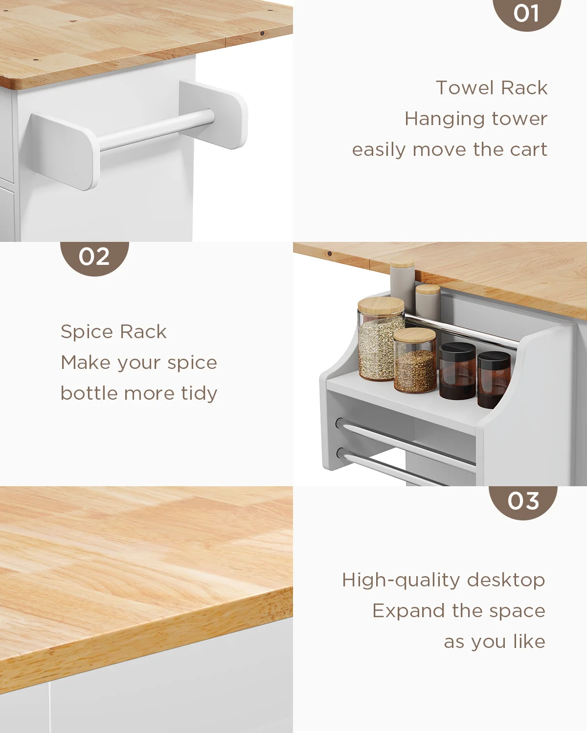The Aiho Mobile Kitchen Island Cart is designed to maximize storage and expand your kitchen space, keeping everything organized and meeting all your needs. This kitchen cart features a foldable design, with a 45-inch wide countertop that can be extended when in use. On each side, there��s a spice rack and a towel bar. The cart includes 2 storage cabinets and 2 drawers, made from high-quality, waterproof, and easy-to-clean wood. The smooth rolling wheels lock in place, making it ideal for smaller spaces. With its classic design and three color options, this kitchen cart complements any d��cor, enhancing your kitchen��s functionality and showcasing your style.