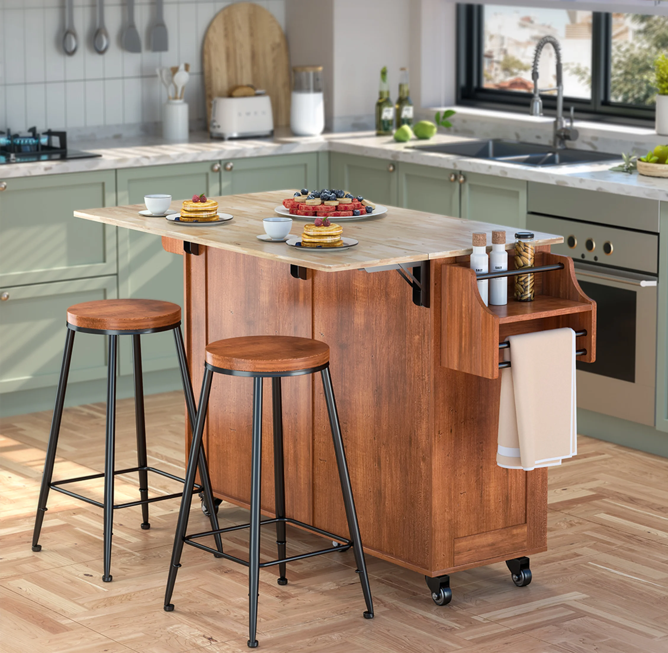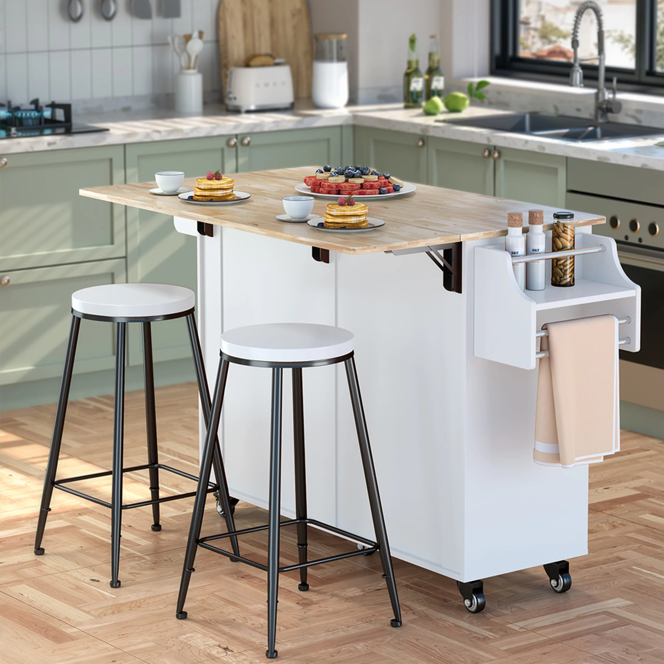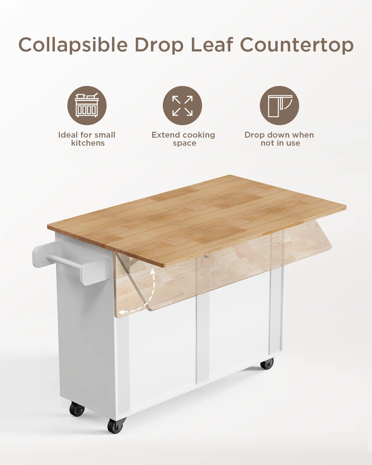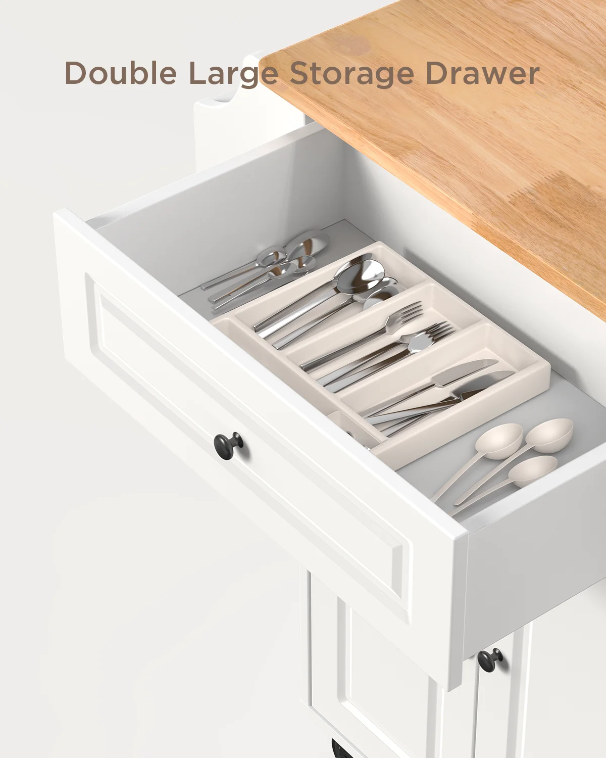 The Aiho Mobile Kitchen Island Cart is designed to maximize storage and expand your kitchen space, keeping everything organized and meeting all your needs. This kitchen cart features a foldable design, with a 45-inch wide countertop that can be extended when in use. On each side, there��s a spice rack and a towel bar. The cart includes 2 storage cabinets and 2 drawers, made from high-quality, waterproof, and easy-to-clean wood. The smooth rolling wheels lock in place, making it ideal for smaller spaces. With its classic design and three color options, this kitchen cart complements any d��cor, enhancing your kitchen��s functionality and showcasing your style.