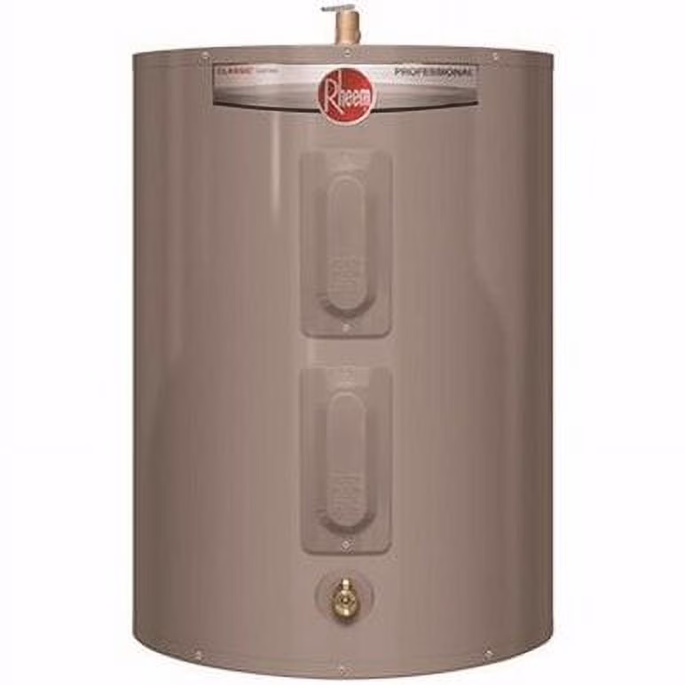 The Rheem Professional Classic 36 Gal. Electric short water heater provides an ample supply of hot water for households with 2 to 4 people. This unit comes with two 4500-Watt elements and an automatic thermostat which keeps the water at the desired temperature. A 240-Volt electrical connection is required for installation. A premium grade anode rod provides long-lasting tank protection. Factory installed temperature and pressure relief valve and 3/4 in. water connections are included with the water heater for easy installation. This model has a 6-year limited tank and parts warranty.
