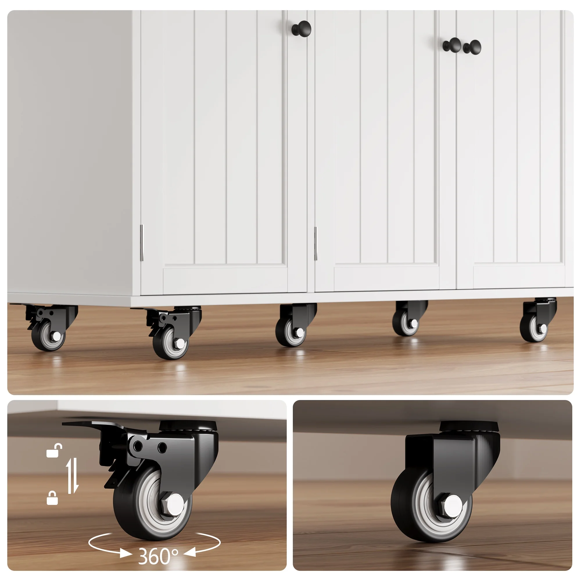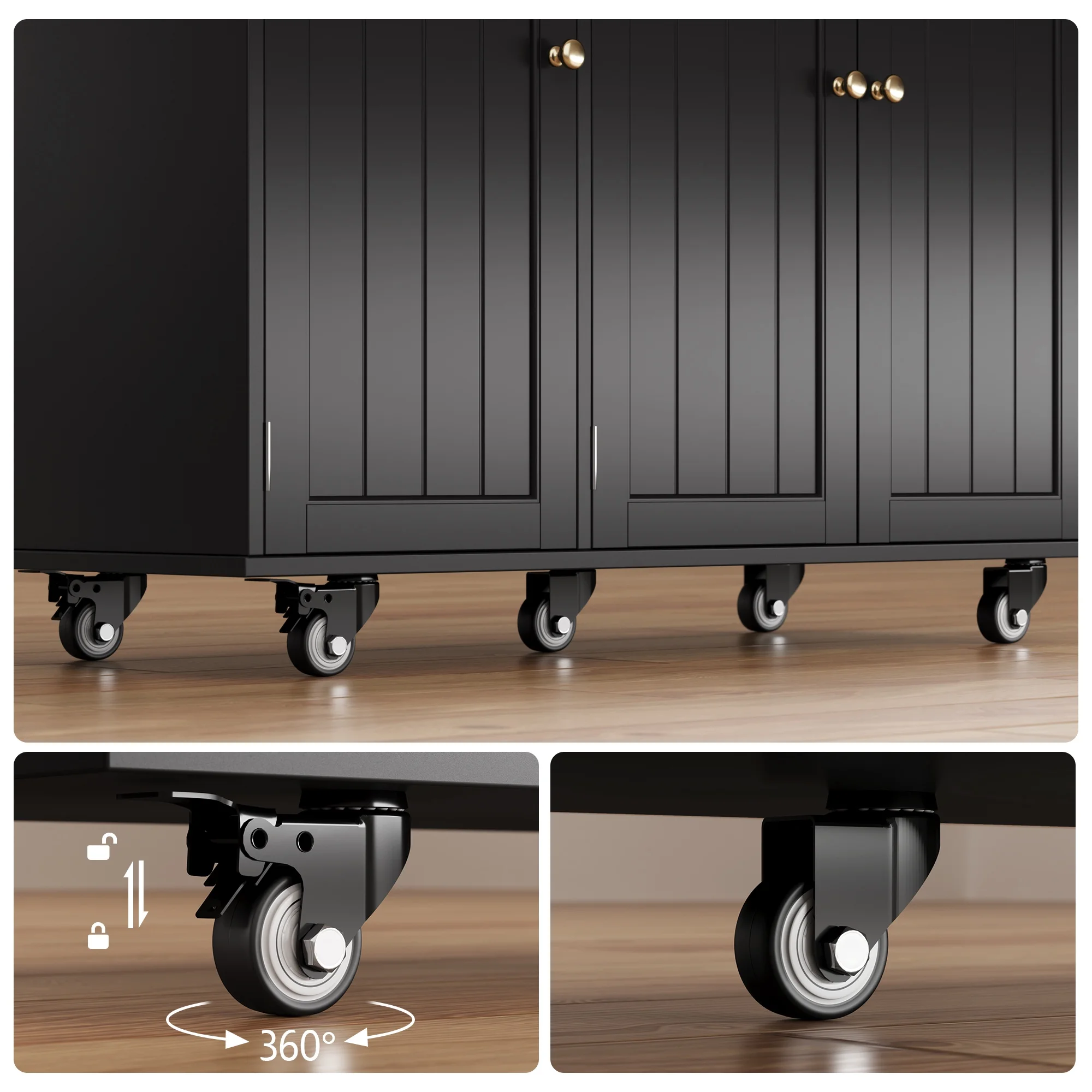 Built with high-quality materials, the portable islands table's structure is supported by 5 wheels (2 with brakes), ensuring it stays steady and easy to move. Back panel clips prevent wobbling.